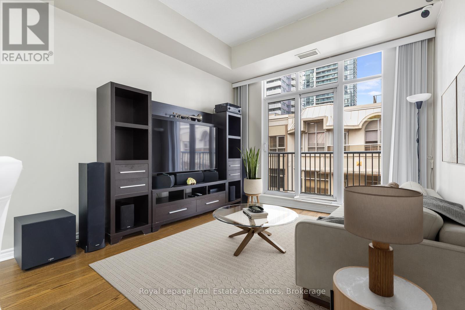 RARE & DESIRABLE ***Garden Villa*** TOP FLOOR SUITE WITH THE SAME LEVEL ENTRANCE DIRECTLY FROM PARKING &LOCKER! ***No stairs, no elevator to get home*** An Exceptional Opportunity in the Heart of Mississauga**Nestled just minutes from SquareOne, beautifully maintained ***KING SIZE BEDROOM***, 1-bathroom suite offers approximately 604 sq. ft. of thoughtfully designed livingspace. Private Garden Villa wing at 4090 Living Arts Drive, features an open-concept layout with **Soaring 10ft ceilings** & hardwood flrs, exudes a sense of spaciousness and natural light from the west view **Balcony** perfect for morning coffee or evening glass of wine. THE KING SIZE PRIMARY BEDROOM with double, mirrored closet & *Office Alcove with a view*, provides ample comfort, while the upgraded kitchen boasts granite countertops, ceramic flooring, a stylish backsplash, modern cabinetry and a brand new microwave. The kitchen overlooks a spacious and bright dining/living area with access to a direct summer sun balcony (11-2pm). Enjoy the tranquility of townhome-style living with the convenience of world-class condominium amenities just steps away. Additional highlights include: Scenic views from the balcony, overlooking the quiet interior courtyard. Residents enjoy access to a full range of 5-star amenities including a fitness centre, indoor pool, theatre room, party room, 24-hour concierge service, Sports Lounge consisting of ping-pong & billiard, bikestorage, guest suite and more. Renovated lobby and elevators with marble and brand new carpeting throughout hallways and corridors . Ideally located just steps from Celebration Square, City Hall, Square One Shopping Centre, transit, Library,YMCA, restaurants, nearby dog park, with easy access to major highways. This location is as convenient as it is desirable and provides all the downtown Mississauga has to offer. (id:64974)