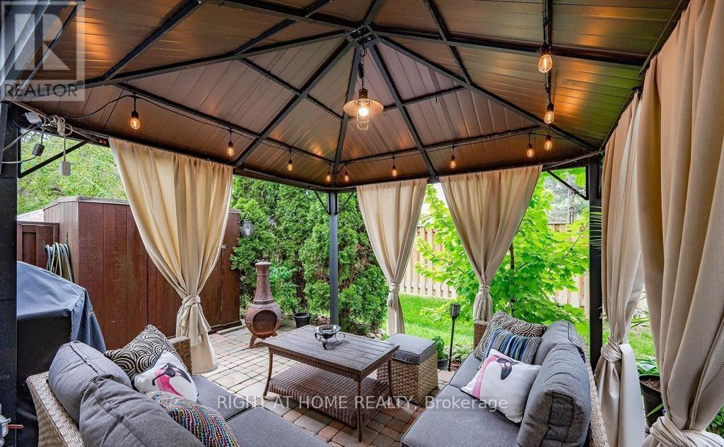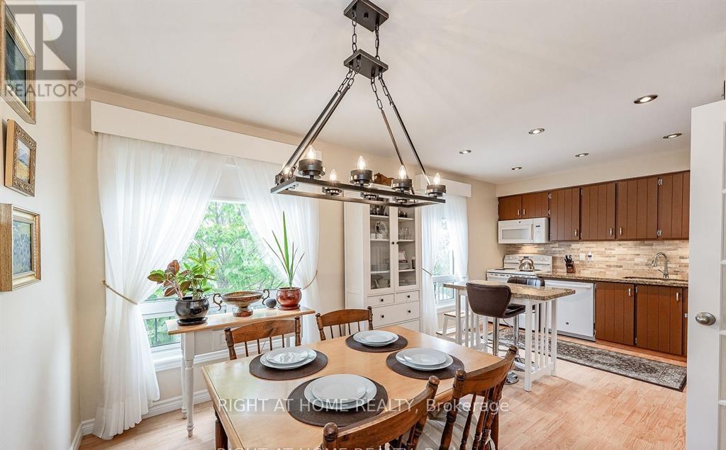 **Charming and Elegant Townhome in a Peaceful Cul-de-Sac**This beautiful townhome is tucked away in a quiet corner of the complex, backing onto the serene Hunter Greens Park. Upon entering, you'll be welcomed by a striking grand foyer and a stunning spiral staircase, setting an elegant tone throughout the home. The spacious, open layout is flooded with natural light thanks to large windows in every room. The sunny, eat-in kitchen makes cooking a delight, while the separate dining room is perfect for family meals or entertaining guests. The primary bedroom offers peaceful park views, a generous walk-in closet, and a convenient 2-piece ensuite. On the lower level, you'll find a cozy den with a walkout to your private back yard, excellent space for relaxation or hosting gatherings. The well-maintained complex also features a refreshing pool and park for residents to enjoy. With quick access to Highway 401 & 407, the GO train, top-rated schools, beautiful parks, and excellent shopping, this home offers both comfort and convenience. Electric Vehicle charger also recently installed in Garage! Don't miss out on this fantastic opportunity! (id:64974)