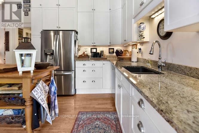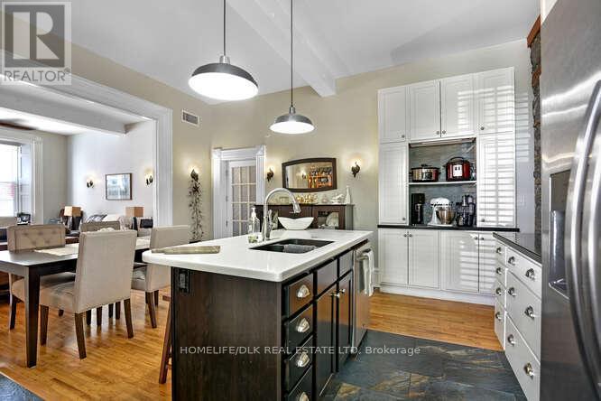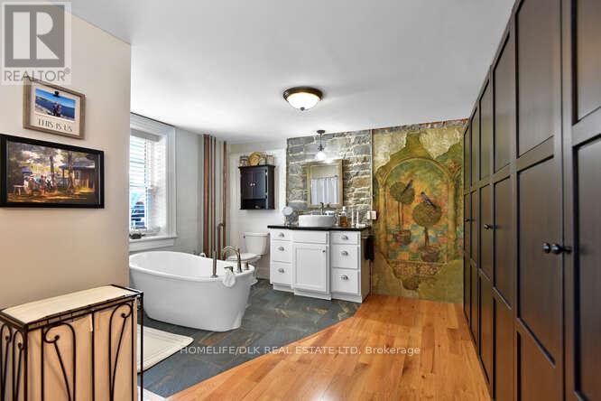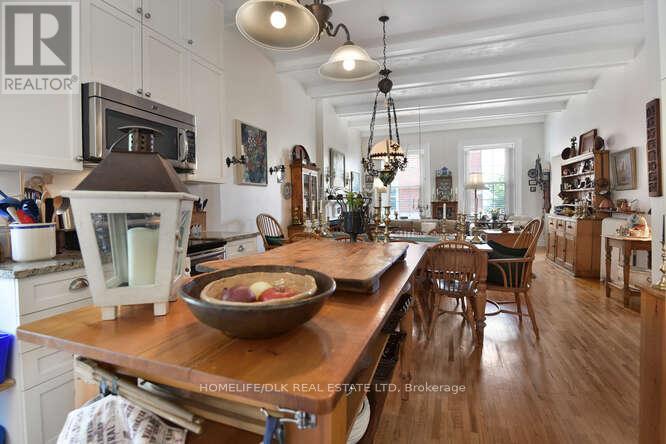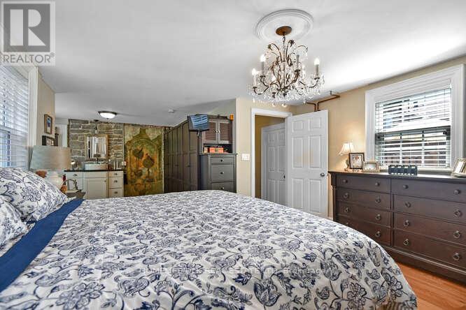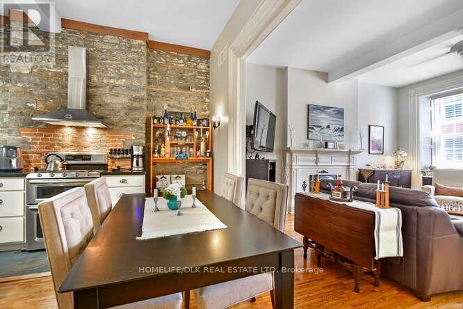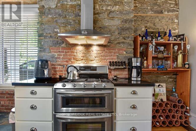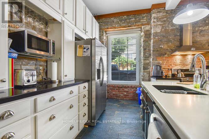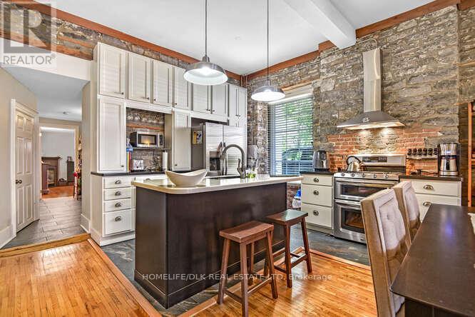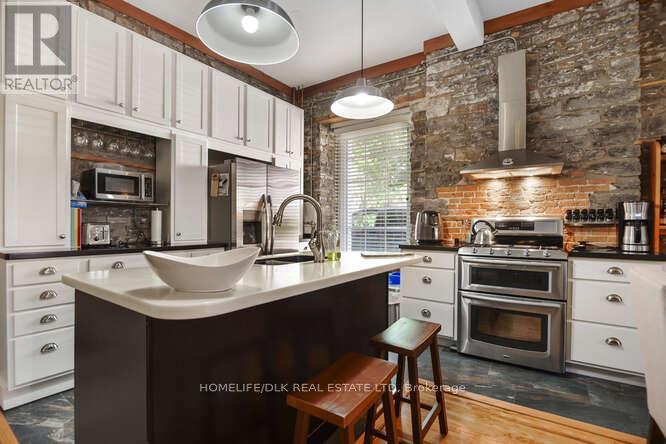 Welcome to 32 Apple St, Brockville. Duplex potential. This home is truly one of a kind and must be seen to be appreciated. This 1834 stone home, originally the John McMullen house has been lovingly restored in the past 10 yrs and features 3 distinct living spaces, perfect for generational families. The main level boasts hardwood & porcelain floors throughout. The open concept living room/dining room/kitchen are complete with Corian countertops, an abundance of cupboard space and beautifully accented by the exposed stone wall. The main level finishes off with the primary bedroom/4pc ensuite, an office, 2pc bath and m/f laundry. Upstairs you'll find a complete 2nd living space again with hardwood flooring, an open concept 2nd kitchen/living room/dining room, 2 more bedrooms a gorgeous 3pc bath with cultured marble in the shower. The 3rd level offers a perfect space for a kids play area or a craft room. The rear of the home has a beautifully completed studio inlaw suite., Flooring: Tile, Flooring: Hardwood (id:64974)