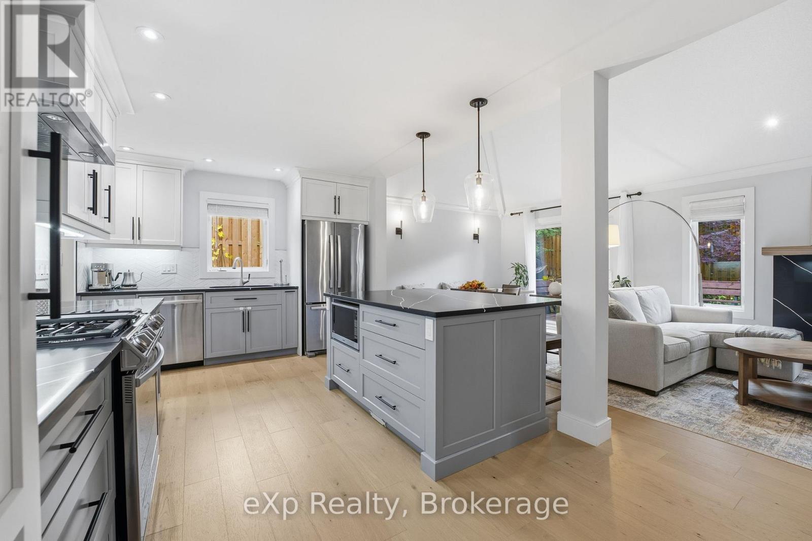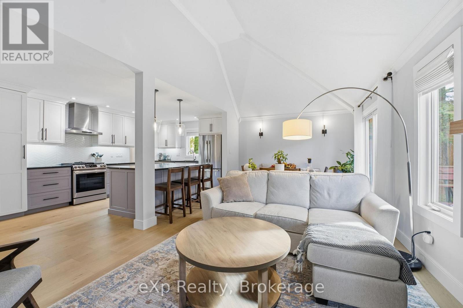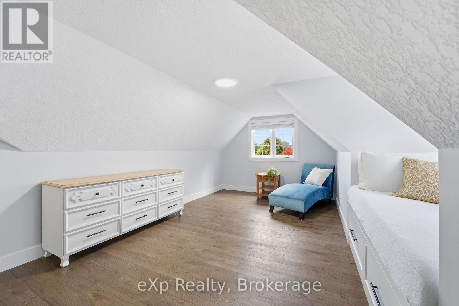 This elegant, fully upgraded raised bungaloft offers over 3,000 sq ft of finished living space, ideally situated on a quiet cul-de-sac in the desirable south end of Elora. Set on a private, mature lot with 108' of frontage and surrounded by established trees, this home delivers the perfect blend of comfort, space, and location.The open-concept main floor features a modern kitchen with quartz countertops, wide-plank engineered hardwood flooring, and elevated ceilings, all anchored by a cozy gas fireplace (2021). The main level includes three spacious bedrooms, highlighted by a stunning primary suite complete with a 5-piece ensuite, soaker tub, and heated floors.The fully finished lower level offers exceptional versatility with two additional bedrooms, a 3-piece bathroom with heated floors, and generous space for entertaining, a home gym, or family retreat.A bright and functional loft provides endless possibilities, ideal as a sixth bedroom, home office, playroom, or creative space. Professionally landscaped in 2024, the backyard features a lush lawn, a spacious deck (2023), elegant flagstone pathways, custom fencing, and natural stone steps leading toward the pedestrian bridge and downtown. All of this within walking distance to scenic trails, shops, and the charm of downtown Elora. (id:64974)