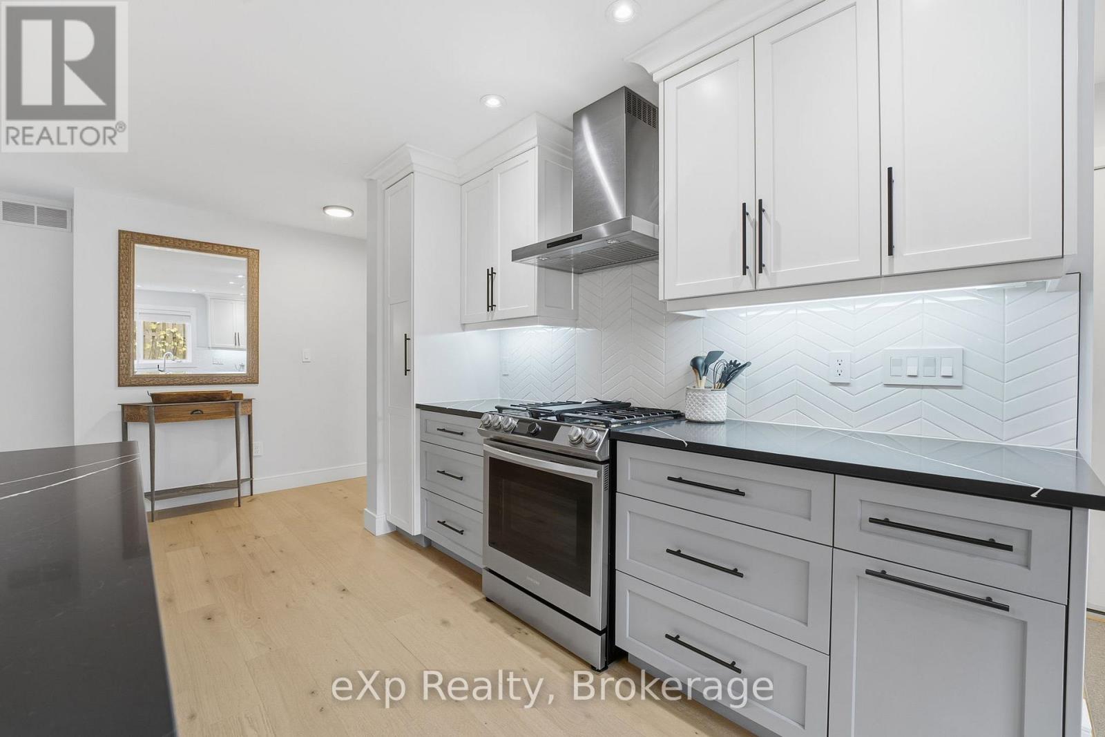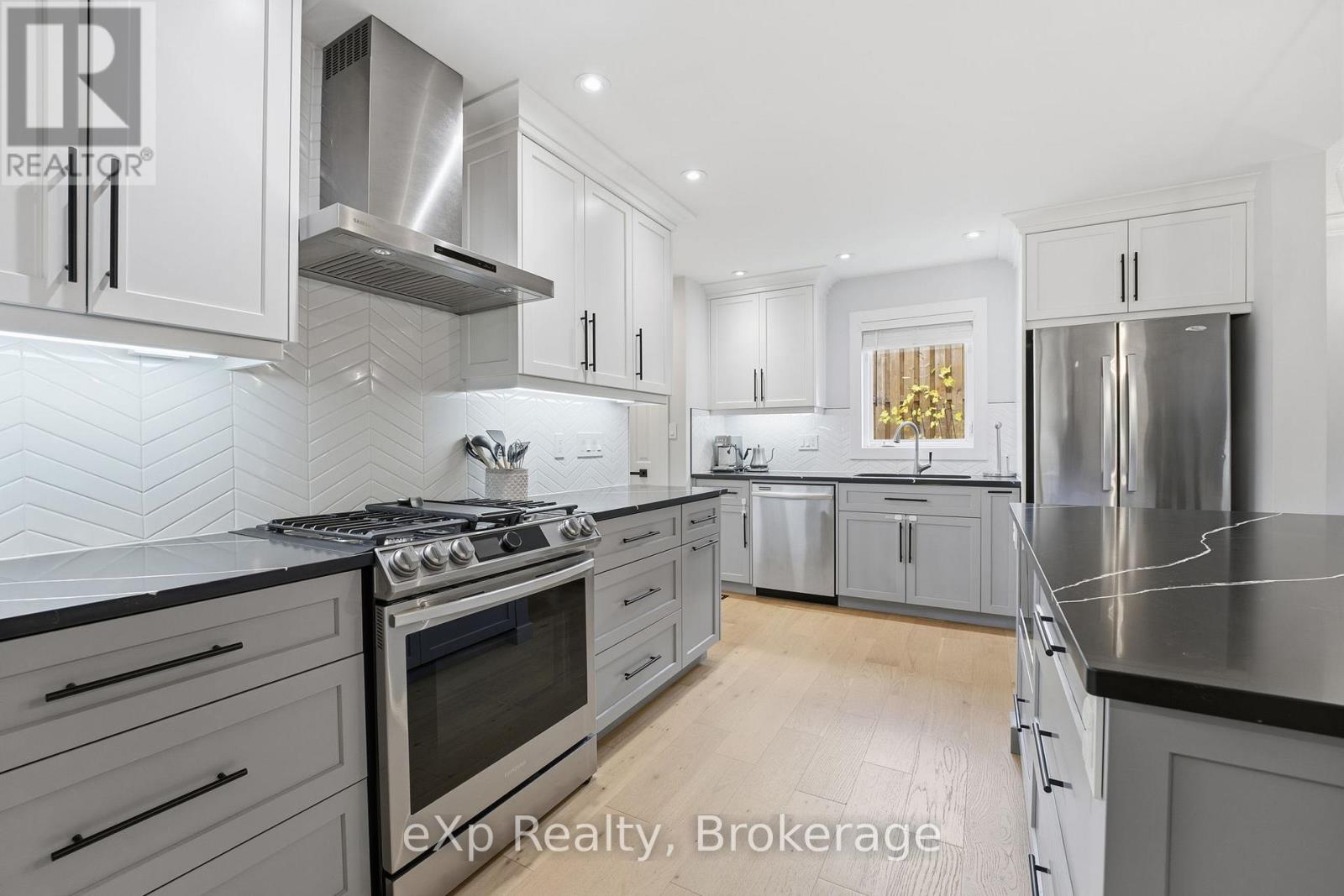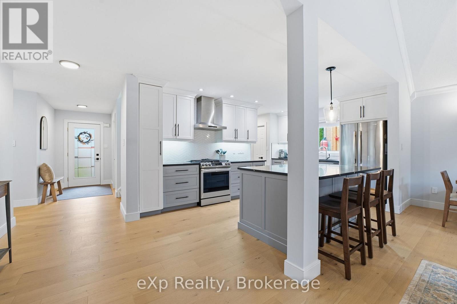 This elegant, fully upgraded raised bungaloft offers over 3,000 sq ft of finished living space, ideally situated on a quiet cul-de-sac in the desirable south end of Elora. Set on a private, mature lot with 108' of frontage and surrounded by established trees, this home delivers the perfect blend of comfort, space, and location.The open-concept main floor features a modern kitchen with quartz countertops, wide-plank engineered hardwood flooring, and elevated ceilings, all anchored by a cozy gas fireplace (2021). The main level includes three spacious bedrooms, highlighted by a stunning primary suite complete with a 5-piece ensuite, soaker tub, and heated floors.The fully finished lower level offers exceptional versatility with two additional bedrooms, a 3-piece bathroom with heated floors, and generous space for entertaining, a home gym, or family retreat.A bright and functional loft provides endless possibilities, ideal as a sixth bedroom, home office, playroom, or creative space. Professionally landscaped in 2024, the backyard features a lush lawn, a spacious deck (2023), elegant flagstone pathways, custom fencing, and natural stone steps leading toward the pedestrian bridge and downtown. All of this within walking distance to scenic trails, shops, and the charm of downtown Elora. (id:64974)