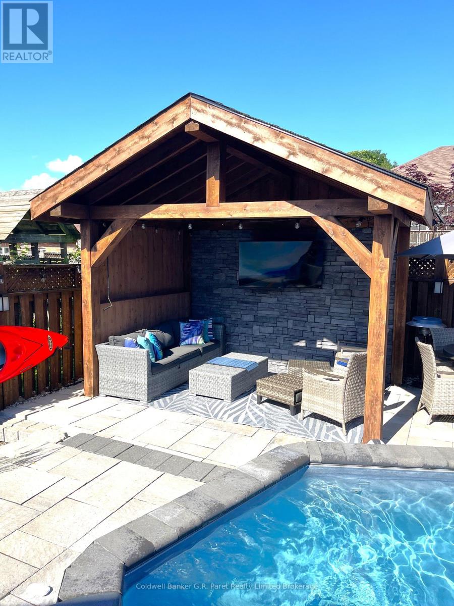 Welcome to paradise at 32 Macdonald Cres. This Meticulously well-kept and freshly updated home show cases one of the best back yard oasis' in the neighborhood featuring; a New Heated Pool, Multi-Level cement patio, small storage shed alongside a Hand crafted storage shed & white cedar Gazebo - featuring stone accent wall hydro and a Tv (All 2021). Pool Pump updated in 2025. As you Enter the Home you are greeted with a lovely ambiance with the abundance of natural light, open concept layout, and beautiful decor. Main Level Features; Formal Dining Area, Kitchen with Kitchenette & Breakfast bar and a walk out to your backyard oasis. Upstairs Features; 3 Generously sized Bedrooms with two- 4 piece bathrooms (Including the Master Bedroom En-suite). The lower level boasts an additional Bedroom alongside a large Great room with a natural gas fireplace. The Basement also features a separate Family room/Games room which could be converted into additional bedrooms, a workout room, office, or in-law suite. This Home has been extensively renovated including; New light fixtures & Premium vinyl flooring throughout, updated kitchen cupboards, Finished Lower Basement & Laundry room, as well as the majority of windows. The Double wide Garage is a handy mans dream with an ample amount of storage cabinets with lighting, work bench, storage lockers (for sports equipment and gardening tools) and most importantly an accent wall with Tv. You will absolutely love the quiet neighborhood with one of the most sought after school districts in Brantford, with an amazing property to entertain your guests and spoil your growing family. This is a very rare opportunity you don't want to miss. (id:64974)