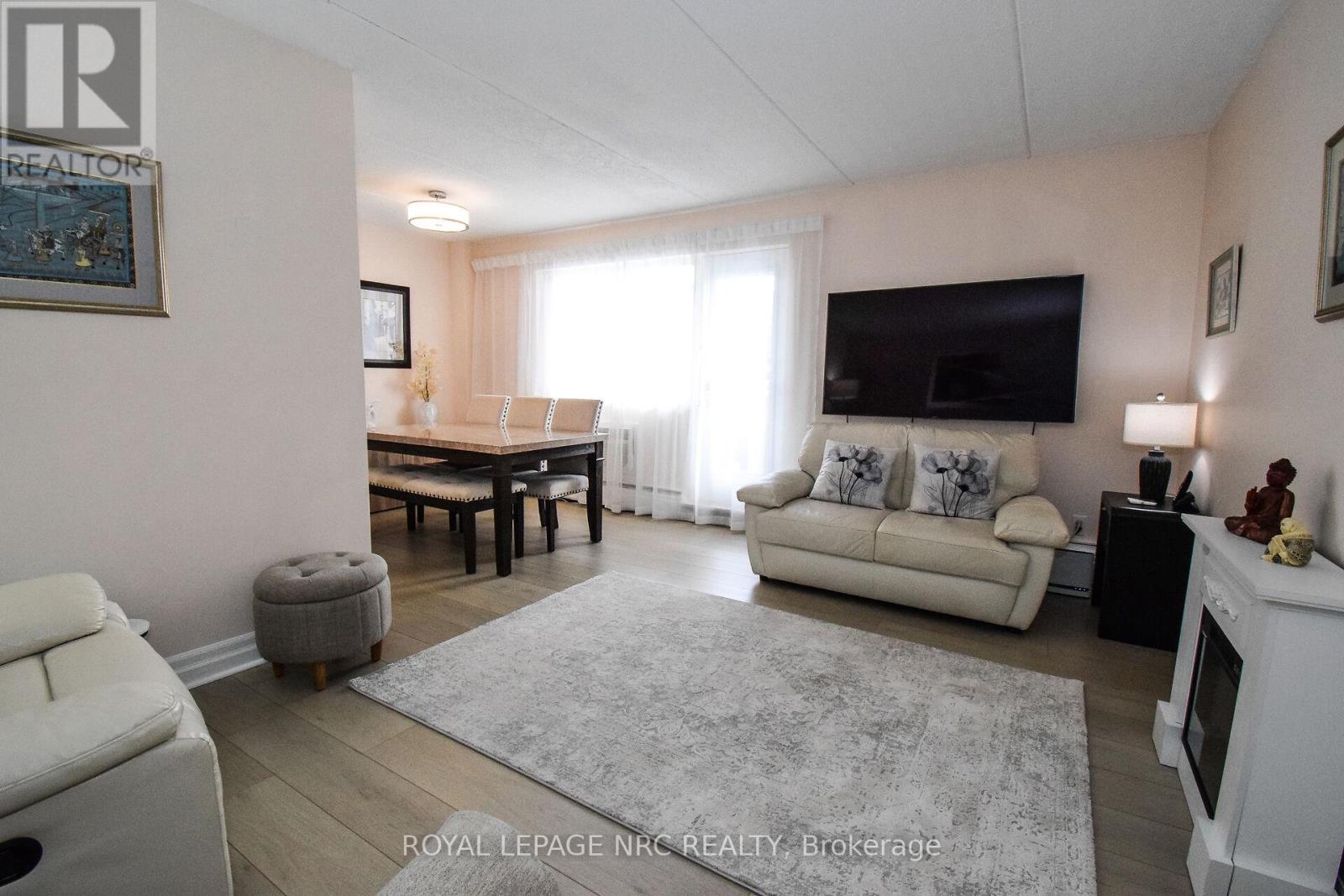 This beautiful and well-cared-for two-bedroom condo is located on the third floor in the desirable north end of St. Catharines. The unit features laminate flooring (2023) in the hallway, dining room, and living room; ceramic tile in the bathroom and kitchen (backsplash and countertop 2024, stove 2019), and carpet in both bedrooms. Through-the-wall air conditioning (2020) and thermostat to control your own heating adds comfort.The primary bedroom offers a walk-in closet, while the second bedroom includes a fixed wardrobe closet and can also be used as a home office. A pantry is located next to the kitchen, and the electrical panel was updated in July 2018. One pet up to 22 lbs is permitted.Condo fees include heat, hydro, water, Bell Fibe TV, parking, locker, building insurance, and exterior maintenance. Amenities include an outdoor saltwater pool, fitness room, sauna, party room, bike storage, and ample visitor parking. Conveniently situated with bus stop out front, near shopping, highway access, parks, restaurants, public transit, schools, and churches, with ample visitor parking available. (id:64974)