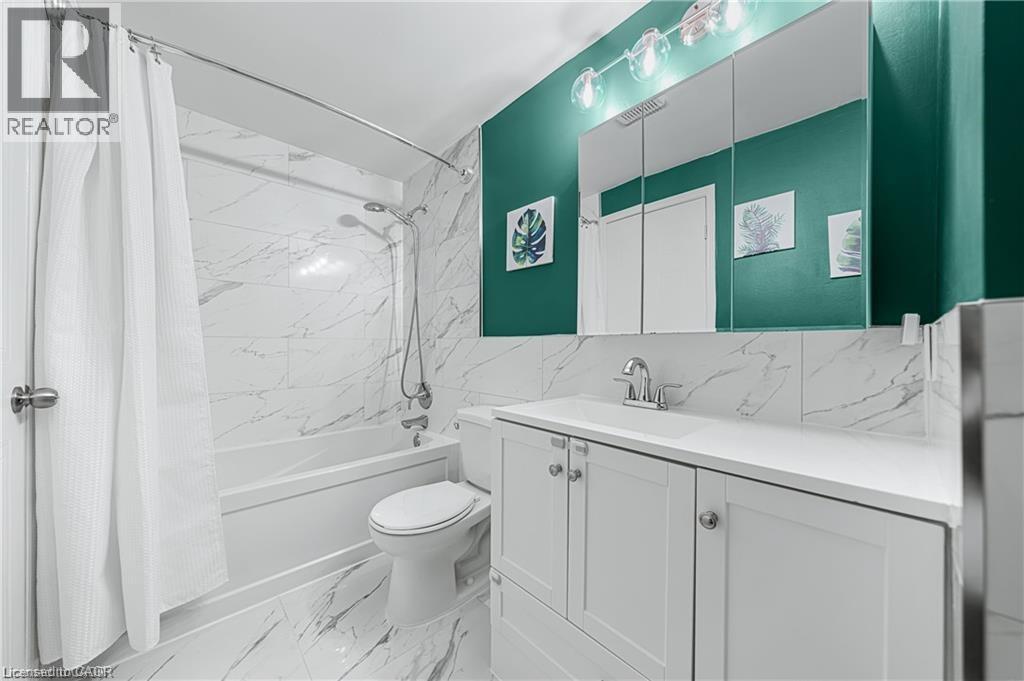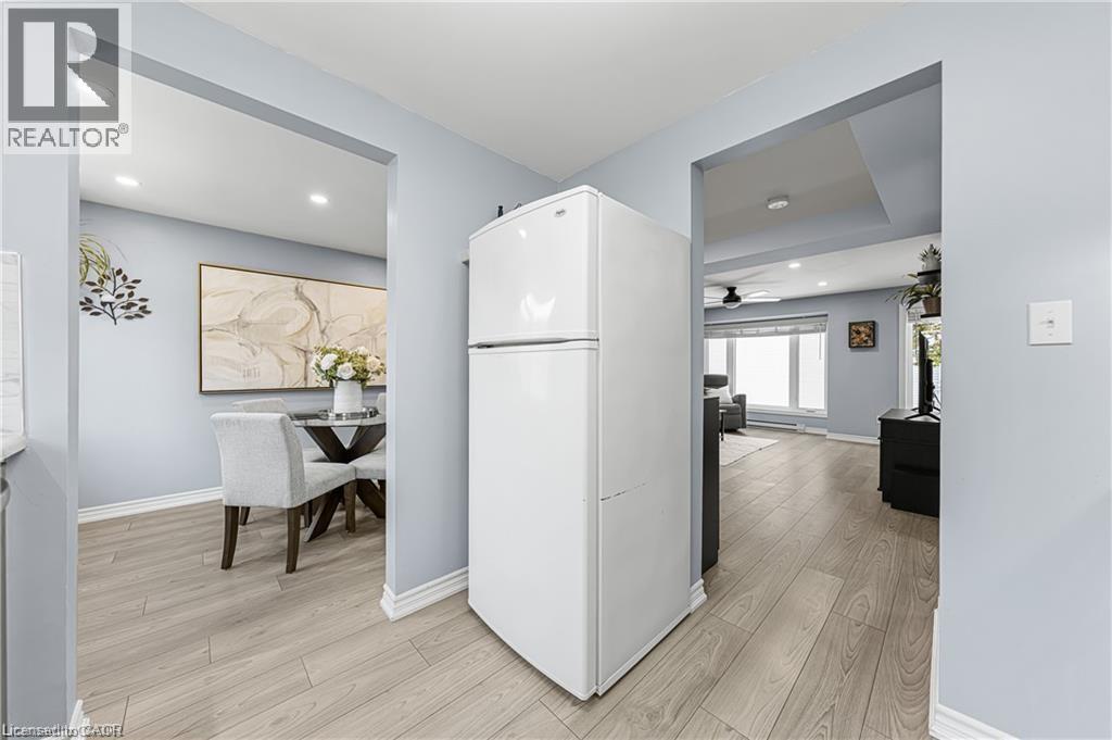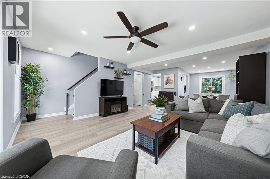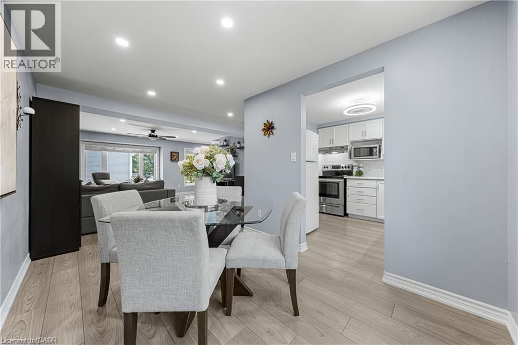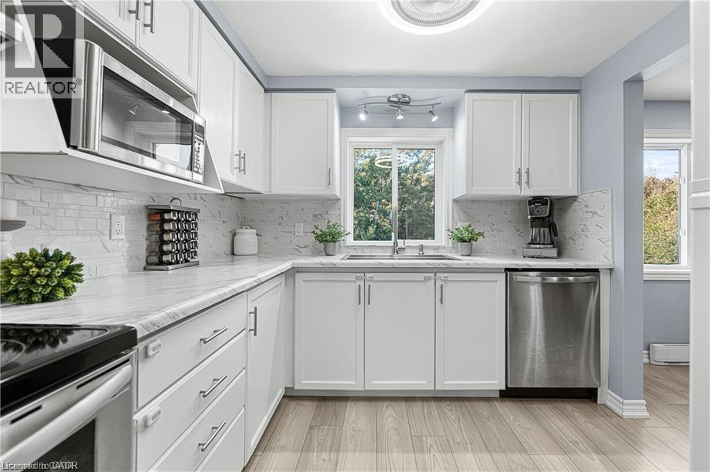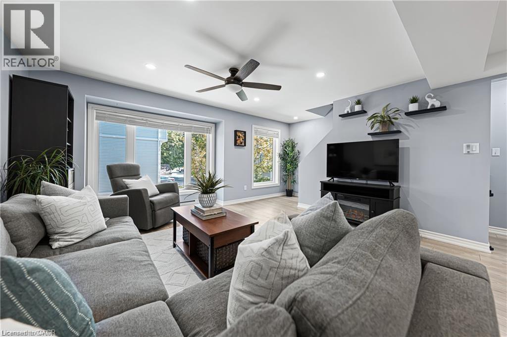 Stylish and spacious 3-storey townhome condo backing onto greenspace! With two incredibly generous bedrooms, modern updates, and a functional layout, this home is ideal for anyone looking for comfort and convenience out of the big city setting. Enter into the foyer on main floor which offers convenient under stair coat closet, a versatile den, perfect for working from home, renovated 2-piece bathroom (2025), laundry area, single car garage access, and direct walk-out to your newer deck (2023) with serene view backing onto Green space. On the second floor, enjoy a bright kitchen with newer countertops and backsplash (2023), and the open-concept living and dining areas with smooth ceilings and pot-lighting that brightens the entertaining area. Upstairs, you’ll find two exceptionally spacious bedrooms; featuring a wall-to-wall closet and the other with a walk-in closet, a fully renovated 4-piece bathroom (2023) featuring a new tub, and vanity with medicine cabinet mirror. Additional thoughtful updates include new lighting, storage solutions, and custom retractable blinds that add a polished touch throughout the majority of the home. Location highlights include quick access to the University of Guelph, local trails, and the nearby conservation area for hiking and canoeing. Daily essentials are minutes away with grocery stores and restaurants in walking distance, while weekend escapes are easy with Downtown Guelph, and 401 access just 15 minutes away and destinations like Elora Mill Spa within half an hour. This home combines thoughtful upgrades, a functional layout, and a fantastic location — ready for its next owner to enjoy. (id:64974)