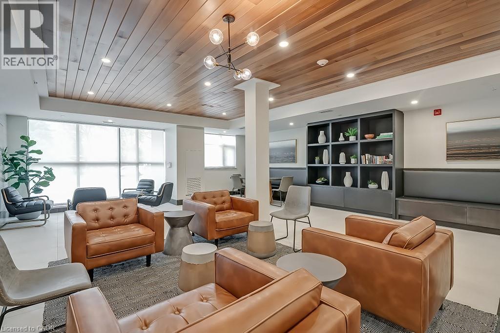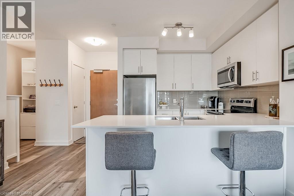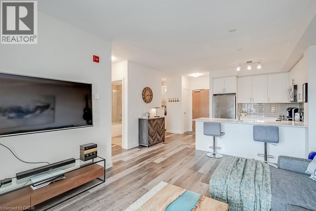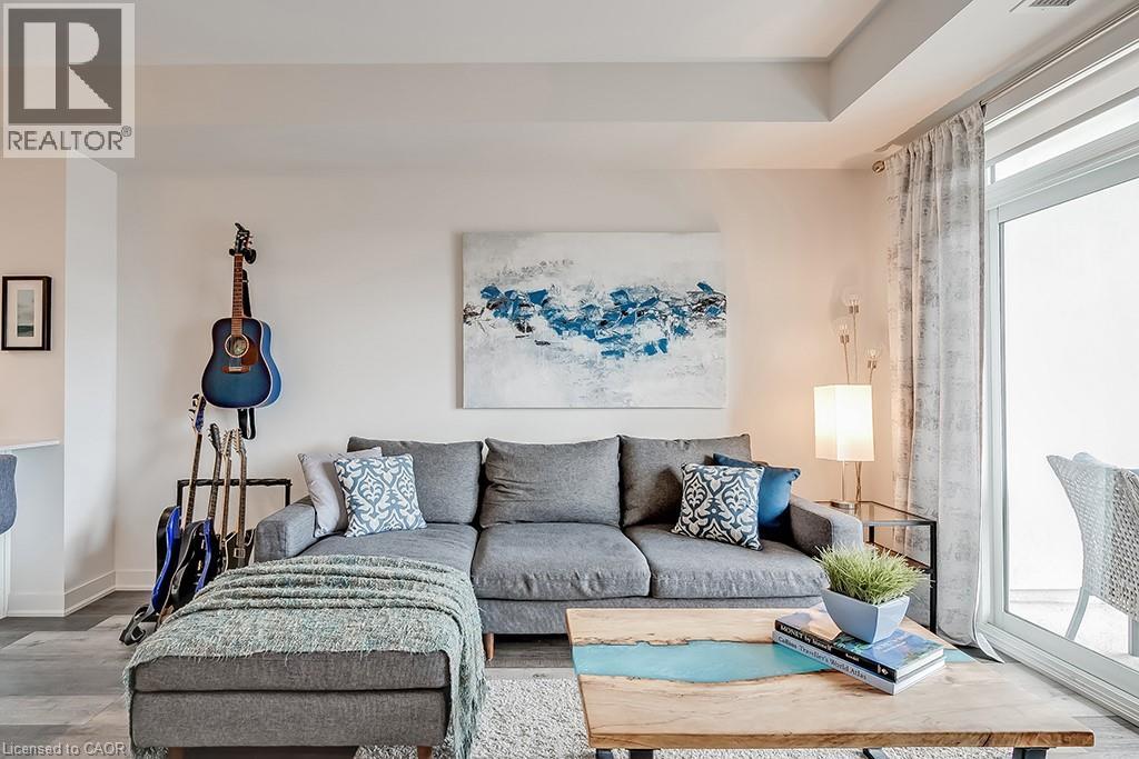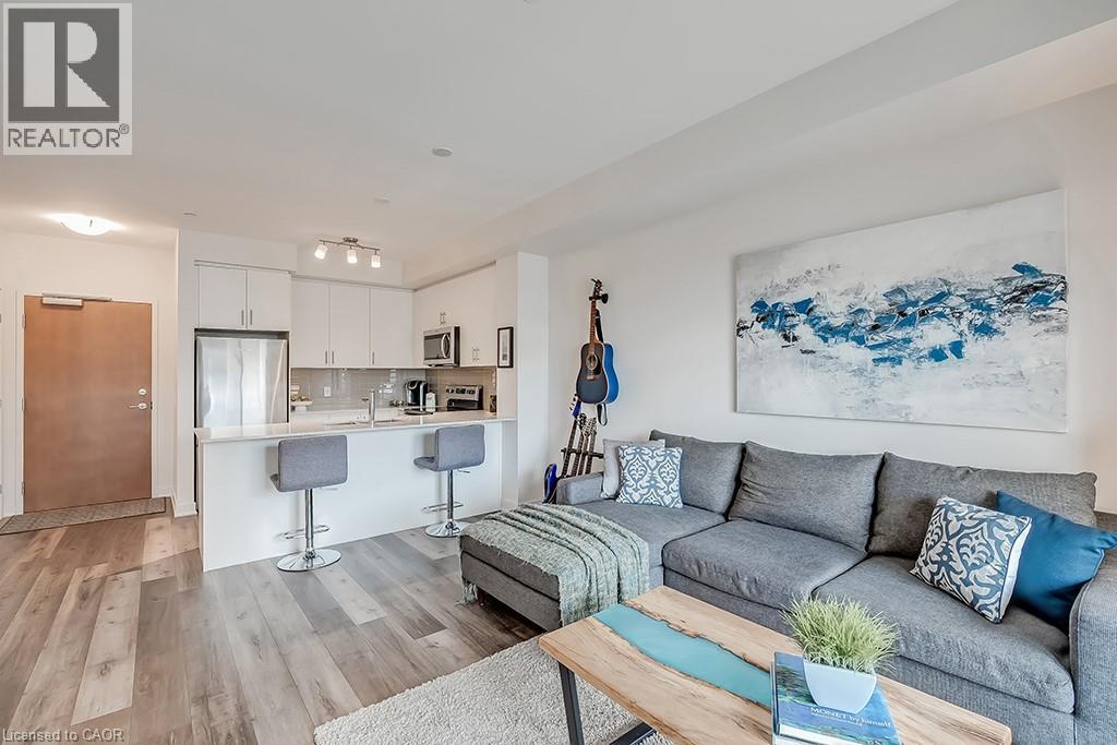 Stunning one bedroom + den suite at Affinity in Aldershot! Custom kitchen with quartz, stainless steel appliances, breakfast bar and glass subway tile backsplash. Open concept living with 9' ceilings, in-suite laundry, 4-piece bathroom and spacious private balcony. Steps to the GO station, RBG, marina, library, schools and Burlington Golf & Country Club. One underground parking space and one storage locker on unit level. Building amenities include loads of visitor parking, electric car charging station, rooftop terrace with BBQs, gym, yoga room and party room! (id:64974)