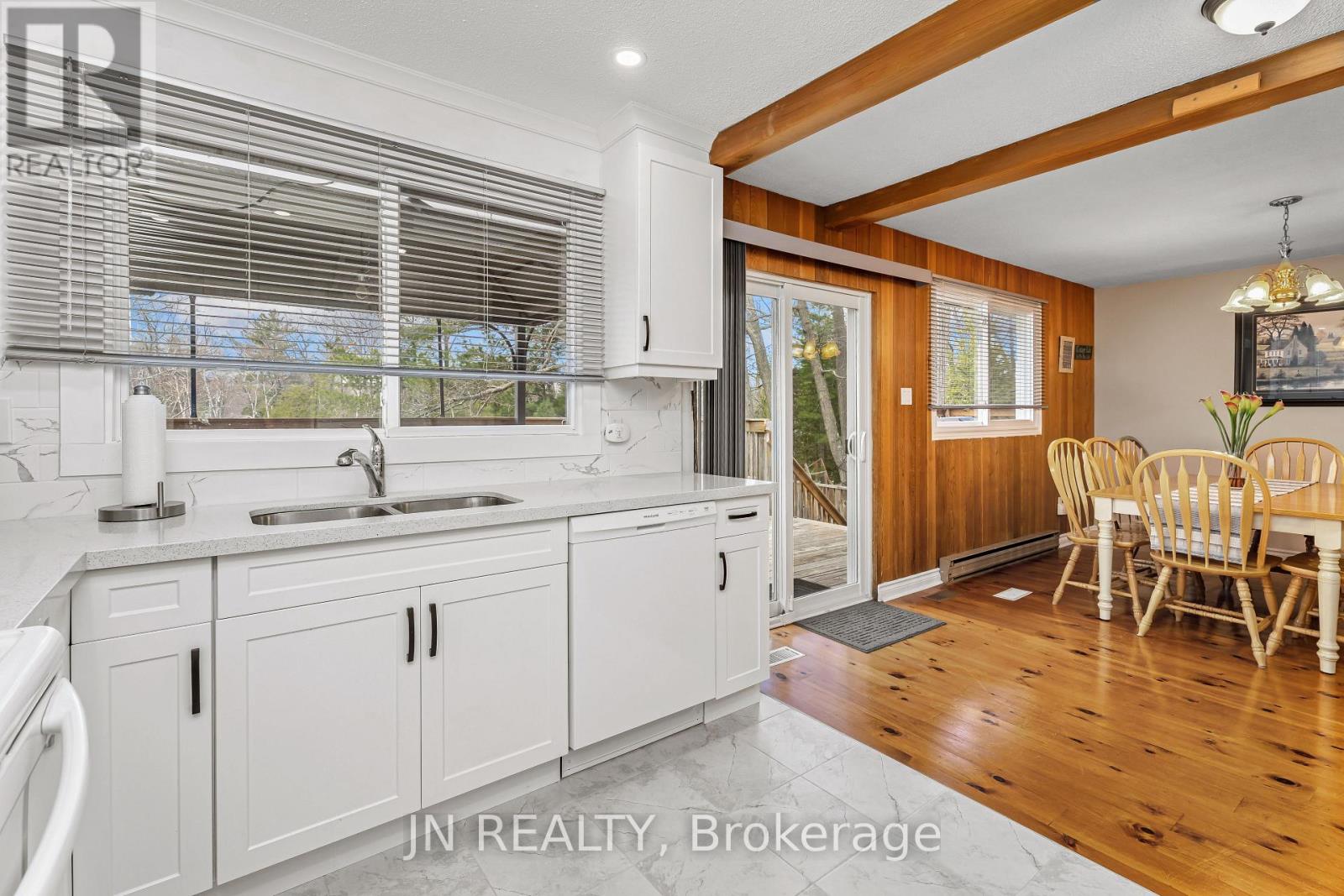 Turn key, FULLY FURNISHED, year-round, waterfront raised bungalow, just in time for summer! Grill and chill under the gazebo on the walkout deck or by the fireside on the lower patio, or take a ride down the Nottawasaga River in the 12' motorboat or paddleboat (both boats included). Pride of ownership is evident throughout the property! New kitchen ('22) with beautiful quartz countertops, quartz bathroom vanities ('22), updated windows and sliding door ('21), and hardwood throughout the main floor. Fully furnished bedrooms including custom-built bunk beds with double mattresses! Finished walkout basement featuring both a private and shared side entrance, gas fireplace, full bathroom, large common room, and potential kitchen to host visitors and guests. Oversized single car garage with opener to accommodate ATV's & snowmobiles. Blocks away from Wasaga's main beaches, attractions, and downtown core, this home is a perfect mix of serenity and excitement! (id:64974)