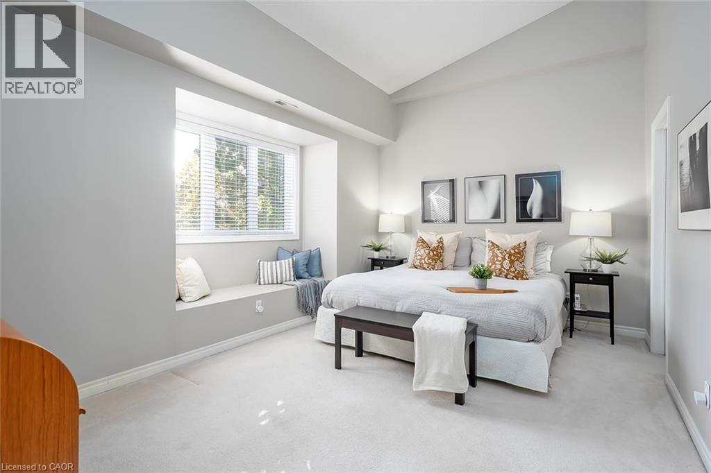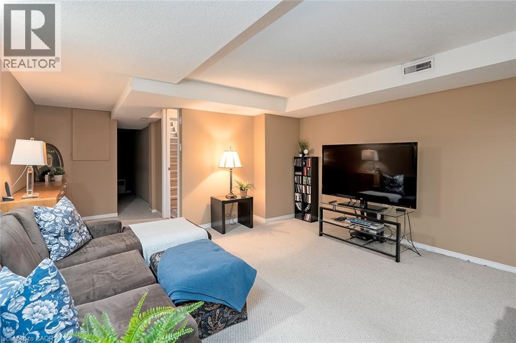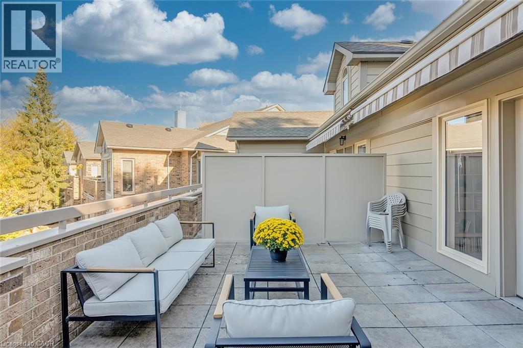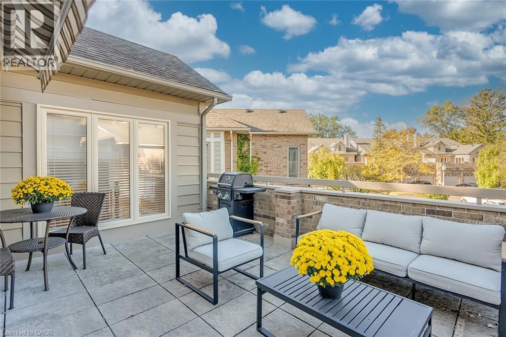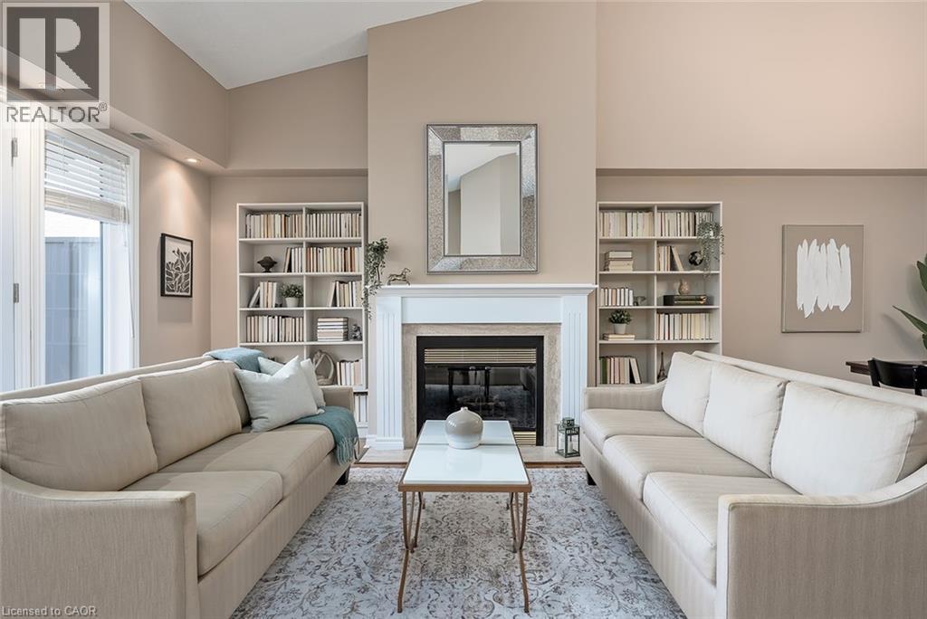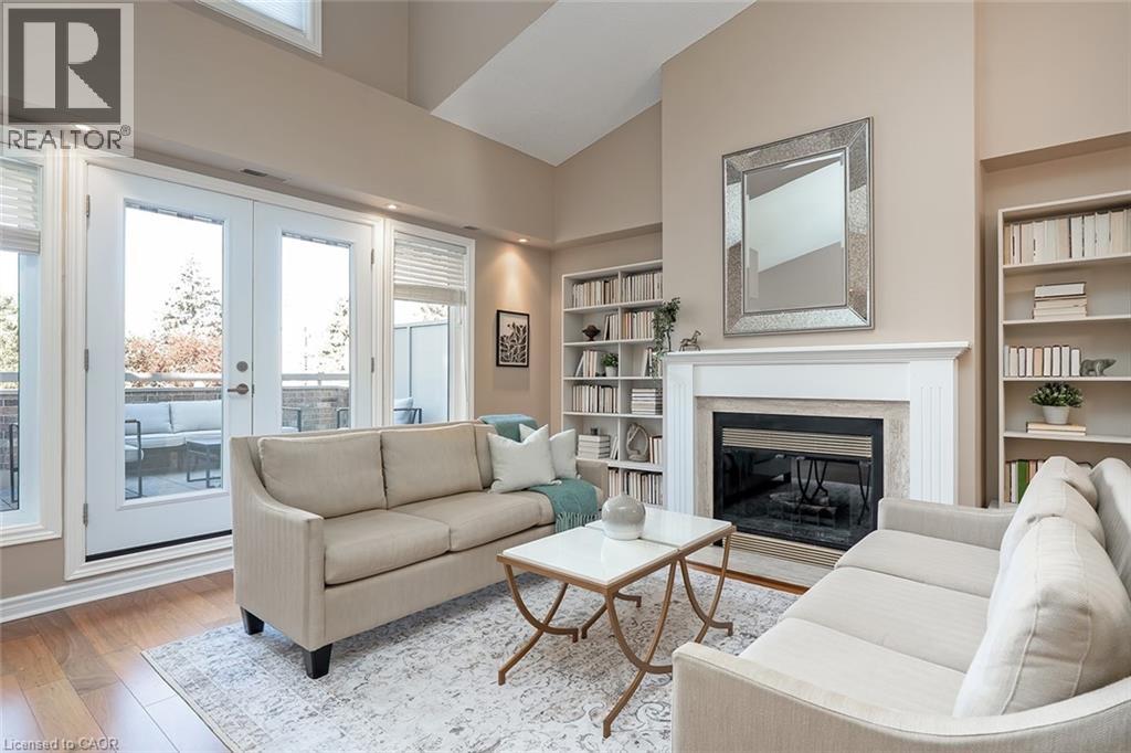 Welcome to The Terraces, a prestigious and seldom-offered enclave nestled in one of Burlington’s most desirable neighbourhoods; Roseland. This bright end-unit townhome offers just over 1,900 sq. ft. of beautifully finished living space, featuring 2 bedrooms, 2 bathrooms, and an open-concept layout that blends comfort with timeless style. The spacious living and dining room is filled with natural light and highlighted by soaring vaulted ceilings, rich walnut flooring, and a cozy gas fireplace. French doors lead to your private terrace with an awning — an ideal spot to unwind outdoors, whether enjoying a quiet morning or a peaceful evening. The cheerful kitchen provides ample counter space and storage, while the main-floor primary suite is a true retreat with a 4-piece ensuite and generous his-and-hers closets. A second bedroom with a walk-in closet offers flexible space for guests or a home office, with convenient access to the main 3-piece bath. Main floor laundry further enhances the ease of everyday living. Downstairs, the fully finished basement adds valuable bonus space with a recreation room, den, and rough-in for an additional bathroom. Inside entry from the attached garage and plenty of visitor parking complete the package. With snow removal right to your door, landscaping, and exterior maintenance all taken care of, this home offers the ultimate in worry-free living — perfect for those seeking a simplified lifestyle without giving up space or quality. Ideally located close to downtown Burlington, the waterfront, parks and trails, shopping, and highway access, this immaculate home delivers exceptional comfort, convenience, and community in an unbeatable Roseland setting. (id:64974)