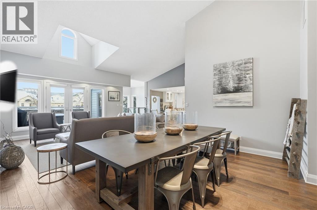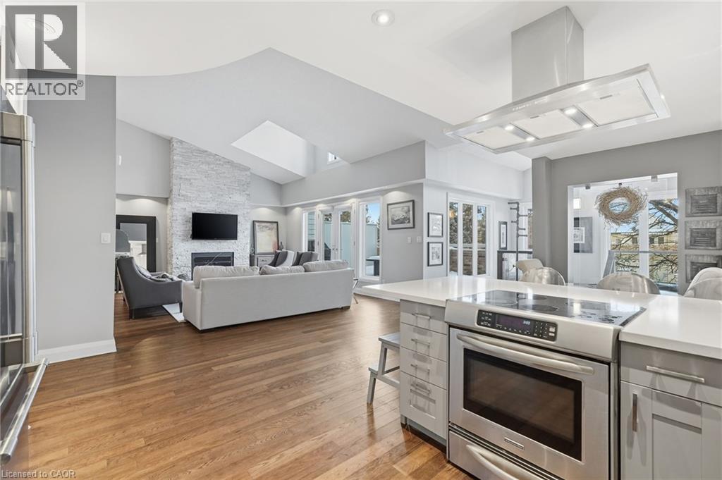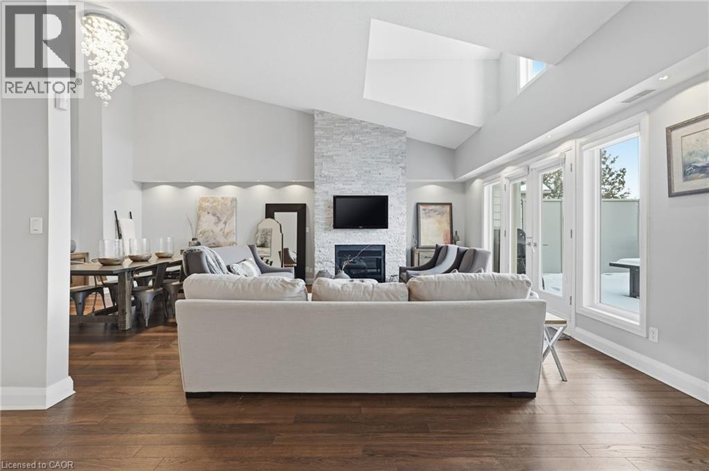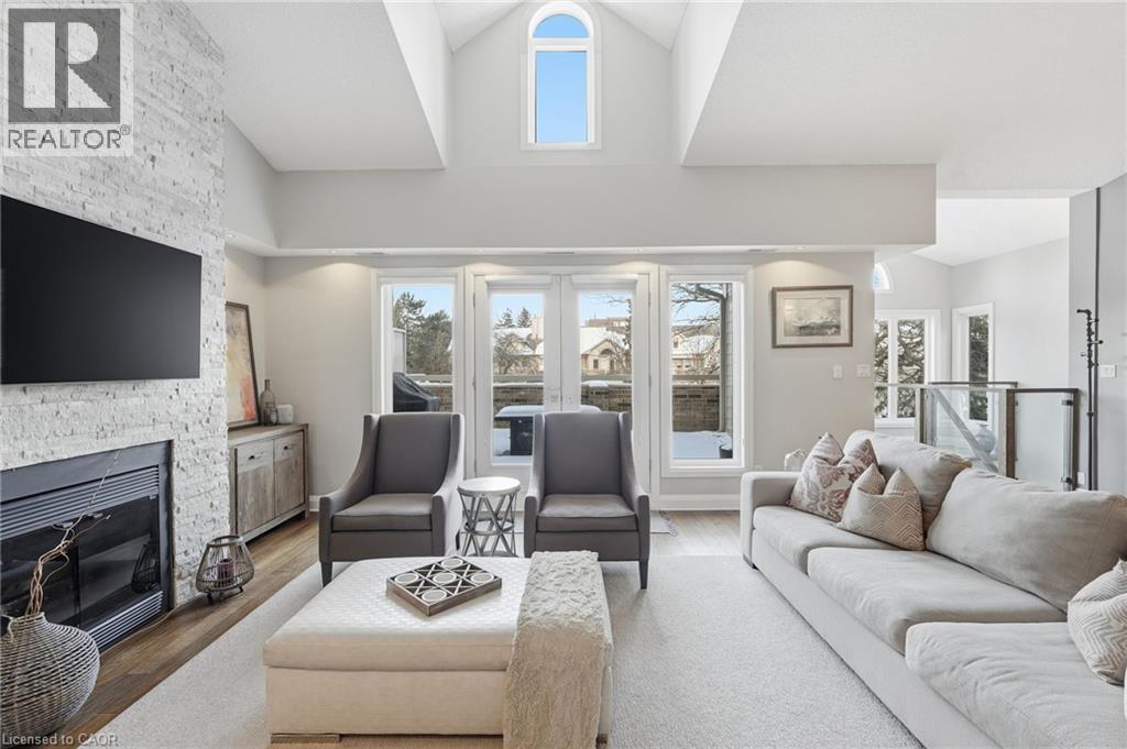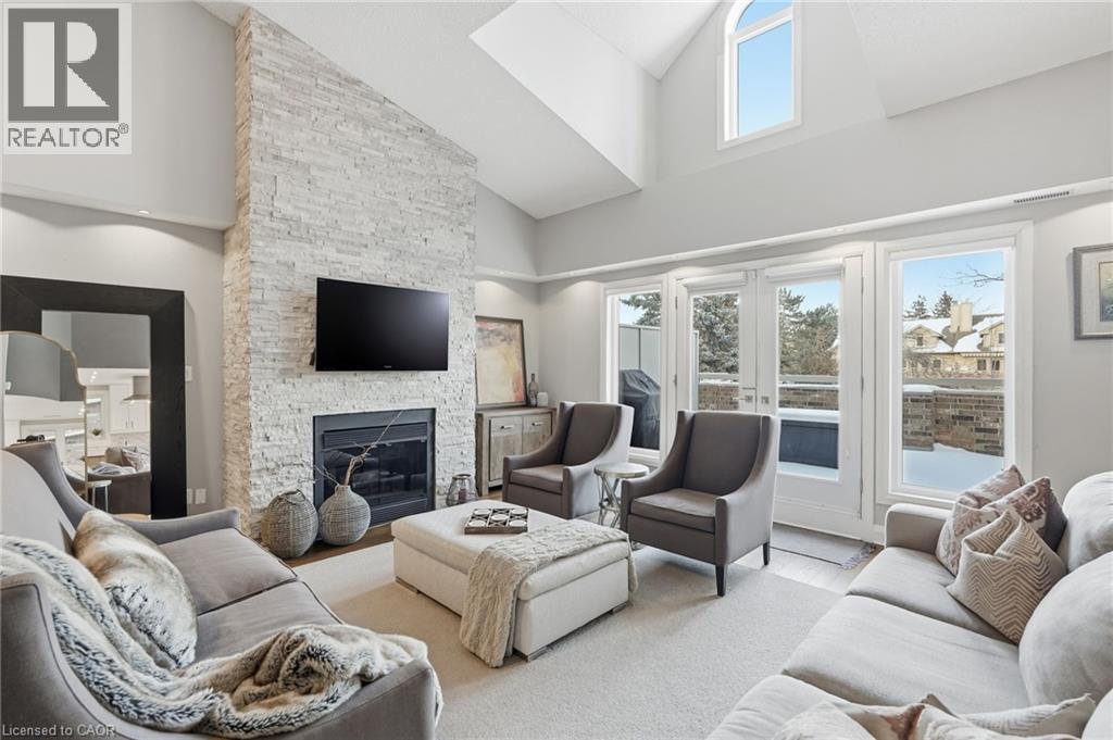 Step inside this exceptional executive townhome at The Terraces on New Street, where refined living meets everyday convenience in the heart of Burlington. A dramatic sun-filled great room with soaring 15.5-foot cathedral ceilings and a gas fireplace creates an impressive yet welcoming space to relax or entertain. Rich hardwood flooring flows throughout the entire home, adding warmth and elegance to every room.The open-concept layout leads into a chef-inspired kitchen with expansive quartz countertops and a generous peninsula—perfect for gathering, prepping, and hosting. From here, step out to your private east-facing terrace, ideal for morning coffee or alfresco evenings with friends.The main level offers two spacious bedrooms, each with its own full bathroom. The primary retreat features a walk-through closet, along with a spa-like five-piece ensuite complete with double sinks, a soaker tub, and a glass shower. The second bedroom enjoys ensuite privilege to a 4 pc bathroom. A main-floor laundry area adds everyday convenience. Downstairs, the fully finished lower level offers incredible flexibility—perfect for a home office, gym, guest suite, or media room. You’ll also find a 3-pc bathroom, an additional walk-in closet with built-ins, and multiple storage closets, providing exceptional storage throughout the home. All new windows were replaced in 2024, offering added comfort, energy efficiency, and peace of mind. Inside garage entry and ample storage add practicality to luxury living. Enjoy maintenance-free living just steps to downtown Burlington, the lake, top-rated schools, parks, and shopping. This is a rare opportunity for turnkey elegance in a truly unbeatable location. (id:64974)