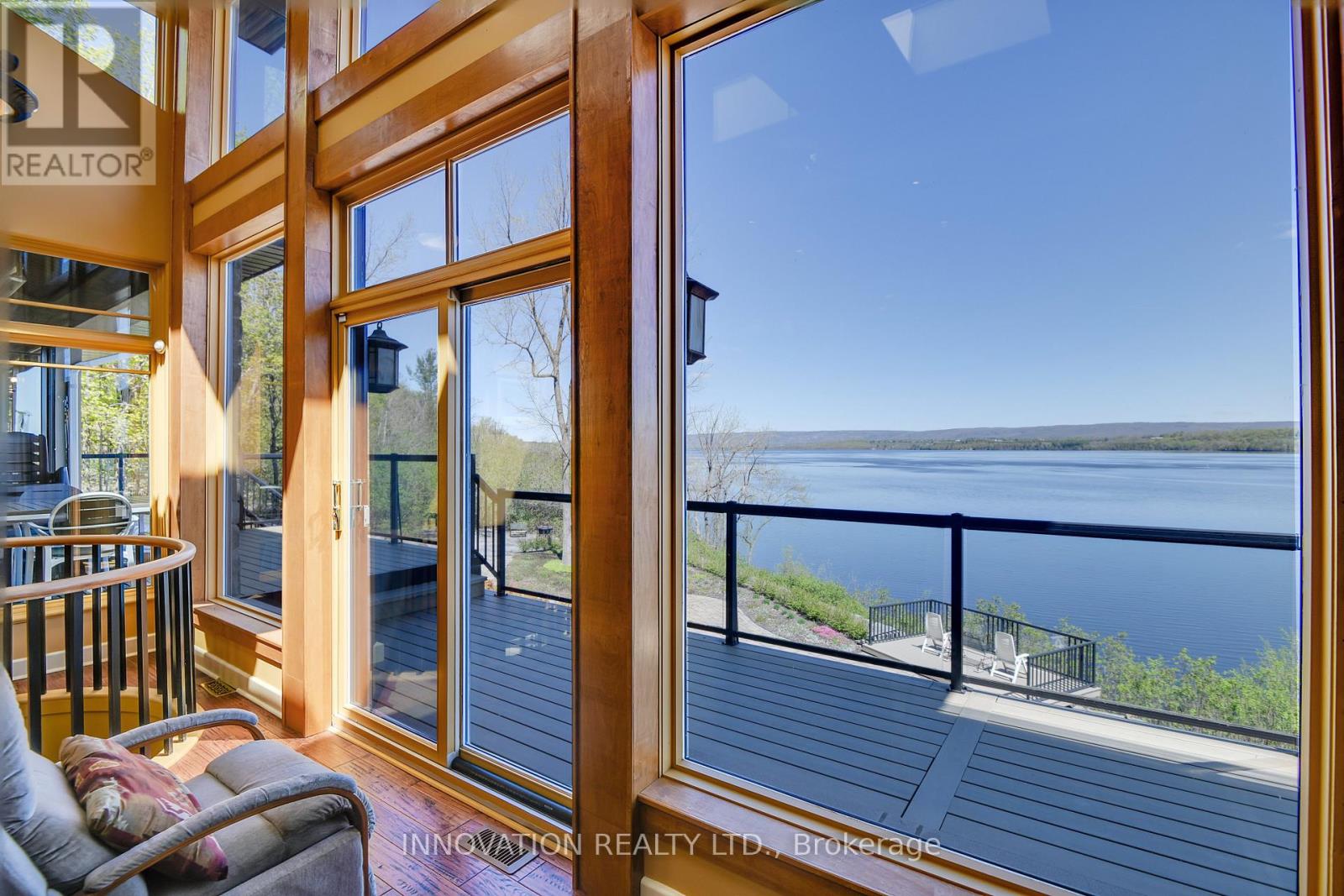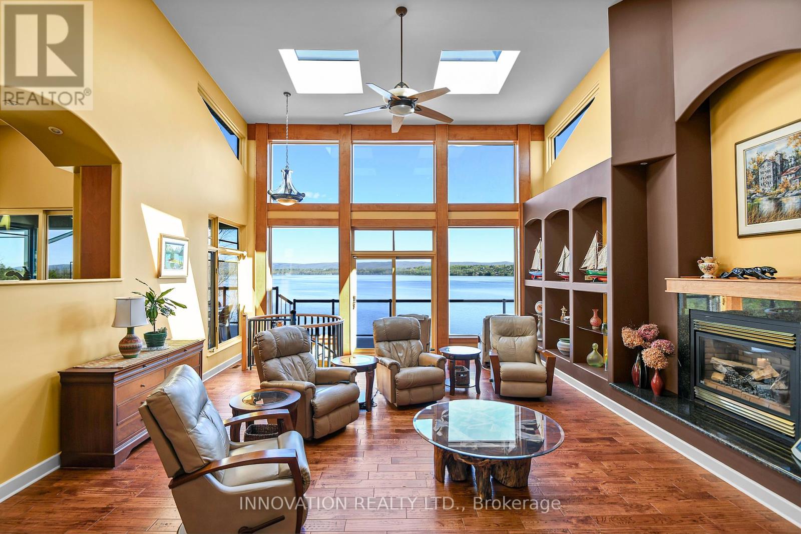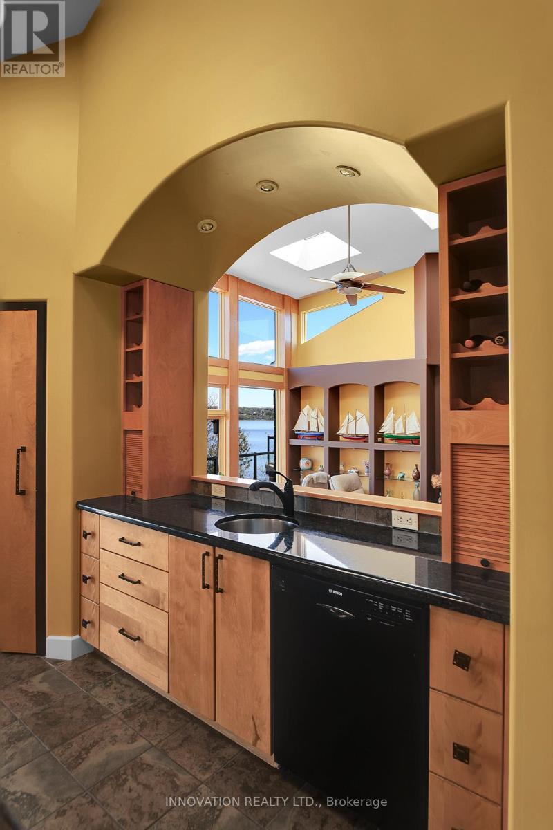 EXCEPTIONAL RIVERFRONT PROPERTY Perched safely above the Ottawa River this substantial highly customized home is designed to capture breathtaking views with private river access. Very private 1.59 acre property with 200ft riverfront. 180 degree views up & down river with fabulous city skyline vistas to the east. 4960 sqft of living space above grade plus over 2000 sqft finished space in the walkout lower level. Unassuming entry loft level opens to large open concept space as you descend the stairs giving an indication to the scale of this home. Artisan built natural stonewalls respect the rocky terrain. Customized at every corner & curve each space takes advantage of walls of windows to feature views of river & Gatineau Hills and the customized gardens all around the property. Great Rm has lofty ceilings w/skylights, fireplace, and circular staircase to the Recreation Room below. Kitchen is central to Dining & Family Rm. This well equipped Kitchen is perfect for entertaining. Very large Dining Room is accented by natural stone walls and arches. Family Room next to the Kitchen offers lovely garden views with afternoon sun & a fireplace. Spa space offers hot tub, sauna, rain shower + bathroom. Primary Bedroom suite has it all: corner windows w/views of the city skyline, deck, sunken Library, 5pc Ensuite & spacious Walk-in. 2 main level secondary Bedrooms each have Walk-ins, 3 piece Ensuites & loft spaces accessed by spiral stairs. Finished walkout lower level provides for a 2nd Family Room with a bar, Recreation Room, Media Room, 2 additional Bedrooms, a 3 piece Bathroom, and another Office. There is also a workshop, two utility rooms, and several storage areas. Extensive landscaping w/rock gardens, Trex decks, stairs to rocky shore & dock. Rare offering. 4 bay drive through garage. Generac generator for automatic transfer to the whole home if Hydro goes out. Located in Rural Kanata North along millionaires row, just minutes to many amenities. (id:64974)