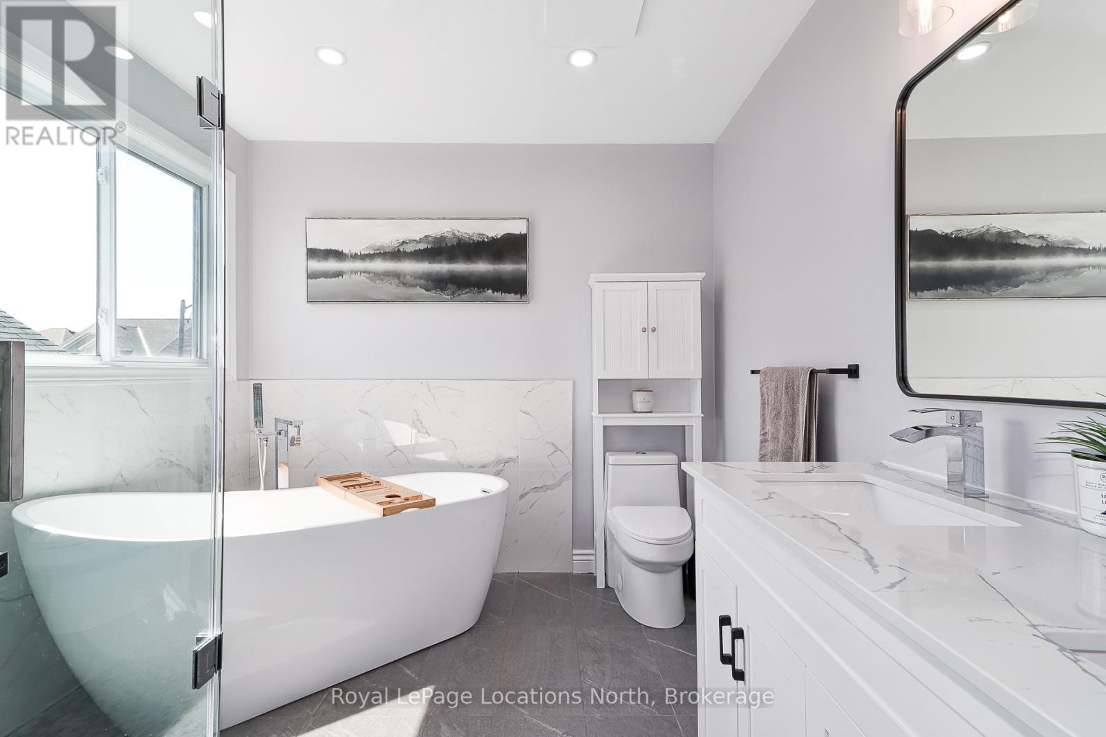 **INCREDIBLE VALUE IN CREEKSIDE!**Step into this bright and beautifully maintained 3+1 bedroom, 4 bathroom family home in the highly sought-after Creekside community-offering nearly 3,000 sq ft of finished living space designed for comfort, style, and versatility.The main floor impresses with soaring ceilings and a spacious open-concept layout, perfect for both everyday living and entertaining. Enjoy a stunning kitchen complete with black stainless steel appliances, tiled backsplash, walk-in pantry, and a cozy dining nook with walkout to a fully fenced, private backyard featuring a deck-ideal for summer gatherings. The inviting living area is anchored by a striking stone fireplace and custom cabinetry. Upstairs, you'll find three generous bedrooms, two full bathrooms, and a versatile bonus room-perfect for a home office, playroom, or lounge. The spacious primary suite offers a walk-in closet and a beautifully updated ensuite with a relaxing soaker tub. The fully finished basement adds incredible flexibility with in-law suite potential, making it ideal for extended family. Complete with a double car garage, landscaped yard, and storage shed, this home is perfectly located close to parks, scenic trails, and just minutes from Blue Mountain. Don't miss your chance to own this exceptional home in one of the area's most desirable neighborhoods! (id:64974)