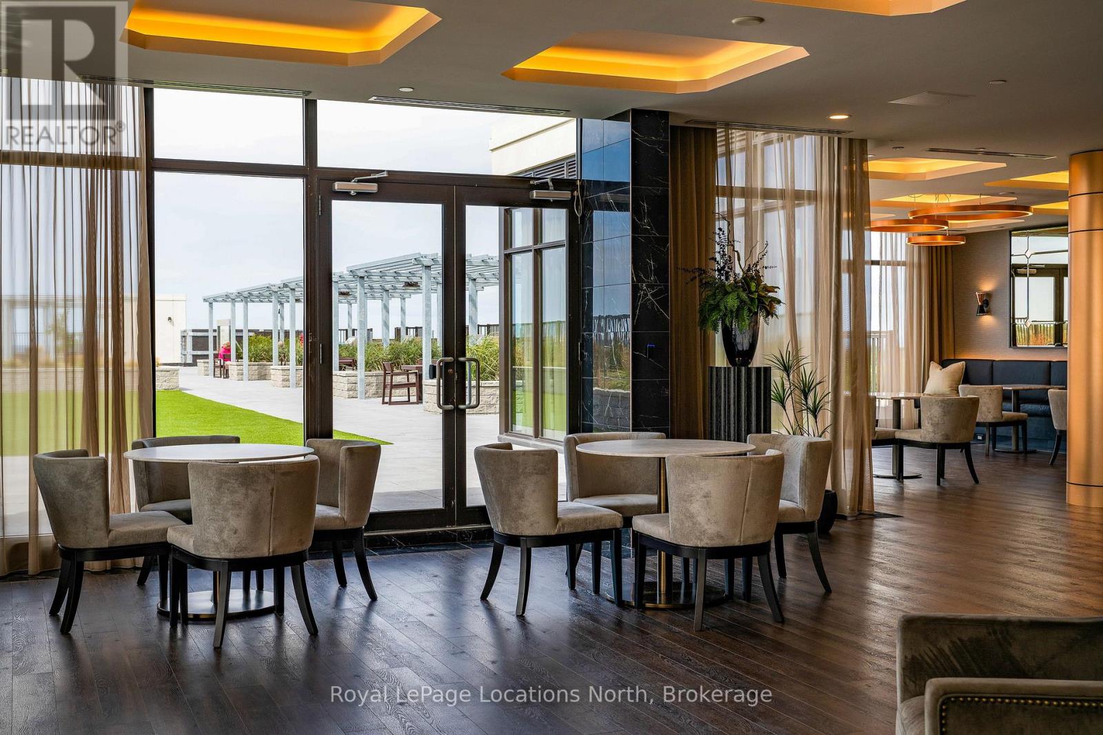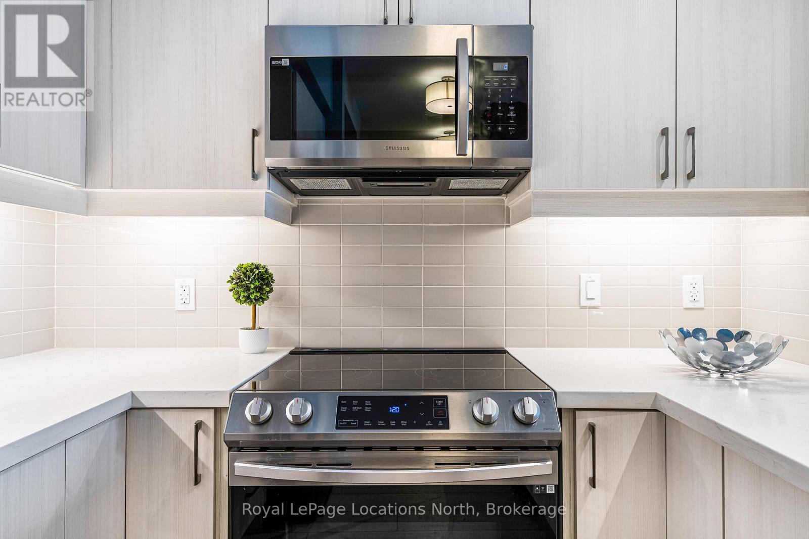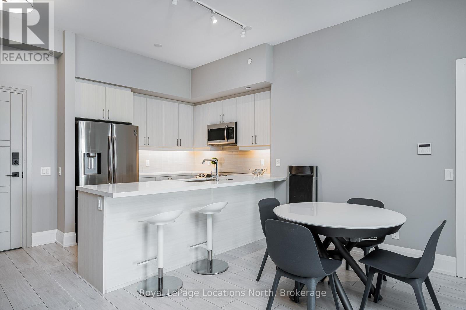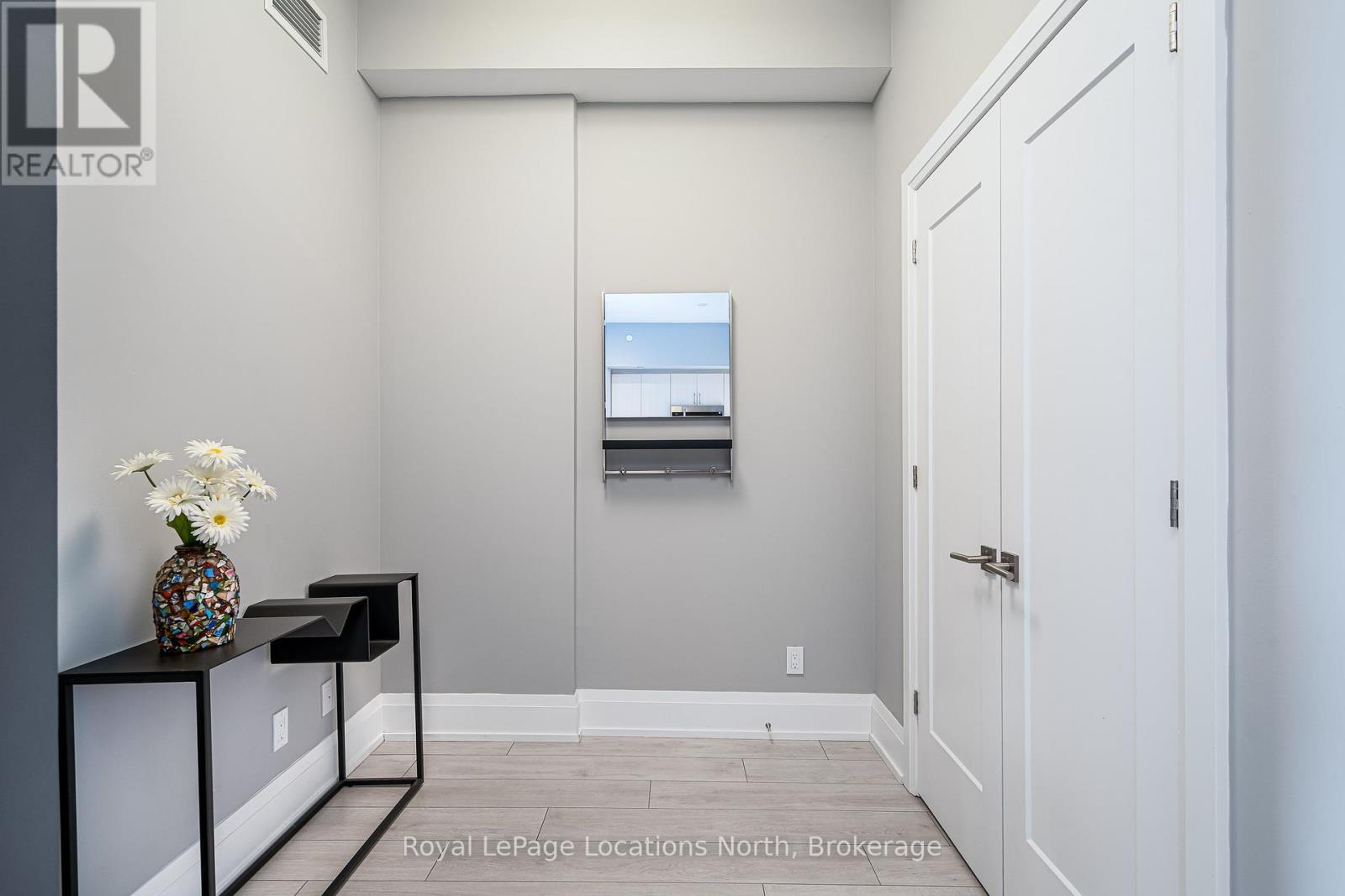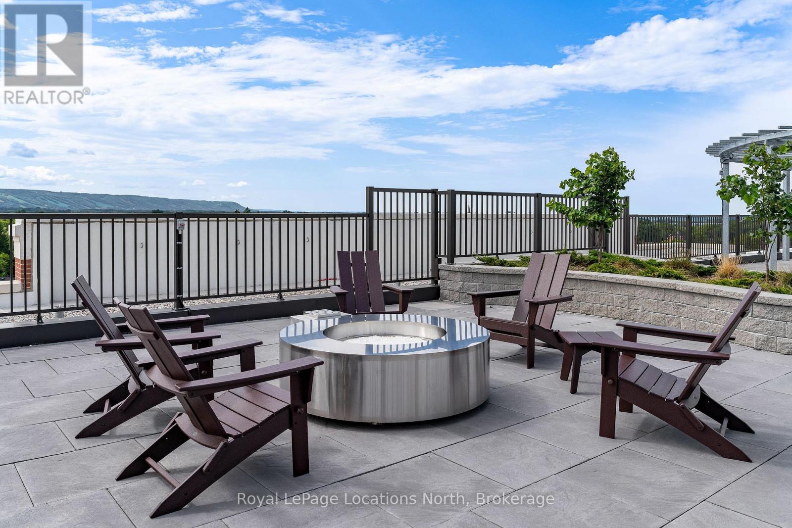 Experience refined living at Monaco, downtown Collingwood's most coveted address. This beautifully appointed "Beatrice" model offers 1,150 sq. ft. of thoughtfully designed space, featuring 10-foot ceilings and an open-concept layout filled with natural light. This particular unit stands out with its generous 226 sq. ft. private terrace spanning the full width of the condo, an incredible extension of your living space and the perfect spot for summer evenings, morning coffee, or entertaining friends. Inside, you'll find two spacious bedrooms plus a versatile flex space ideal for a home office or welcoming entry/mudroom. The primary suite offers a spa-inspired ensuite complete with a walk-in glass shower, double vanities and walk-in closets. The second bedroom is equipped with a built-in Murphy bed and enjoys access to its own private bathroom, perfect for guests. The kitchen is stylish and functional, featuring quartz countertops, ceramic tile backsplash, stainless steel appliances and a large island that connects to the living area, ideal for hosting and everyday living. Residents of Monaco enjoy exceptional amenities, including a stunning rooftop terrace with waterfall and fire pit, alfresco dining area with BBQs, an indoor social lounge with bar and a fitness centre overlooking Blue Mountain. Additional features include secure FOB entry, underground parking with two dedicated spaces, a large storage locker, Wi-Fi-enabled common areas and a pet-friendly atmosphere. With direct access to Collingwood's vibrant main street, you're just steps from restaurants, shops and the waterfront. The on-site upscale market and café add another layer of convenience and community. This is effortless luxury living in the heart of Collingwood where lifestyle truly meets location. (id:64974)