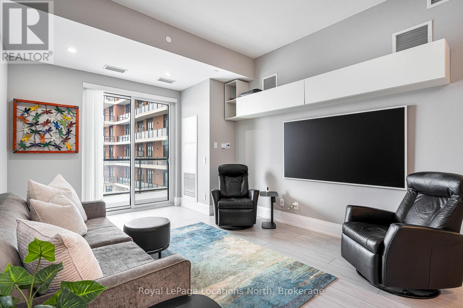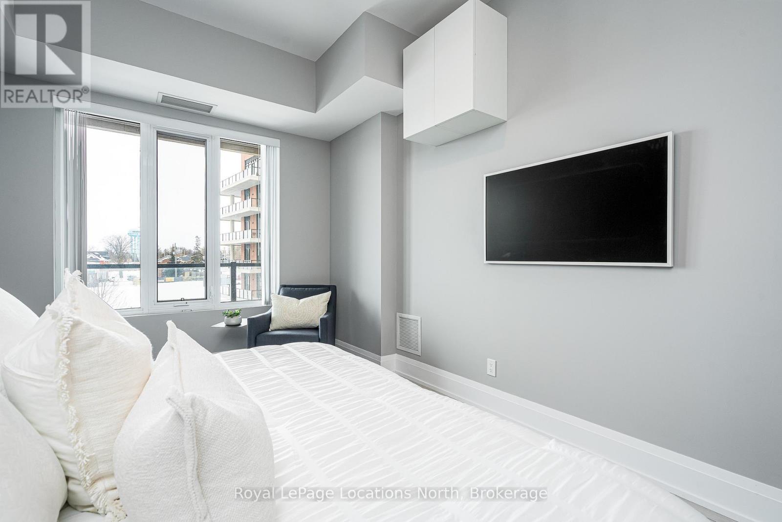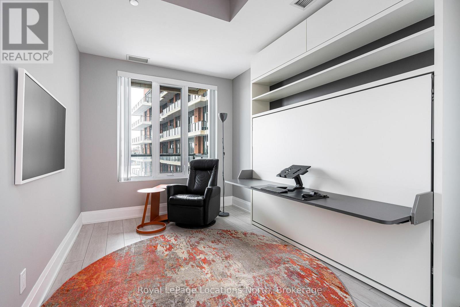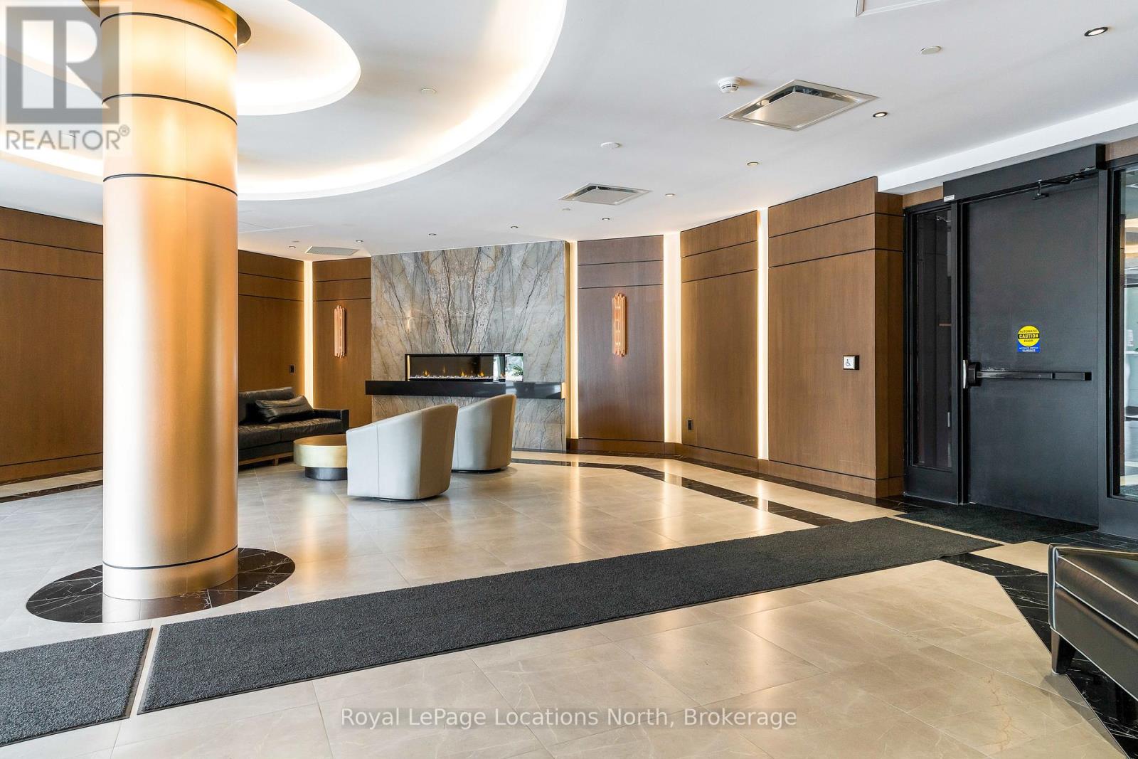 Experience refined living at Monaco, downtown Collingwood's most coveted address. This beautifully appointed "Beatrice" model offers 1,150 sq. ft. of thoughtfully designed space, featuring 10-foot ceilings and an open-concept layout filled with natural light. This particular unit stands out with its generous 226 sq. ft. private terrace spanning the full width of the condo, an incredible extension of your living space and the perfect spot for summer evenings, morning coffee, or entertaining friends. Inside, you'll find two spacious bedrooms plus a versatile flex space ideal for a home office or welcoming entry/mudroom. The primary suite offers a spa-inspired ensuite complete with a walk-in glass shower, double vanities and walk-in closets. The second bedroom is equipped with a built-in Murphy bed and enjoys access to its own private bathroom, perfect for guests. The kitchen is stylish and functional, featuring quartz countertops, ceramic tile backsplash, stainless steel appliances and a large island that connects to the living area, ideal for hosting and everyday living. Residents of Monaco enjoy exceptional amenities, including a stunning rooftop terrace with waterfall and fire pit, alfresco dining area with BBQs, an indoor social lounge with bar and a fitness centre overlooking Blue Mountain. Additional features include secure FOB entry, underground parking with two dedicated spaces, a large storage locker, Wi-Fi-enabled common areas and a pet-friendly atmosphere. With direct access to Collingwood's vibrant main street, you're just steps from restaurants, shops and the waterfront. The on-site upscale market and café add another layer of convenience and community. This is effortless luxury living in the heart of Collingwood where lifestyle truly meets location. (id:64974)