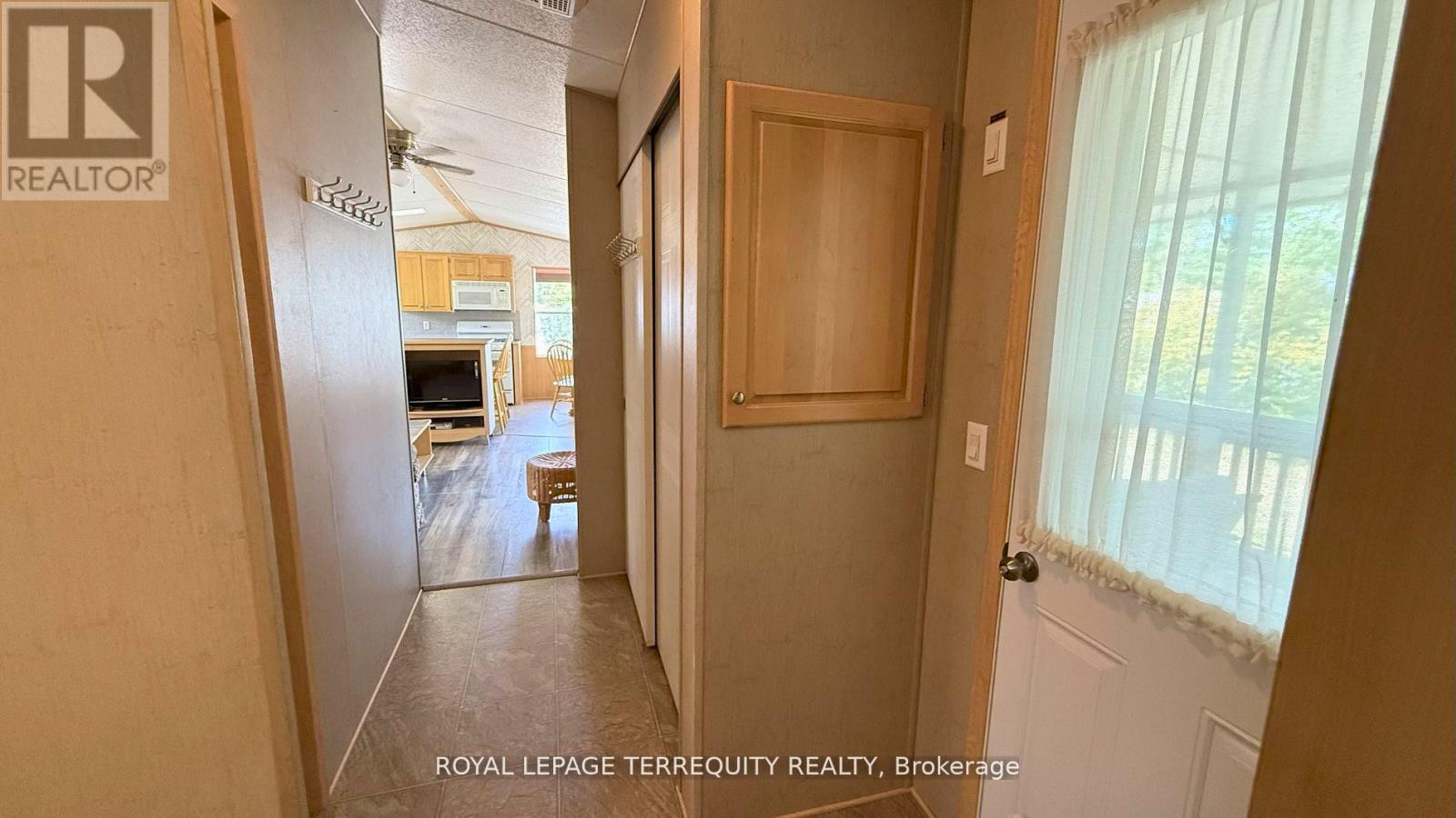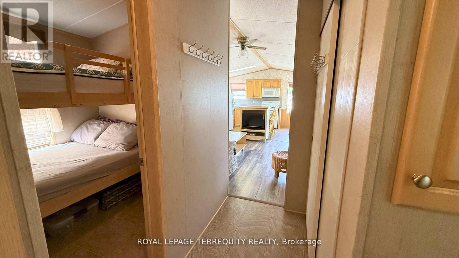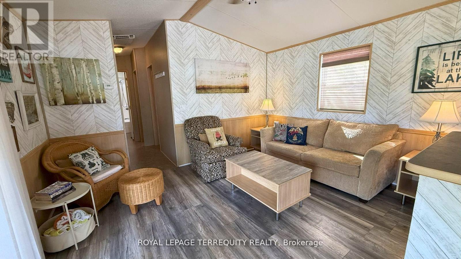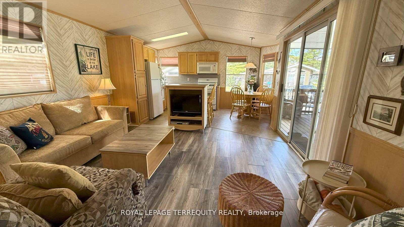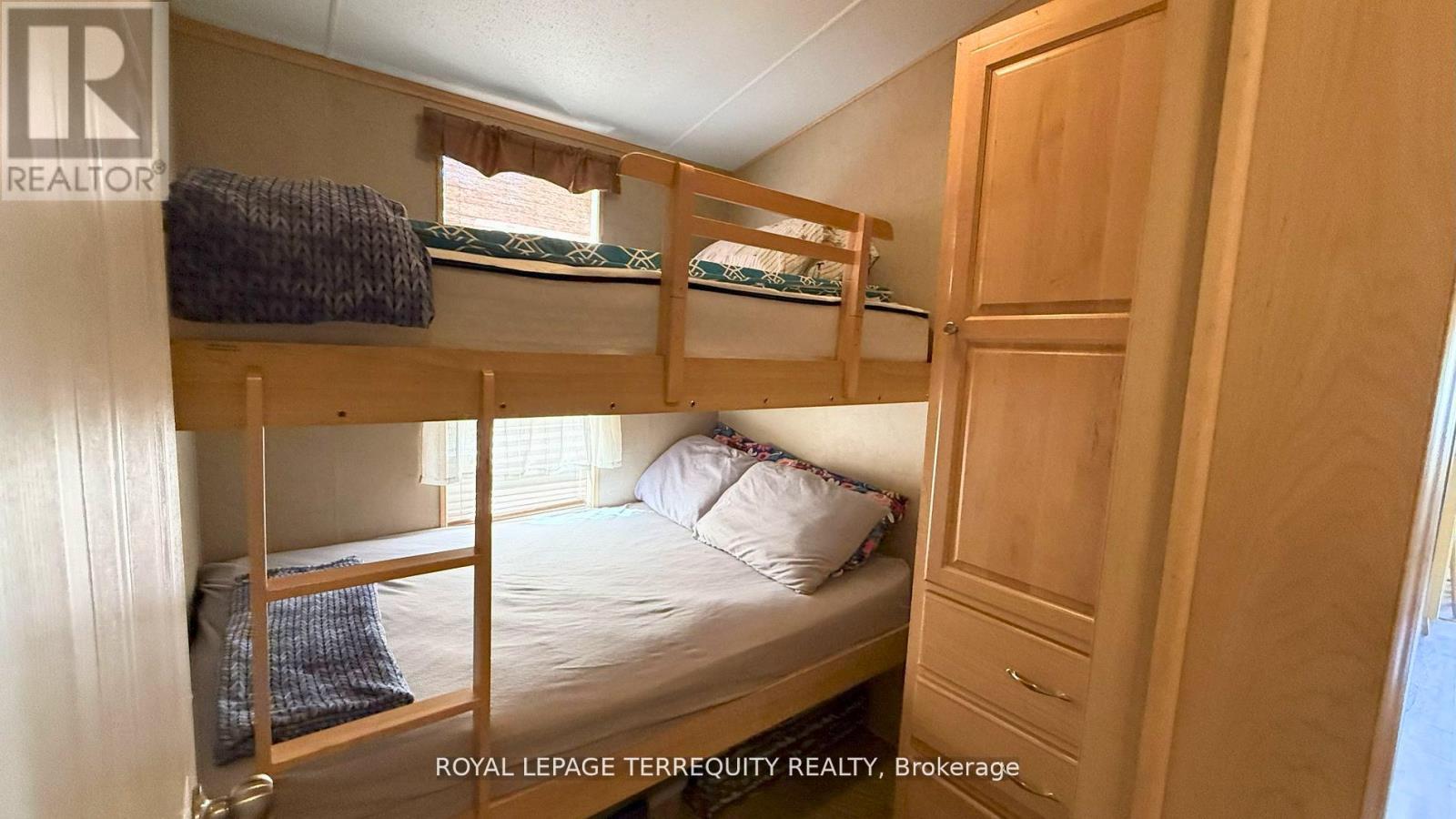Welcome to Pioneer Point Resort, your ideal seasonal escape nestled in a peaceful, nature filled setting. This well-maintained 2007 Northlander Cottager (in service since 2010) offers 30 amp service, stylish laminate flooring, and a ceramic backsplash, along with two convenient entrances and a full bathroom featuring a skylight for added natural light. Designed for comfort, it sleeps the whole family with a queen bed, a double bunk with built-in storage, and a pull-out couch. The bright, open layout is complemented by a large storage closet for all your essentials. Step outside to a spacious 14 x 40 deck that spans the length of the trailer, perfect for relaxing or entertaining, complete with a solid hardtop cover for all-weather enjoyment. An outdoor shed provides additional storage for tools, toys, and seasonal gear. Surrounded by mature trees and greenery, this lot offers privacy and a true cottage country feel. Pioneer Point Resort is a vibrant, family-friendly gated community offering a wide range of amenities, including two heated pools, a private sandy beach, pickleball courts, beach volleyball, horseshoe pits, a bouncy pillow, kids club, and weekly summer events for all ages. The resort operates seasonally from May 8th to October 25th, providing a low maintenance summer lifestyle. Optional dock rentals are available, with convenient access to nearby beaches, shopping, dining, and local attractions. The 2026 park fees of $5,975 plus HST and a $300 hydro deposit have already been paid, making this a truly turnkey opportunity. Move in, relax, and start making memories right away. Your perfect seasonal getaway awaits! (id:64974)