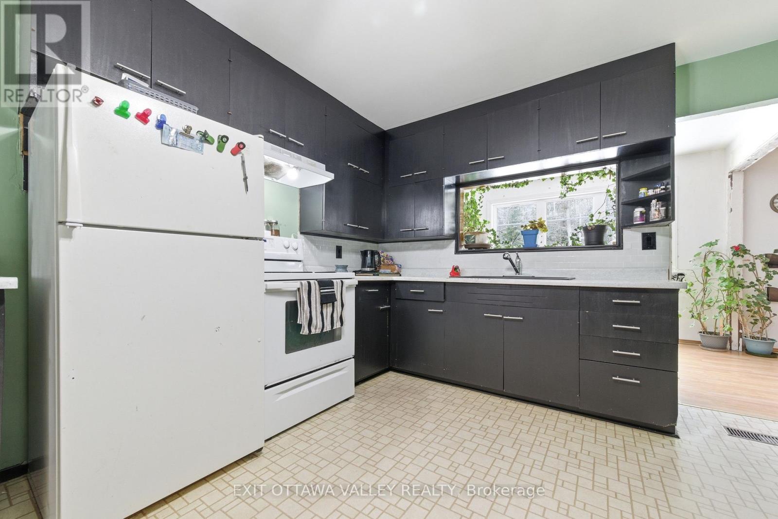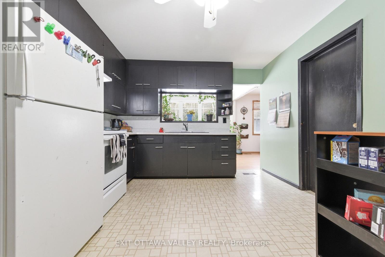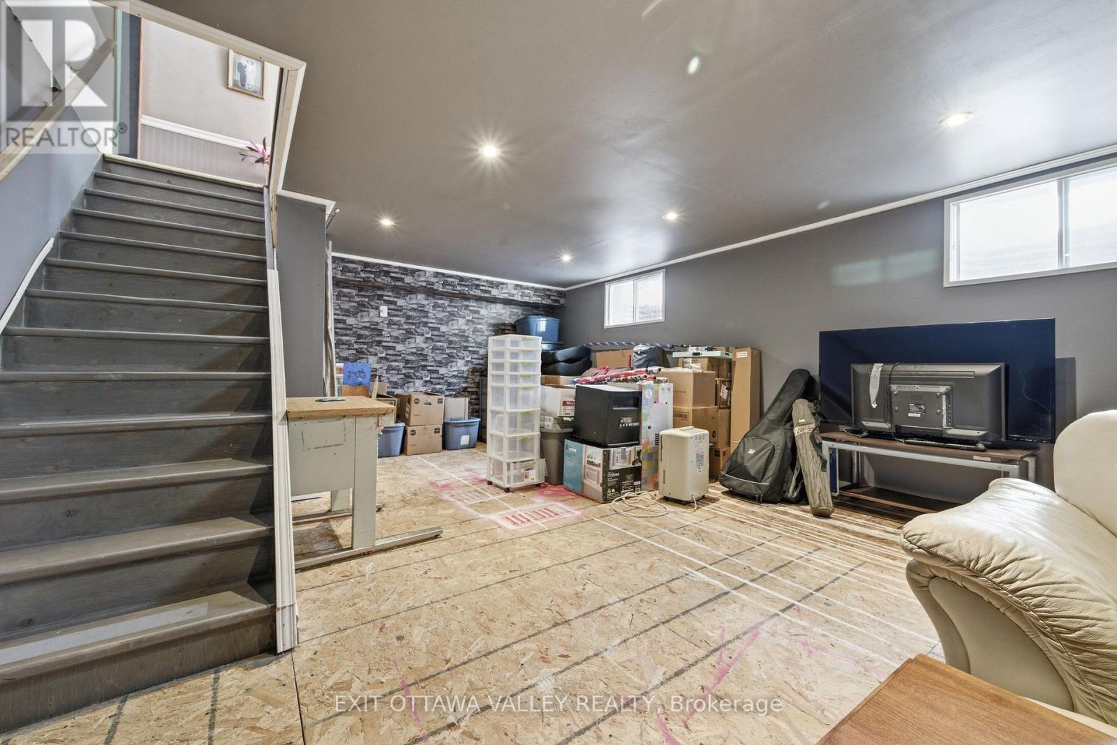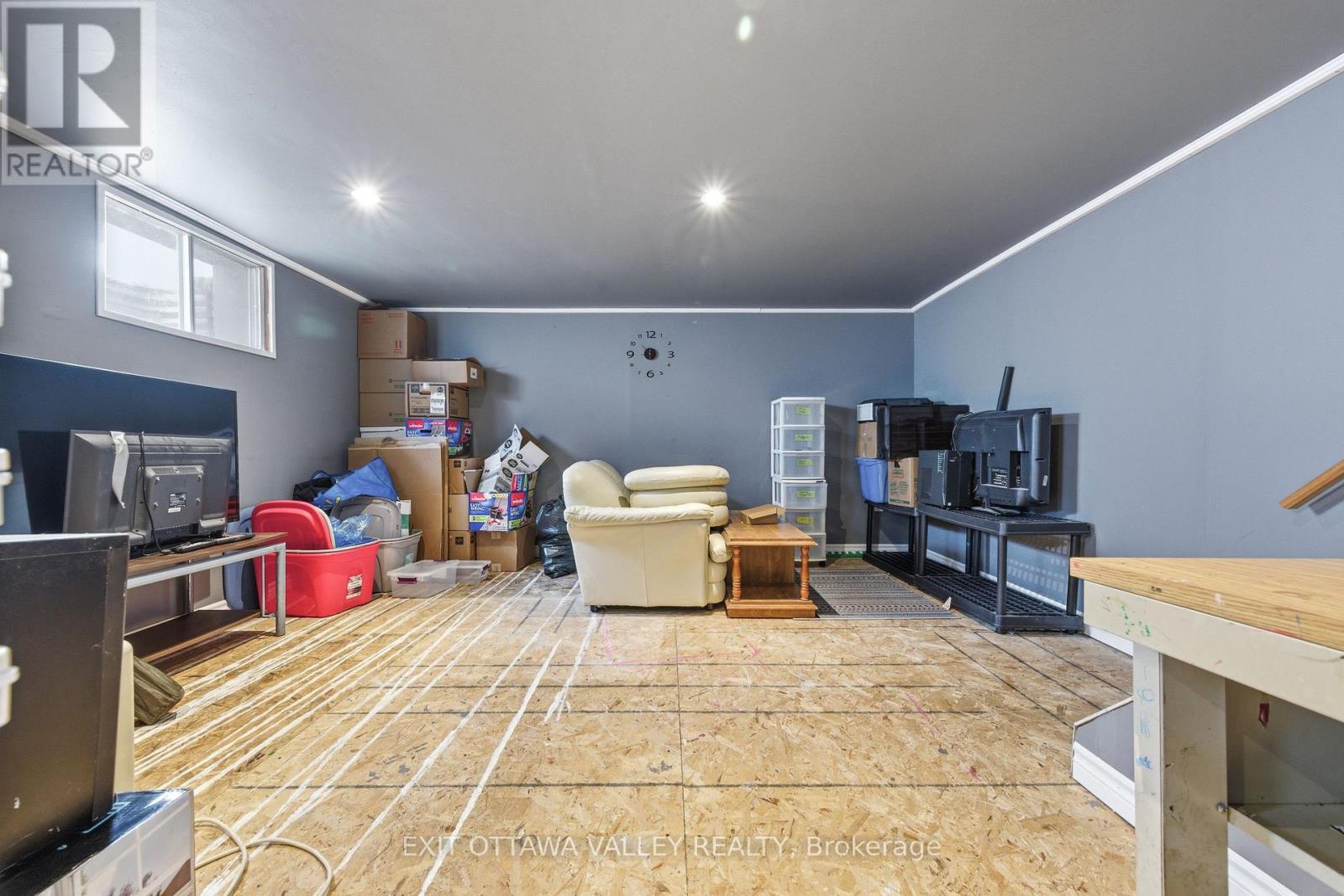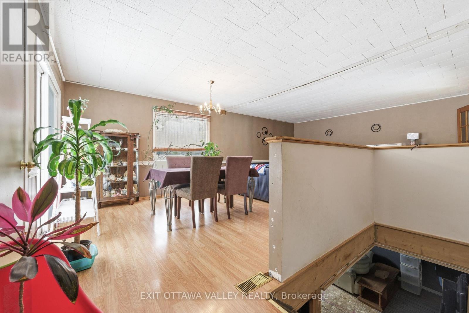 Offering more space than meets the eye, this 3-bed, 2-bath bungalow backing onto forest with no rear neighbours combines practical living with a convenient location close to everything Deep River has to offer. Upon driving up, you're first greeted by a covered front porch which guides you into the home and into a large foyer area with cozy woodstove and loads of natural light. Deceptively spacious, this home features a huge eat-in kitchen with pantry and abundant cupboard space, along with bright, oversized living and dining areas with patio access to the back deck. The main floor is complete with a recently updated main bathroom, generous primary bedroom with 3-piece ensuite, plus two additional bedrooms and convenient main floor laundry room. The partially finished lower level offers excellent potential to expand with additional bedrooms, a rec room, or customized living space. Situated on a great lot with a large driveway, workshop with electricity, and a 3-bay lean-to for wood or extra storage. This home is located close to ATV and snowmobile trails, schools, hospital, and all local amenities. A fantastic opportunity to enjoy bungalow living with room to grow! (id:64974)