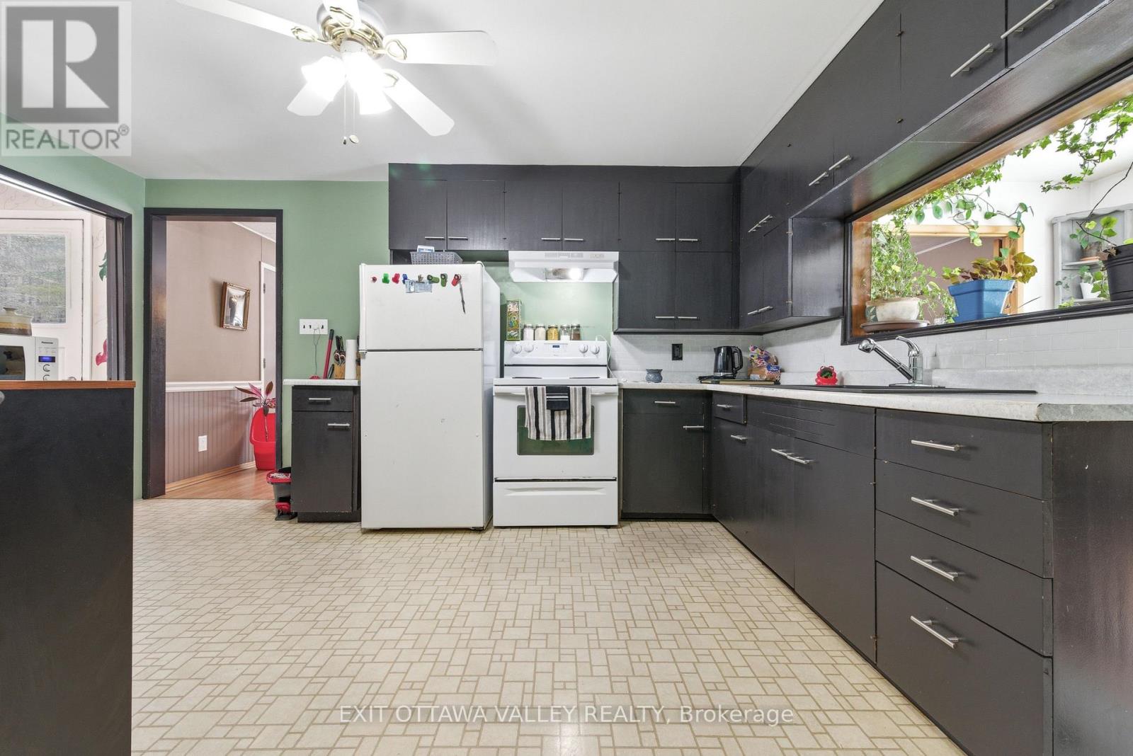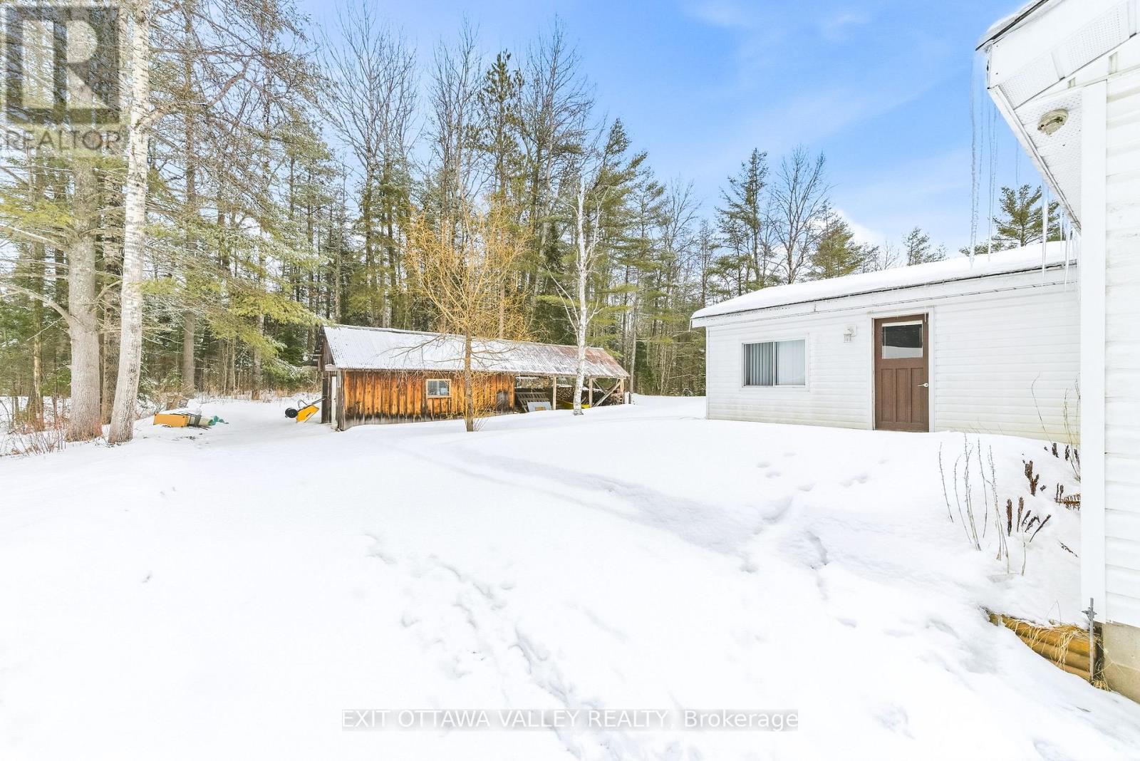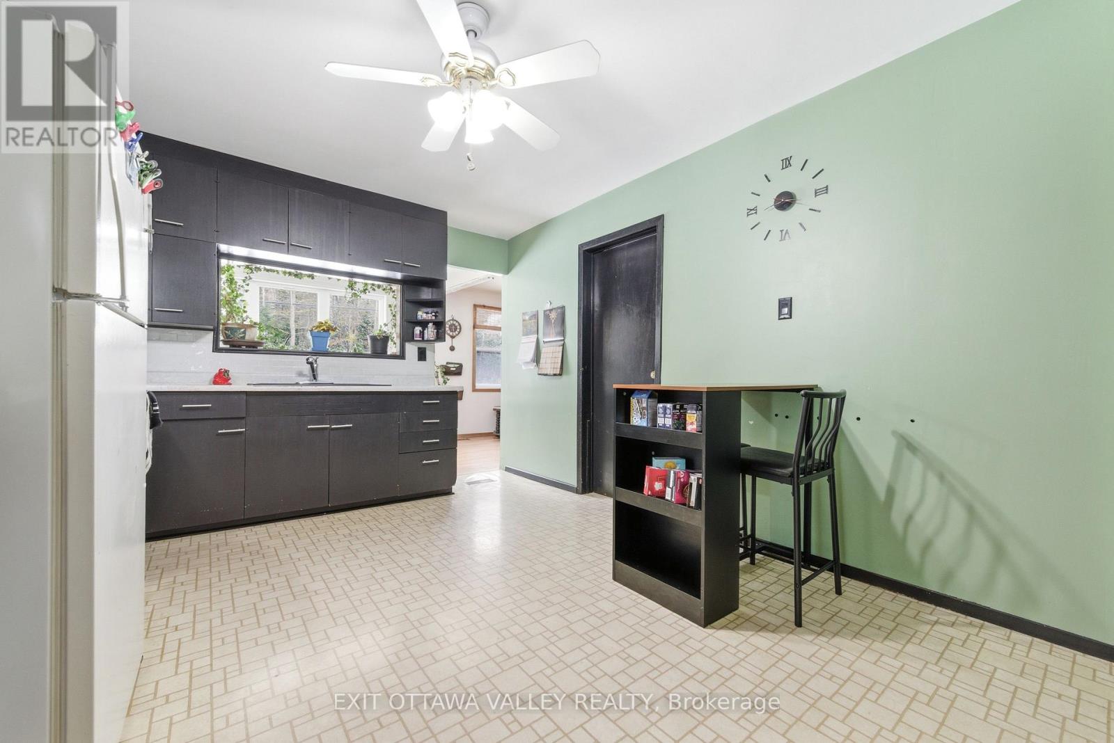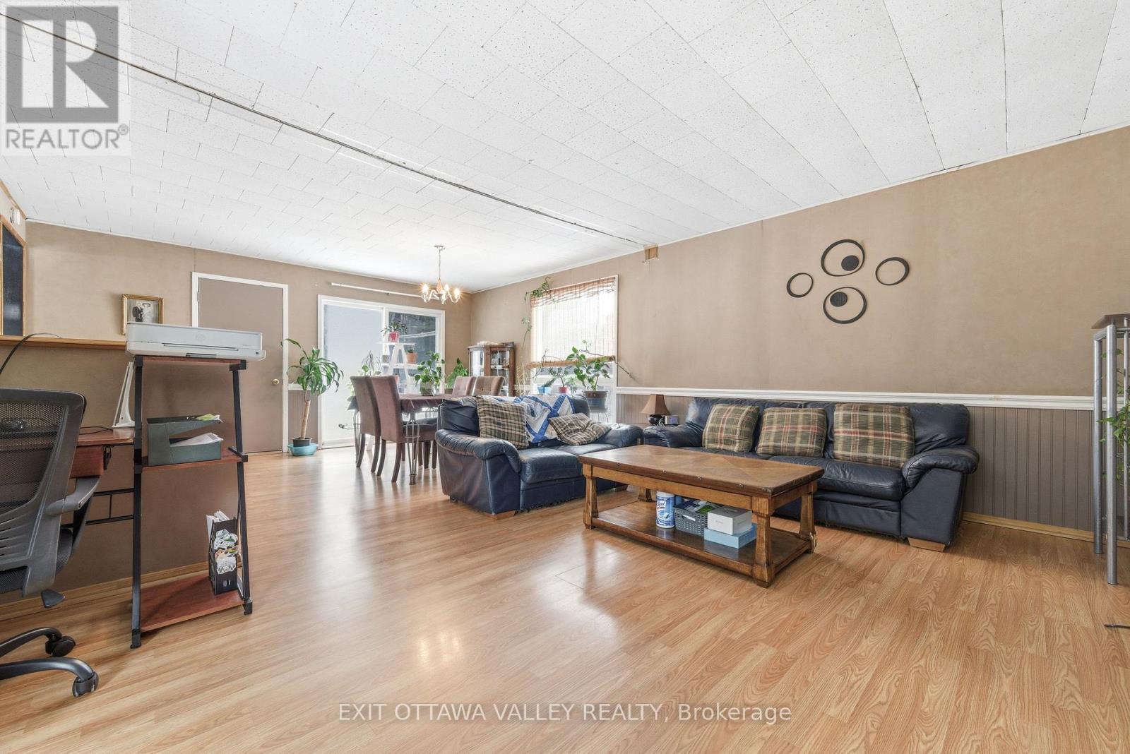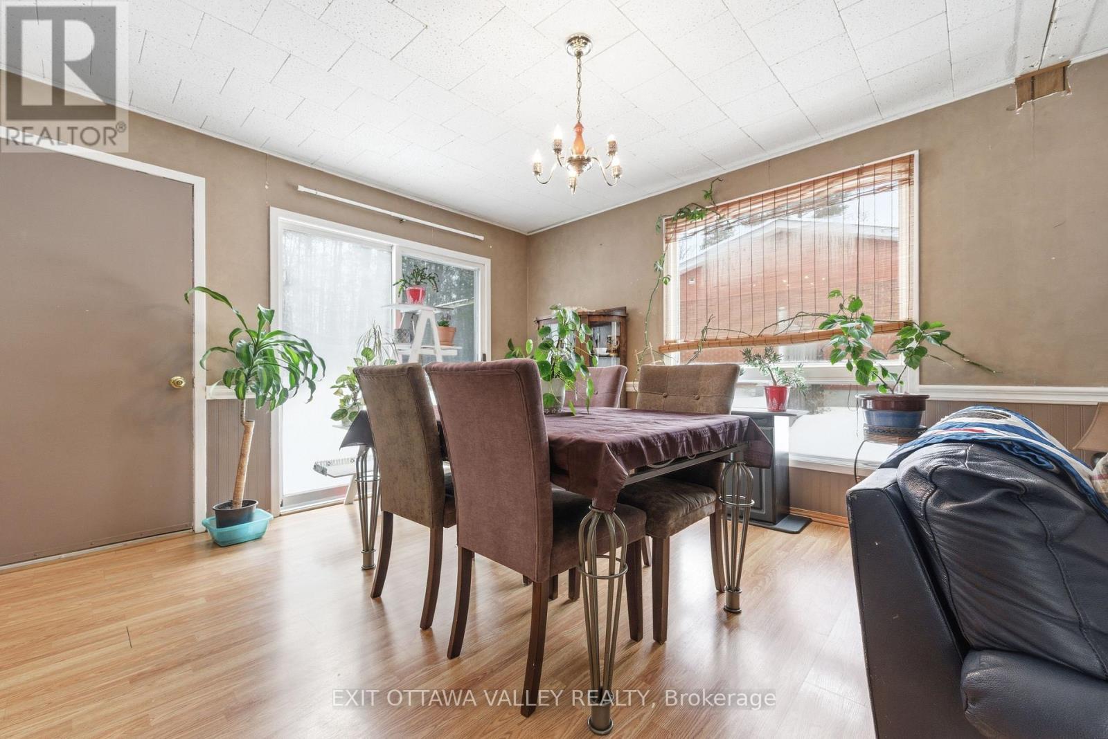Offering more space than meets the eye, this 3-bed, 2-bath bungalow backing onto forest with no rear neighbours combines practical living with a convenient location close to everything Deep River has to offer. Upon driving up, you're first greeted by a covered front porch which guides you into the home and into a large foyer area with cozy woodstove and loads of natural light. Deceptively spacious, this home features a huge eat-in kitchen with pantry and abundant cupboard space, along with bright, oversized living and dining areas with patio access to the back deck. The main floor is complete with a recently updated main bathroom, generous primary bedroom with 3-piece ensuite, plus two additional bedrooms and convenient main floor laundry room. The partially finished lower level offers excellent potential to expand with additional bedrooms, a rec room, or customized living space. Situated on a great lot with a large driveway, workshop with electricity, and a 3-bay lean-to for wood or extra storage. This home is located close to ATV and snowmobile trails, schools, hospital, and all local amenities. A fantastic opportunity to enjoy bungalow living with room to grow! (id:64974)