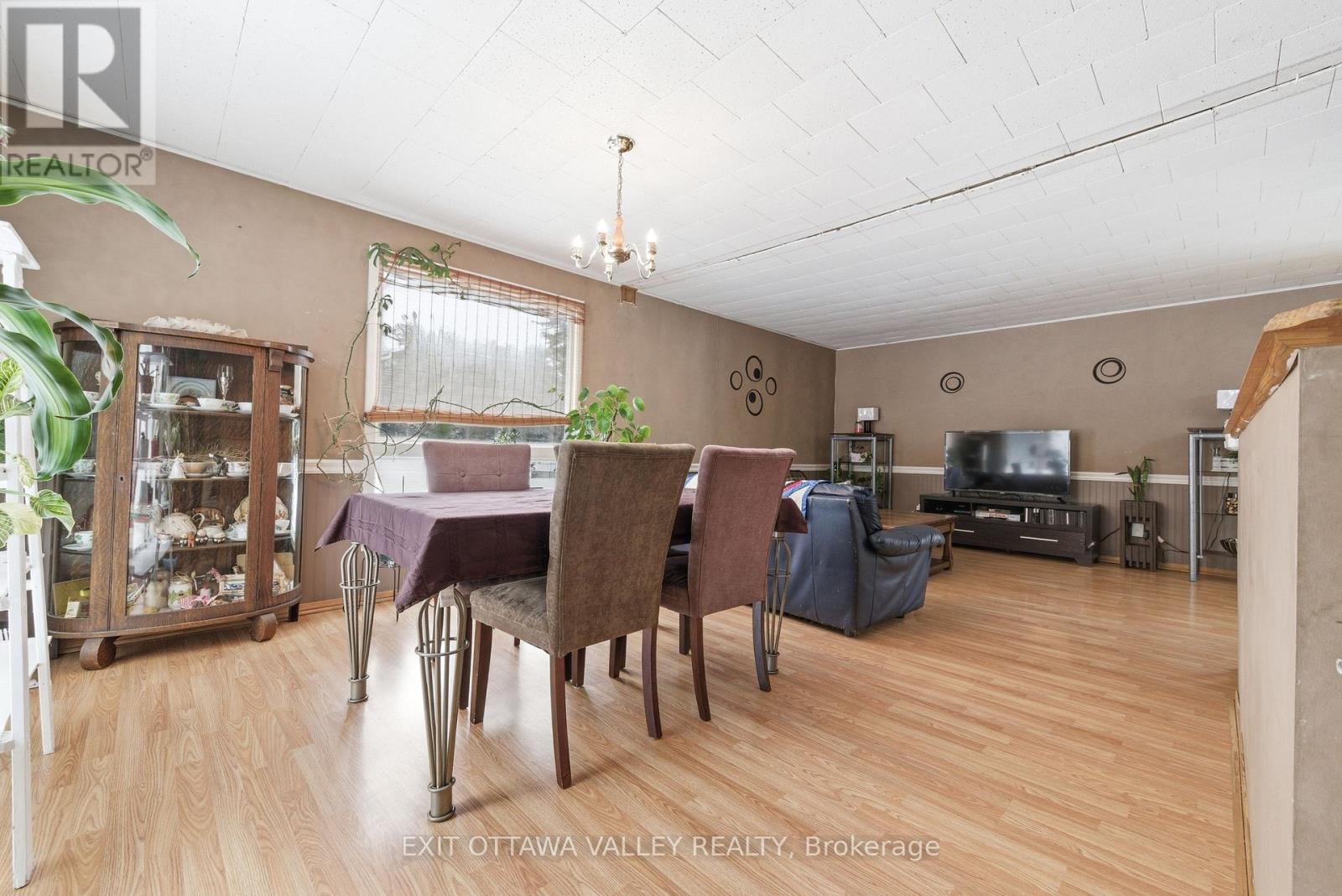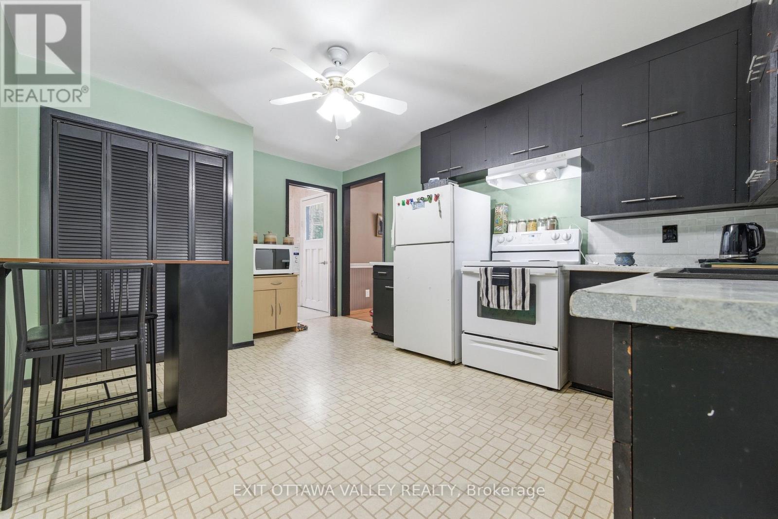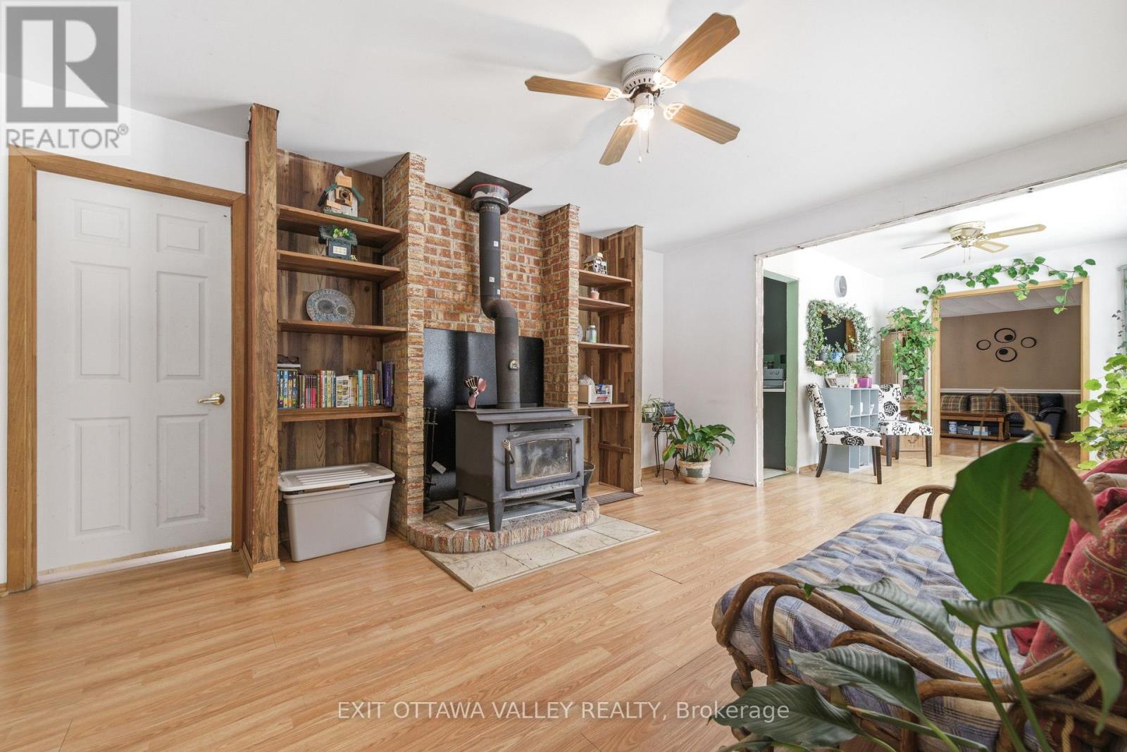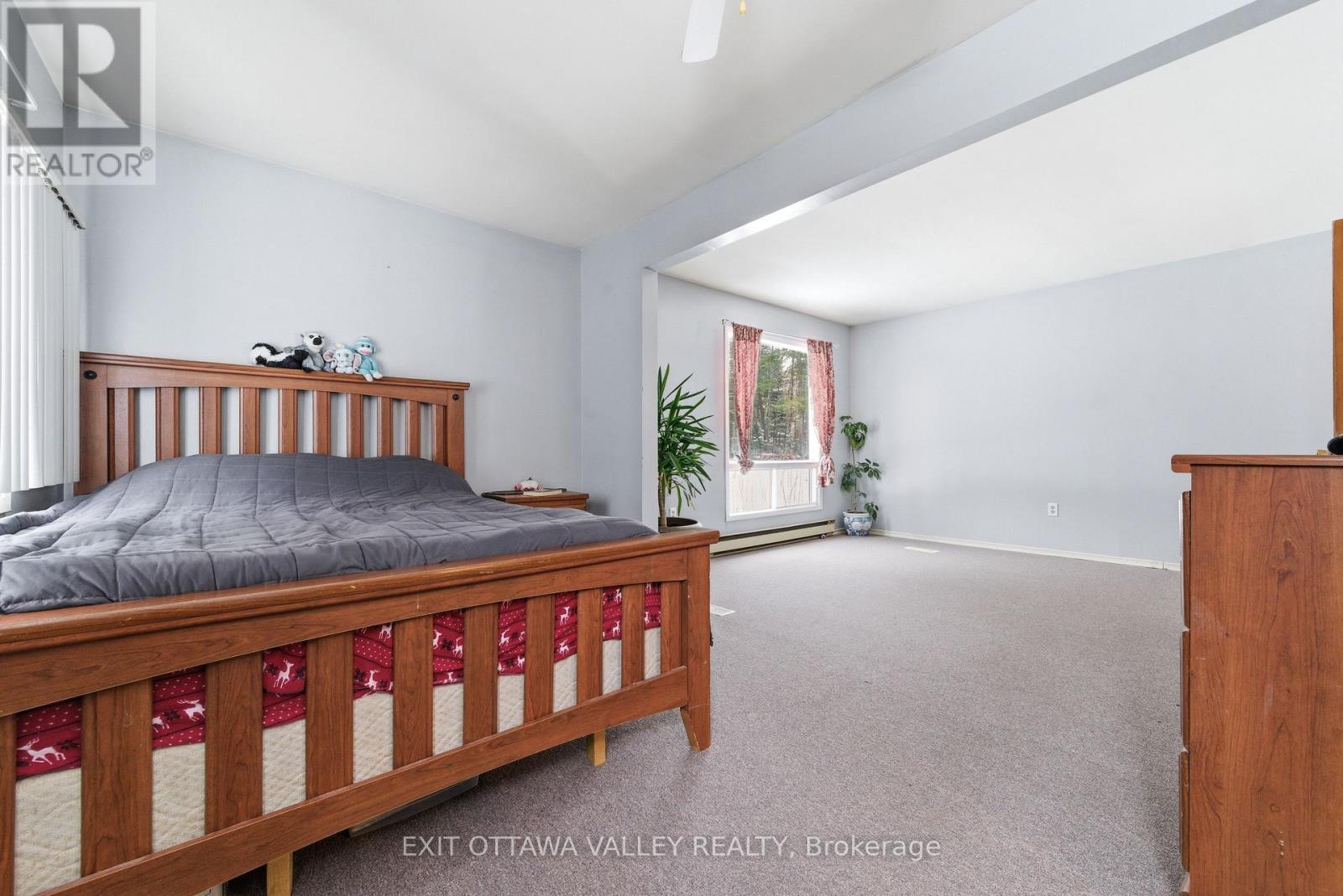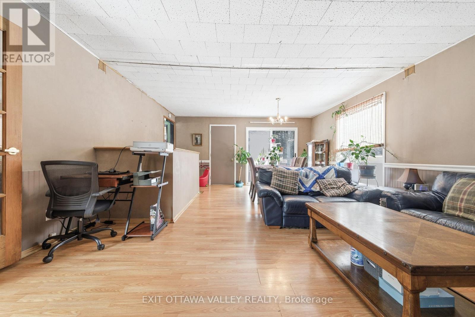 Offering more space than meets the eye, this 3-bed, 2-bath bungalow backing onto forest with no rear neighbours combines practical living with a convenient location close to everything Deep River has to offer. Upon driving up, you're first greeted by a covered front porch which guides you into the home and into a large foyer area with cozy woodstove and loads of natural light. Deceptively spacious, this home features a huge eat-in kitchen with pantry and abundant cupboard space, along with bright, oversized living and dining areas with patio access to the back deck. The main floor is complete with a recently updated main bathroom, generous primary bedroom with 3-piece ensuite, plus two additional bedrooms and convenient main floor laundry room. The partially finished lower level offers excellent potential to expand with additional bedrooms, a rec room, or customized living space. Situated on a great lot with a large driveway, workshop with electricity, and a 3-bay lean-to for wood or extra storage. This home is located close to ATV and snowmobile trails, schools, hospital, and all local amenities. A fantastic opportunity to enjoy bungalow living with room to grow! (id:64974)