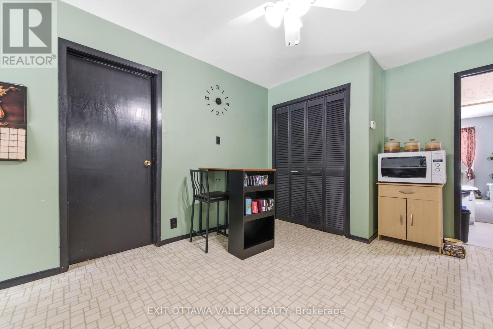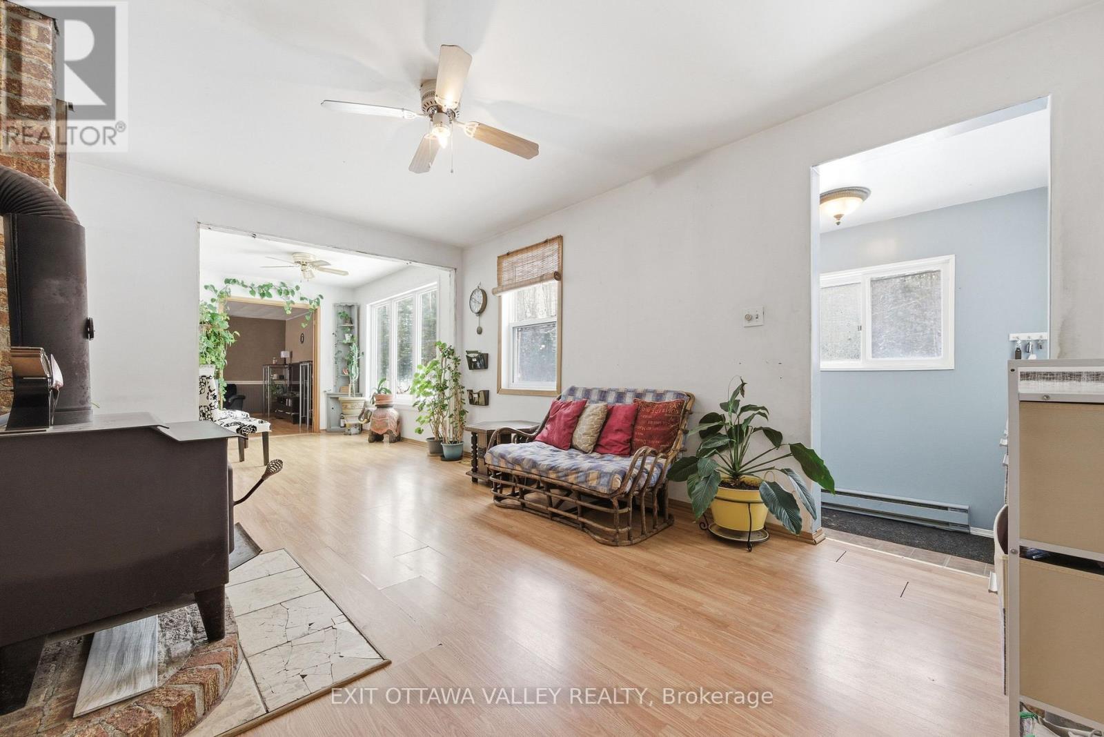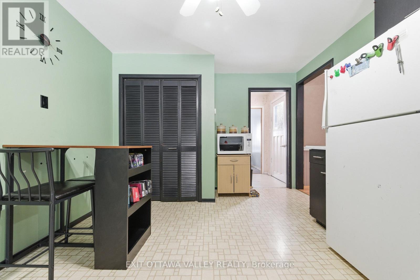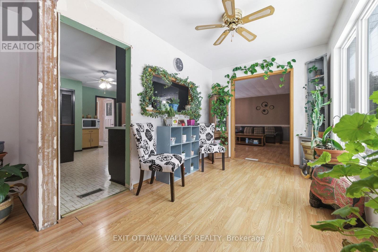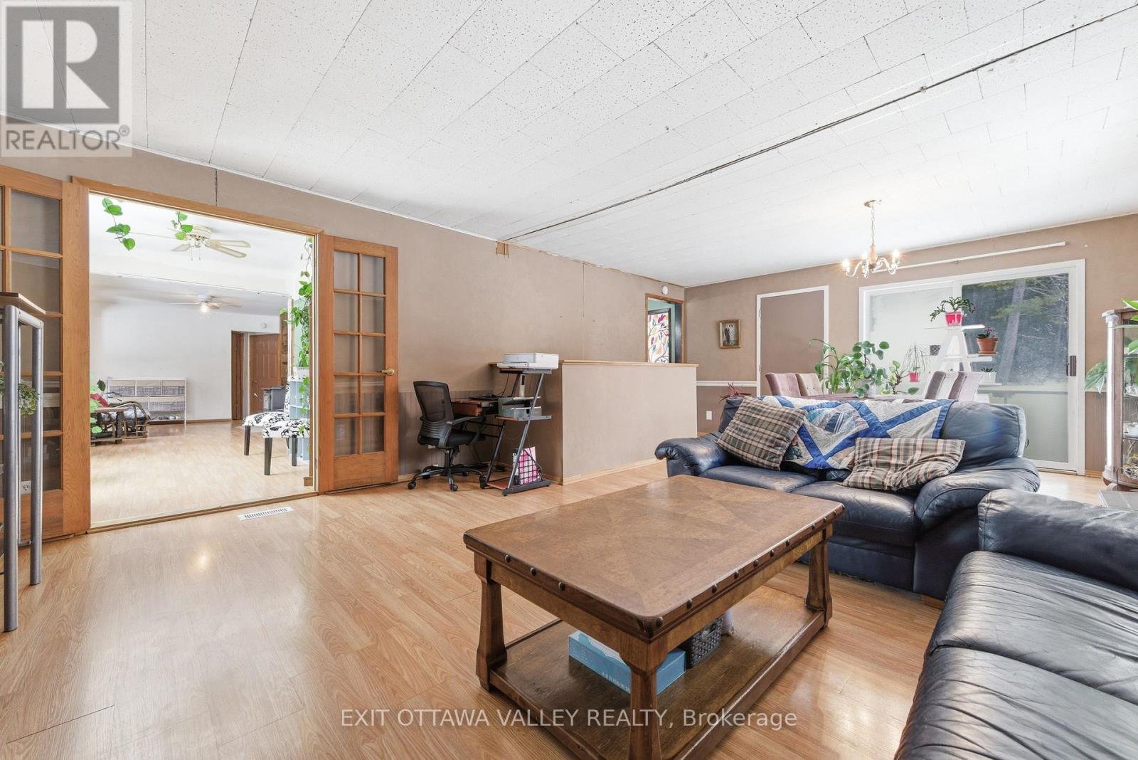 Offering more space than meets the eye, this 3-bed, 2-bath bungalow backing onto forest with no rear neighbours combines practical living with a convenient location close to everything Deep River has to offer. Upon driving up, you're first greeted by a covered front porch which guides you into the home and into a large foyer area with cozy woodstove and loads of natural light. Deceptively spacious, this home features a huge eat-in kitchen with pantry and abundant cupboard space, along with bright, oversized living and dining areas with patio access to the back deck. The main floor is complete with a recently updated main bathroom, generous primary bedroom with 3-piece ensuite, plus two additional bedrooms and convenient main floor laundry room. The partially finished lower level offers excellent potential to expand with additional bedrooms, a rec room, or customized living space. Situated on a great lot with a large driveway, workshop with electricity, and a 3-bay lean-to for wood or extra storage. This home is located close to ATV and snowmobile trails, schools, hospital, and all local amenities. A fantastic opportunity to enjoy bungalow living with room to grow! (id:64974)