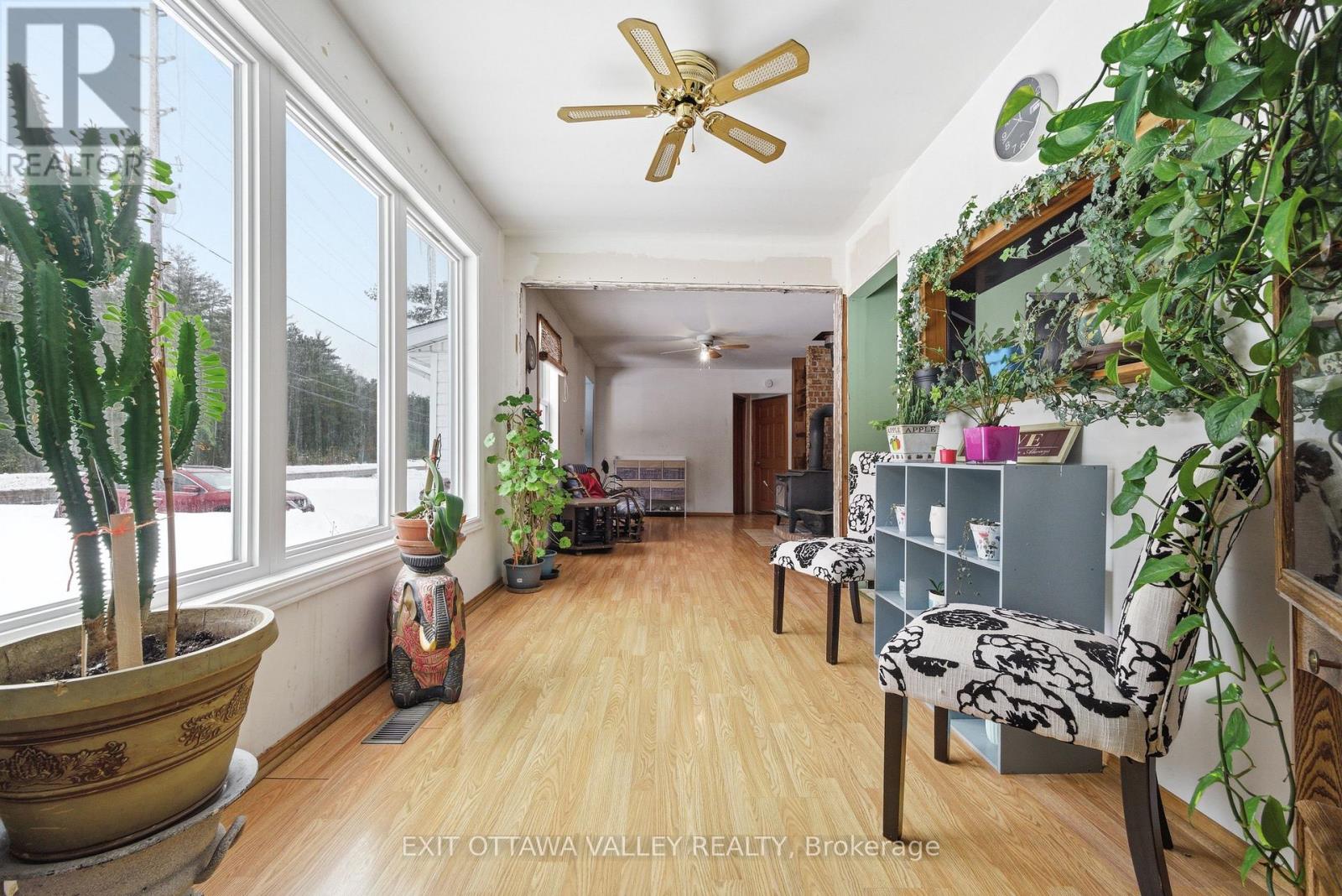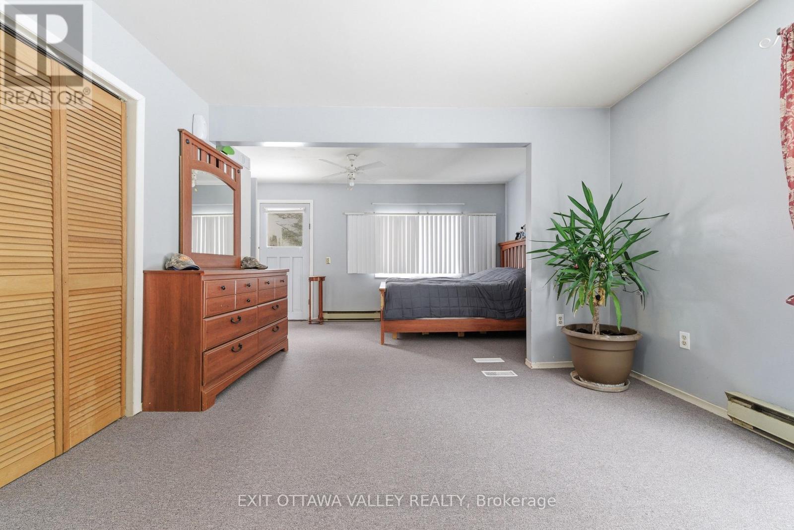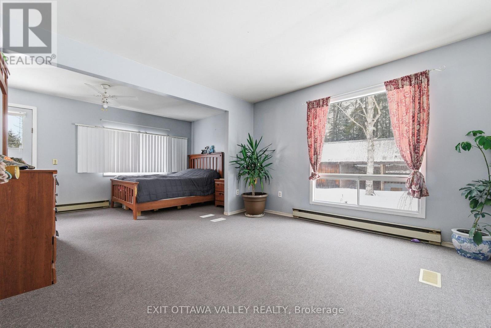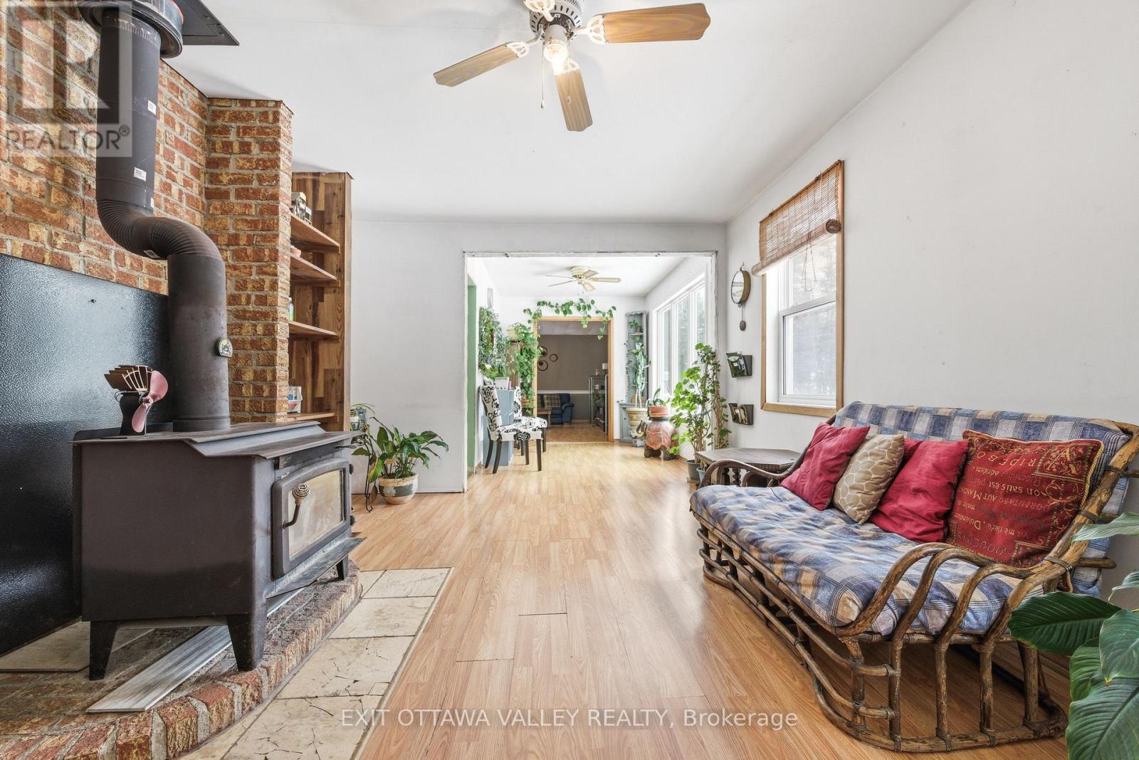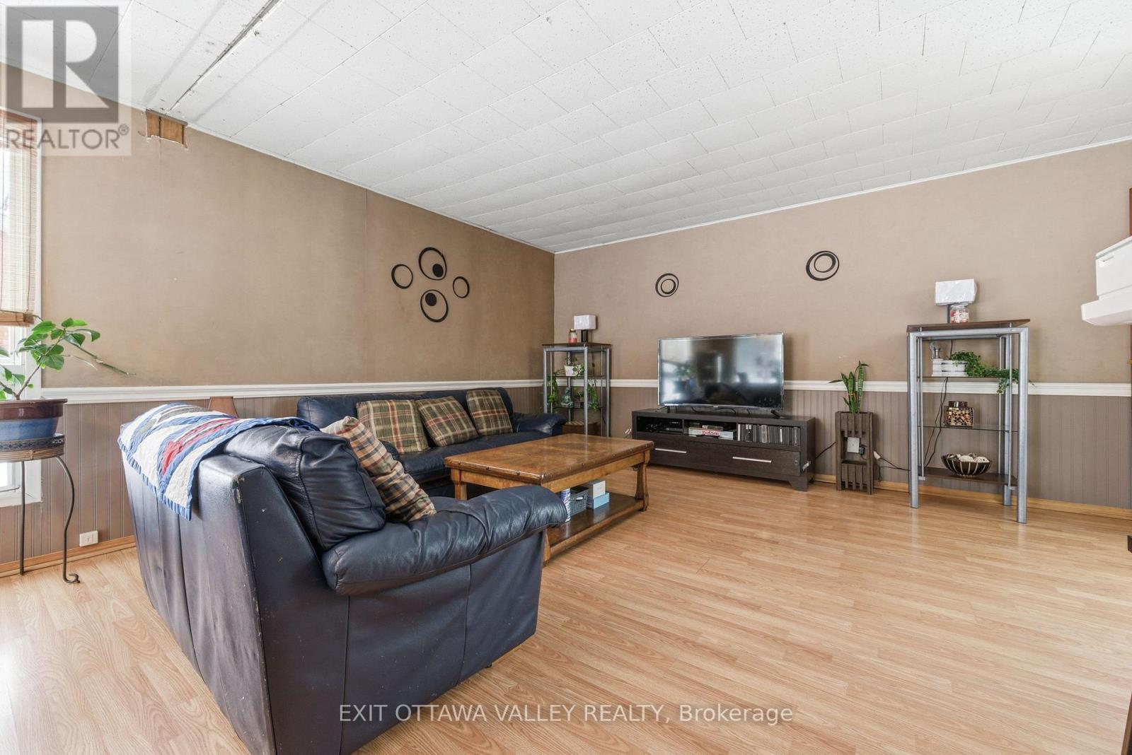 Offering more space than meets the eye, this 3-bed, 2-bath bungalow backing onto forest with no rear neighbours combines practical living with a convenient location close to everything Deep River has to offer. Upon driving up, you're first greeted by a covered front porch which guides you into the home and into a large foyer area with cozy woodstove and loads of natural light. Deceptively spacious, this home features a huge eat-in kitchen with pantry and abundant cupboard space, along with bright, oversized living and dining areas with patio access to the back deck. The main floor is complete with a recently updated main bathroom, generous primary bedroom with 3-piece ensuite, plus two additional bedrooms and convenient main floor laundry room. The partially finished lower level offers excellent potential to expand with additional bedrooms, a rec room, or customized living space. Situated on a great lot with a large driveway, workshop with electricity, and a 3-bay lean-to for wood or extra storage. This home is located close to ATV and snowmobile trails, schools, hospital, and all local amenities. A fantastic opportunity to enjoy bungalow living with room to grow! (id:64974)