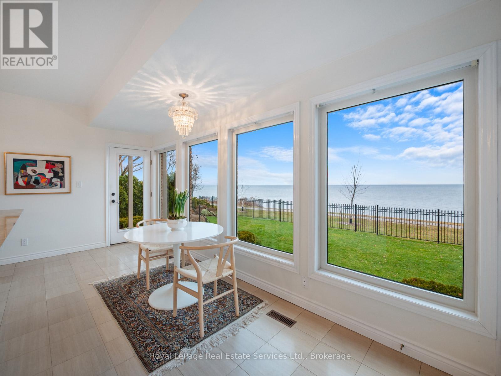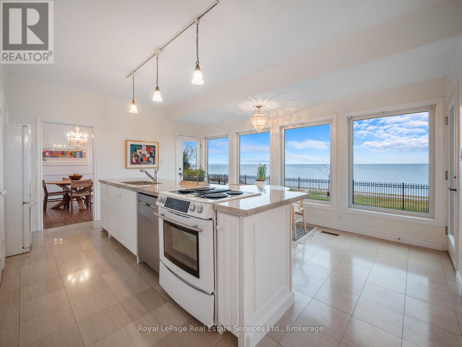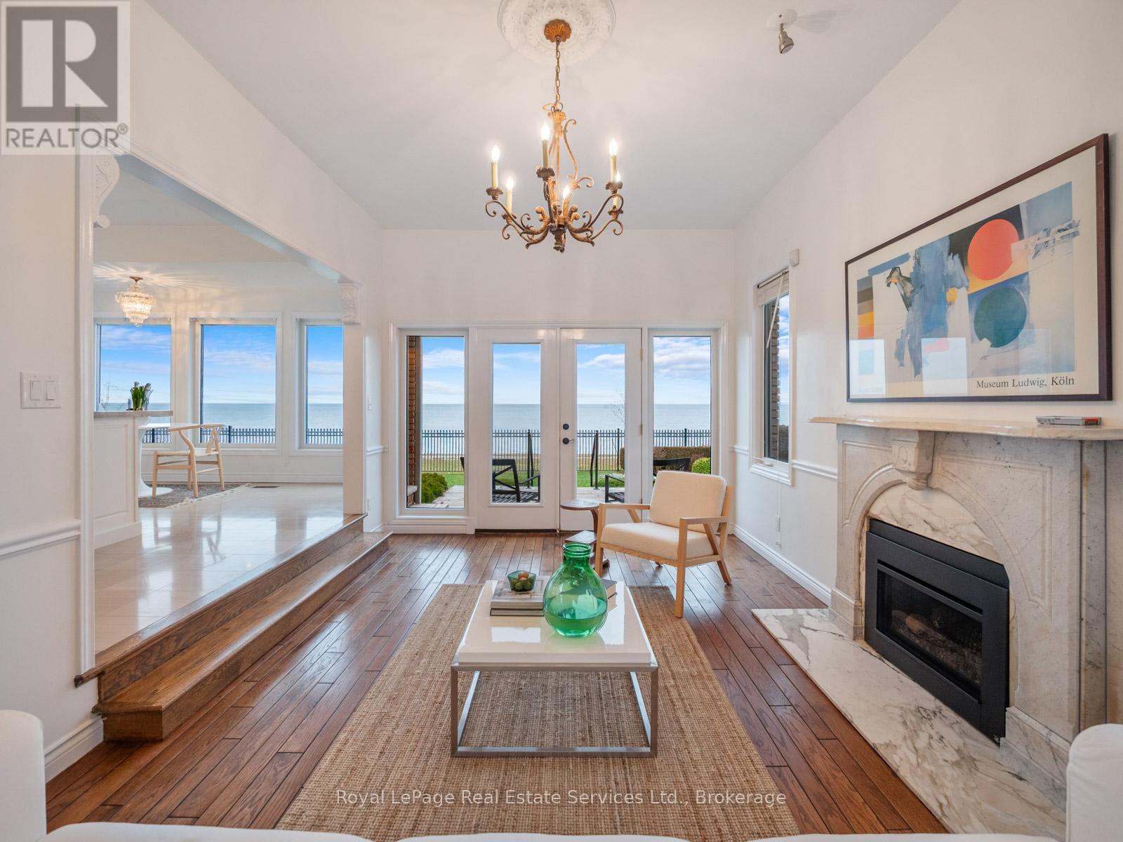 Spectacular lakefront property with 93' frontage on Lake Ontario. Located on a quiet, mature cul-de-sac, this custom built, family home offers 4+1 Bedrooms, 3.5 Baths with over 2800SF above-grade + 1400 SF Finished Lower Level. Architecturally designed with wall-to-wall windows overlooking the lake, solid brick construction with clay tile roofing, this home was built to last. 9 and 10 ceilings on the main floor. Oak hardwood floors throughout both levels. Grand entrance foyer with oak staircase. Beautiful Living Room with fabulous antique marble fireplace surround with gas insert open to Dining Room with wall to wall patio doors to the terrace with incredible lake views. Fabulous Kitchen/Breakfast Room is a blank canvas with the perfect space to install the waterfront Kitchen of your dreams. Walk-outs to both decks and open to the the Family Room with stunning marble fireplace with gas insert. The main floor features a mudroom with side entry and inside entry from full-sized two-car garage. The Primary suite features oversized windows and a walk-out to second floor balcony with outstanding lake views, luxury ensuite bathroom and walk-in closet. Two more Bedrooms overlook the lake with oversized windows. The front Bedroom opens to a bonus room above the garage which could be handy as a Den or quiet retreat. The Lower Level has excellent ceilings height, good windows and features 1Bedroom, 3-Piece Bathroom, Recreation Room, Den, Laundry Room, storage and more. Beautifully landscaped and maintained property fully fenced with wrought iron gate access to the lake. Cobblestone driveway accommodates 4 cars. Outstanding value on Lake Ontario. A must see (id:64974)