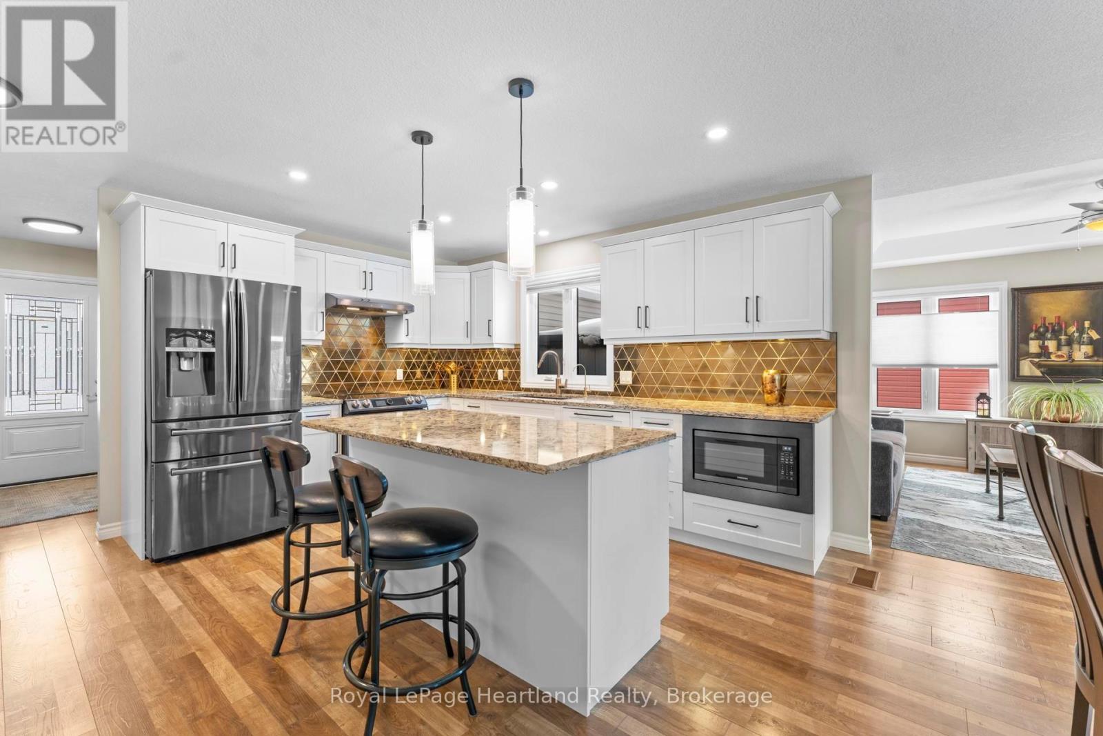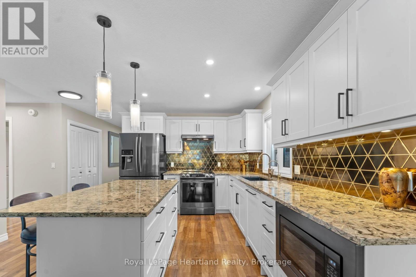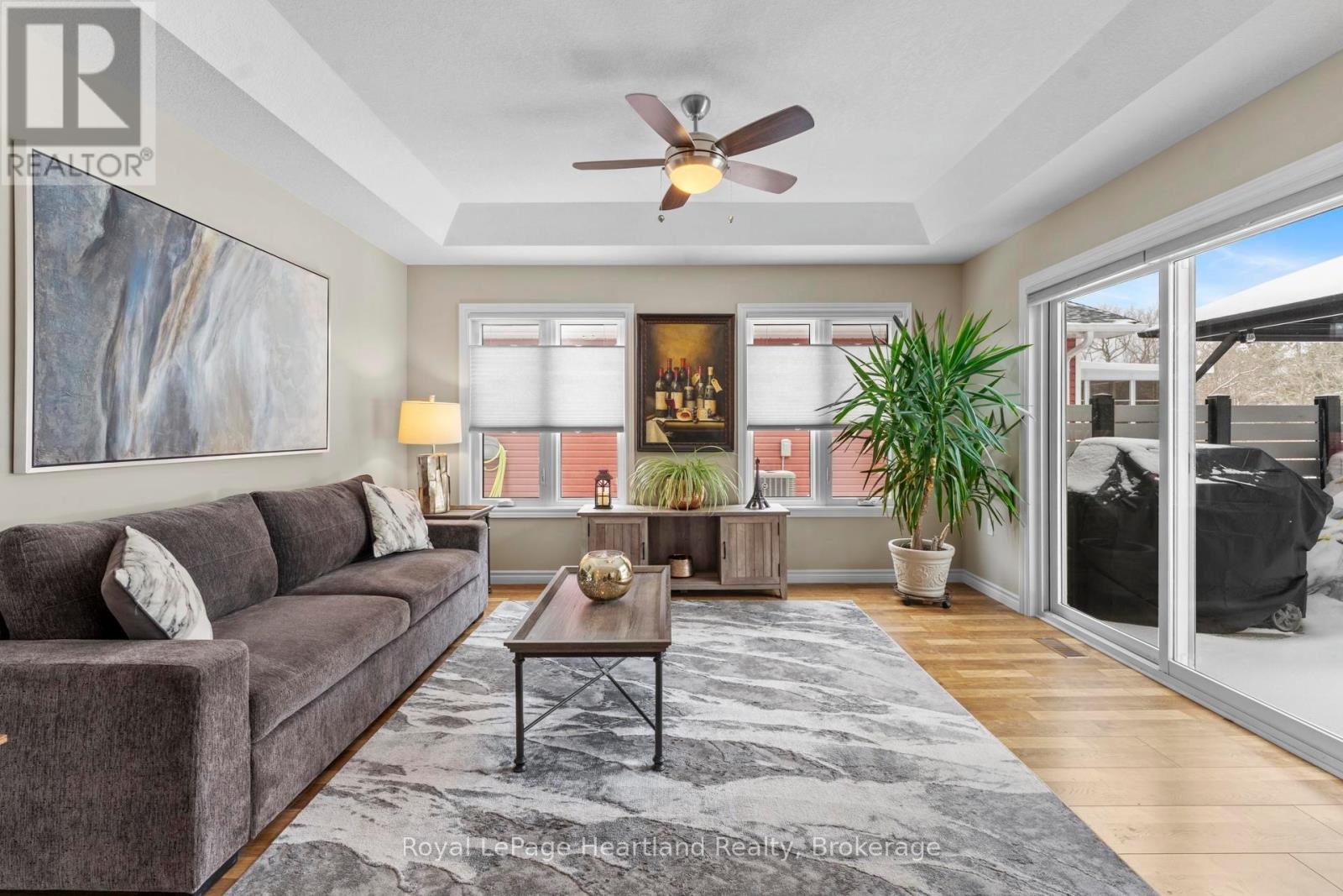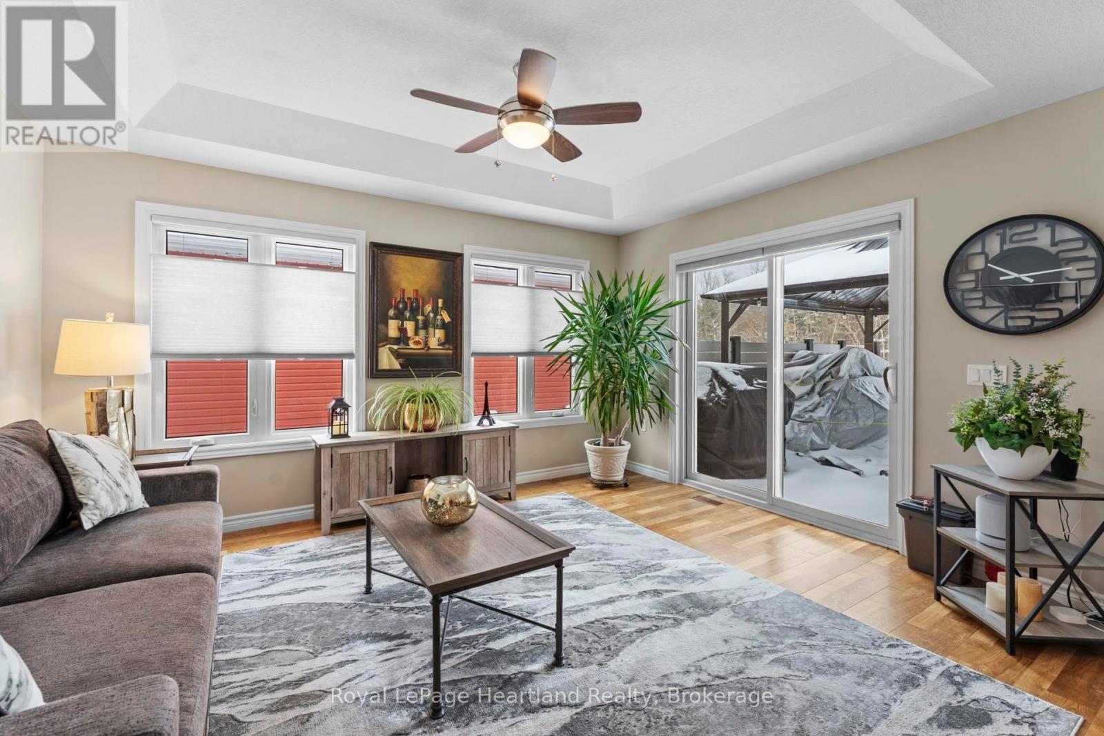 Prime location near the lake! Set in the highly sought-after Bluffs at Huron, this immaculate bungalow backs onto an open field and natural environment, offering a peaceful backdrop and privacy, while still being a short stroll to the community rec centre, lake access, and all the lifestyle perks that make this waterfront neighbourhood so desirable. This impressive "Lakeside with Sunroom" model offers approx. 1,455 sq ft of designed living space and a long list of quality upgrades. Curb appeal shines with manicured landscaping, mature trees and an inviting front porch. Inside, the bright, welcoming layout is finished with high-end continuous flooring and upgraded lighting. The custom kitchen is a standout with abundant cabinetry topped with crown moulding, soft-close doors, quartz countertops, tile backsplash, under-cabinet lighting, an enlarged centre island, built-in microwave, high-capacity range hood fan, Bosch panel dishwasher, and induction stove. The kitchen flows seamlessly into the dining area and sunroom featuring a tray ceiling and patio doors to the outdoors. Step outside to a spacious south-facing composite deck complete with gazebo, privacy wall, and a professionally installed 16' x 16' stone patio-perfect for entertaining or quiet evenings. The generous primary bedroom offers a walk-in closet and 3-piece ensuite. A second bedroom and a stylish 4-piece main bath complete the main level; both baths are upgraded with quartz counters, tile details and glass sliding shower doors. Relax in the living room beside the contemporary low-profile Solas gas fireplace with remote. Enjoy plenty of storage with multiple closets, a full crawl space, and an attached two-car garage. Bonus: six appliances included. Located in an upscale land lease community with a private recreation centre and indoor pool, close to shopping and several golf courses. Book your private showing today! (id:64974)