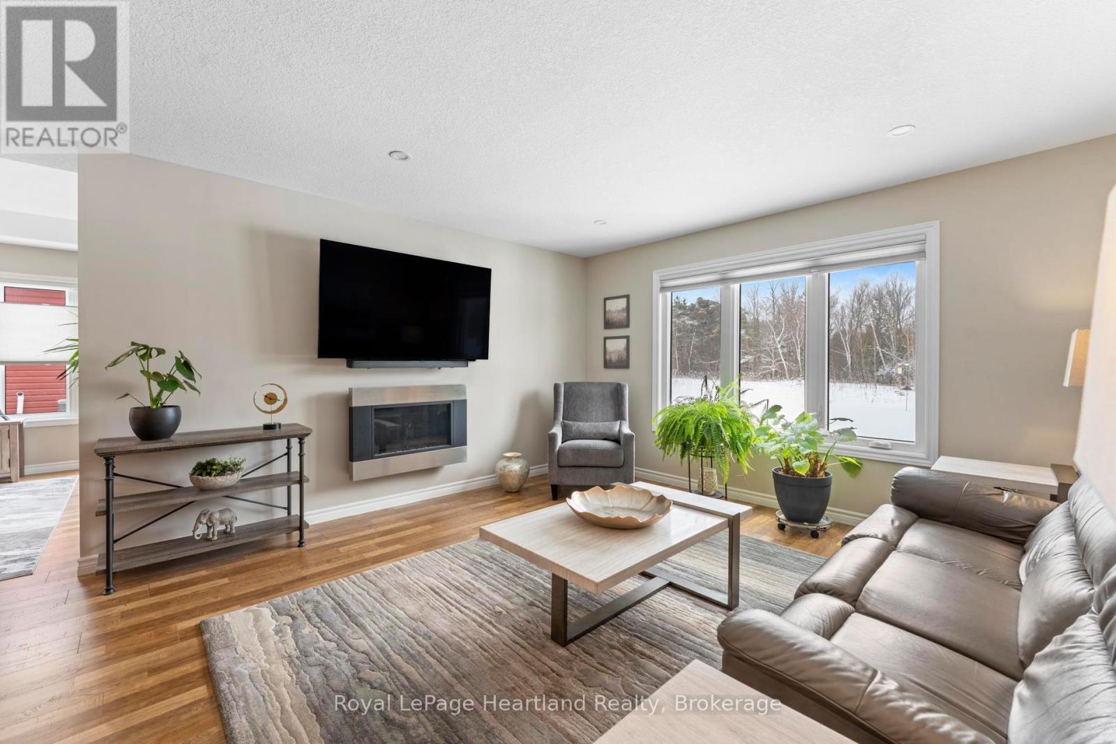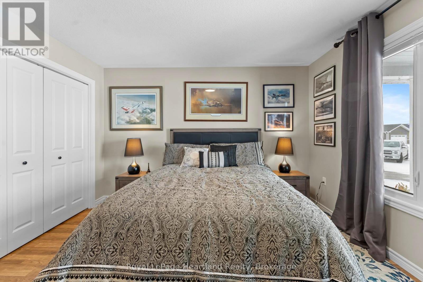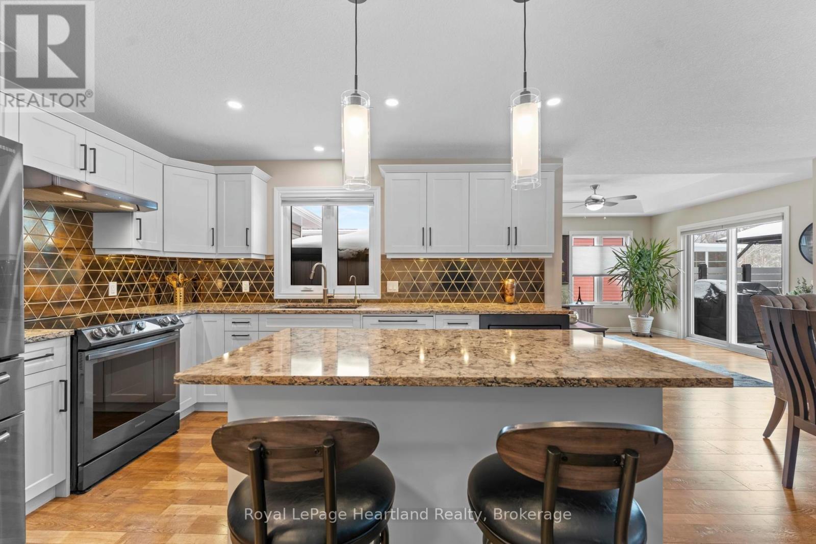 Prime location near the lake! Set in the highly sought-after Bluffs at Huron, this immaculate bungalow backs onto an open field and natural environment, offering a peaceful backdrop and privacy, while still being a short stroll to the community rec centre, lake access, and all the lifestyle perks that make this waterfront neighbourhood so desirable. This impressive "Lakeside with Sunroom" model offers approx. 1,455 sq ft of designed living space and a long list of quality upgrades. Curb appeal shines with manicured landscaping, mature trees and an inviting front porch. Inside, the bright, welcoming layout is finished with high-end continuous flooring and upgraded lighting. The custom kitchen is a standout with abundant cabinetry topped with crown moulding, soft-close doors, quartz countertops, tile backsplash, under-cabinet lighting, an enlarged centre island, built-in microwave, high-capacity range hood fan, Bosch panel dishwasher, and induction stove. The kitchen flows seamlessly into the dining area and sunroom featuring a tray ceiling and patio doors to the outdoors. Step outside to a spacious south-facing composite deck complete with gazebo, privacy wall, and a professionally installed 16' x 16' stone patio-perfect for entertaining or quiet evenings. The generous primary bedroom offers a walk-in closet and 3-piece ensuite. A second bedroom and a stylish 4-piece main bath complete the main level; both baths are upgraded with quartz counters, tile details and glass sliding shower doors. Relax in the living room beside the contemporary low-profile Solas gas fireplace with remote. Enjoy plenty of storage with multiple closets, a full crawl space, and an attached two-car garage. Bonus: six appliances included. Located in an upscale land lease community with a private recreation centre and indoor pool, close to shopping and several golf courses. Book your private showing today! (id:64974)