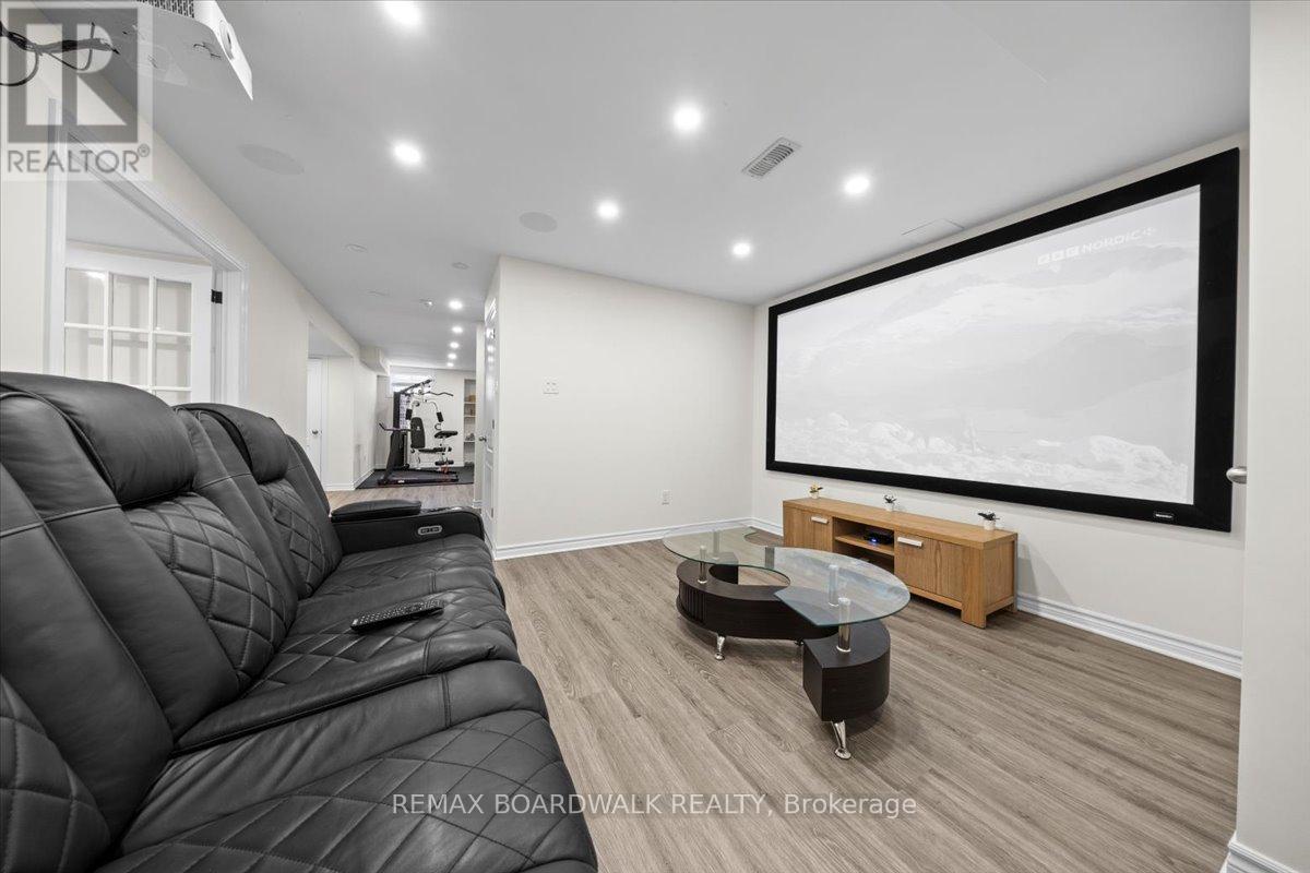 Welcome to this stunning family home offering approximately 3,000 sq ft of finished living space in Kanata. Thoughtfully designed for modern family living, this home offers generous living areas, quality finishes, and a layout that flows beautifully from room to room. The main level features rich hardwood flooring and dramatic two-storey vaulted ceilings in the living room, filled with natural light from expansive windows. A gas fireplace anchors the space and creates a warm, inviting setting for relaxing evenings or gathering with friends and family. At the heart of the home is the beautifully renovated kitchen, featuring granite countertops, custom cabinetry, stainless steel appliances, a stylish backsplash, and a large centre island. The kitchen overlooks the dining area, creating an ideal space for everyday living and entertaining. The main floor also includes a versatile bedroom or office, perfect for growing families or those working from home. Upstairs you will find generously sized bedrooms, including a spacious primary suite with vaulted ceilings, a walk-in closet, and a private ensuite with glass shower and relaxing soaker tub. The fully finished basement adds exceptional living space, including a dedicated home theatre area with projector and screen, a large recreation space, gym area, an additional bedroom, and a full bathroom, offering flexibility for guests, teenagers, or extended family. Step outside to enjoy the private fully fenced backyard, designed for low-maintenance living with full interlock and a storage shed, creating a beautiful space for outdoor entertaining and family gatherings. Interlocking has also been added to the front of the home for added curb appeal, and permanent exterior holiday lighting installed by Celebright provides both convenience and seasonal charm.Within walking distance to local schools and a future neighbourhood park, and just minutes from shopping, dining, and everyday amenities. (id:64974)