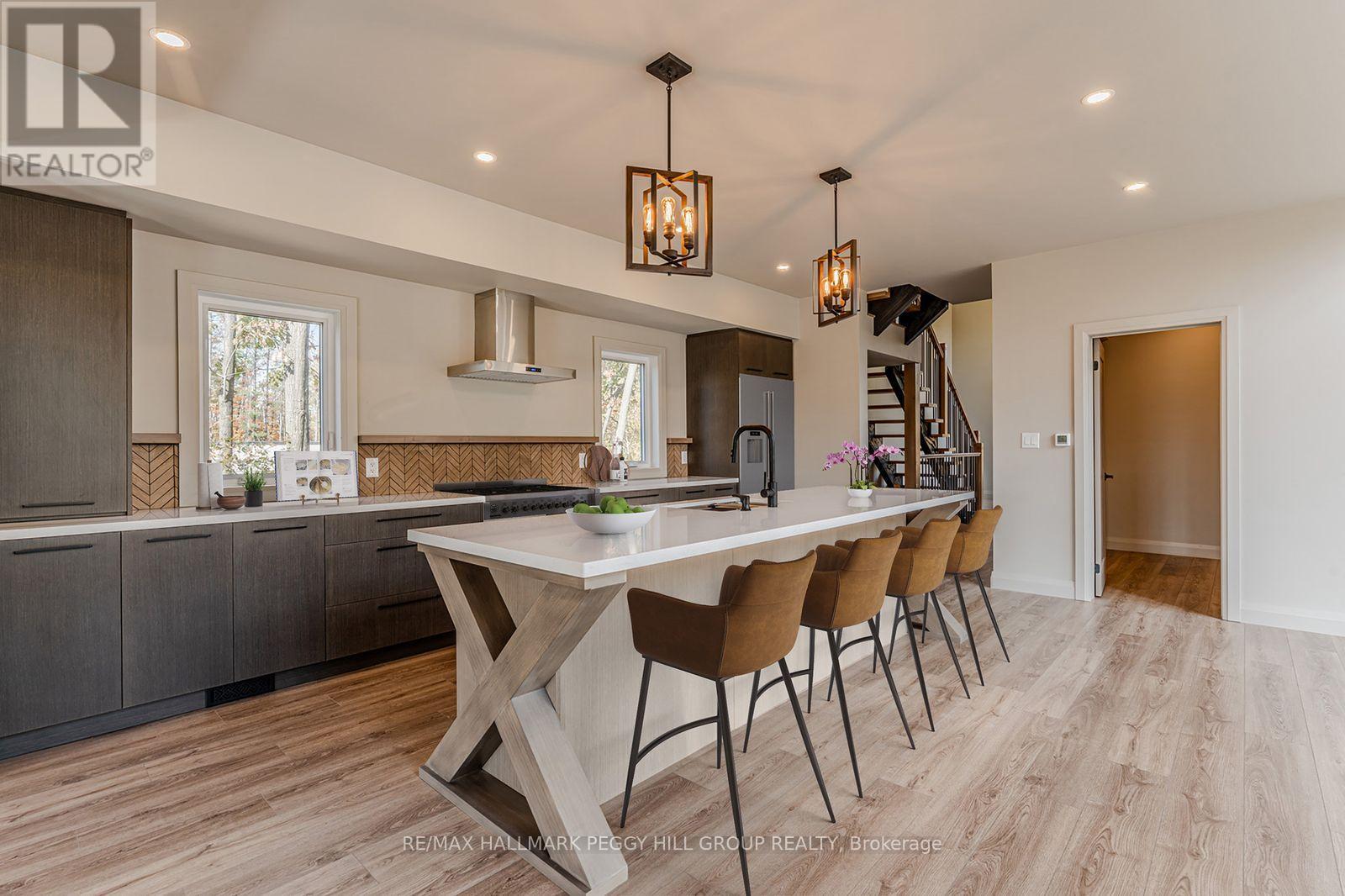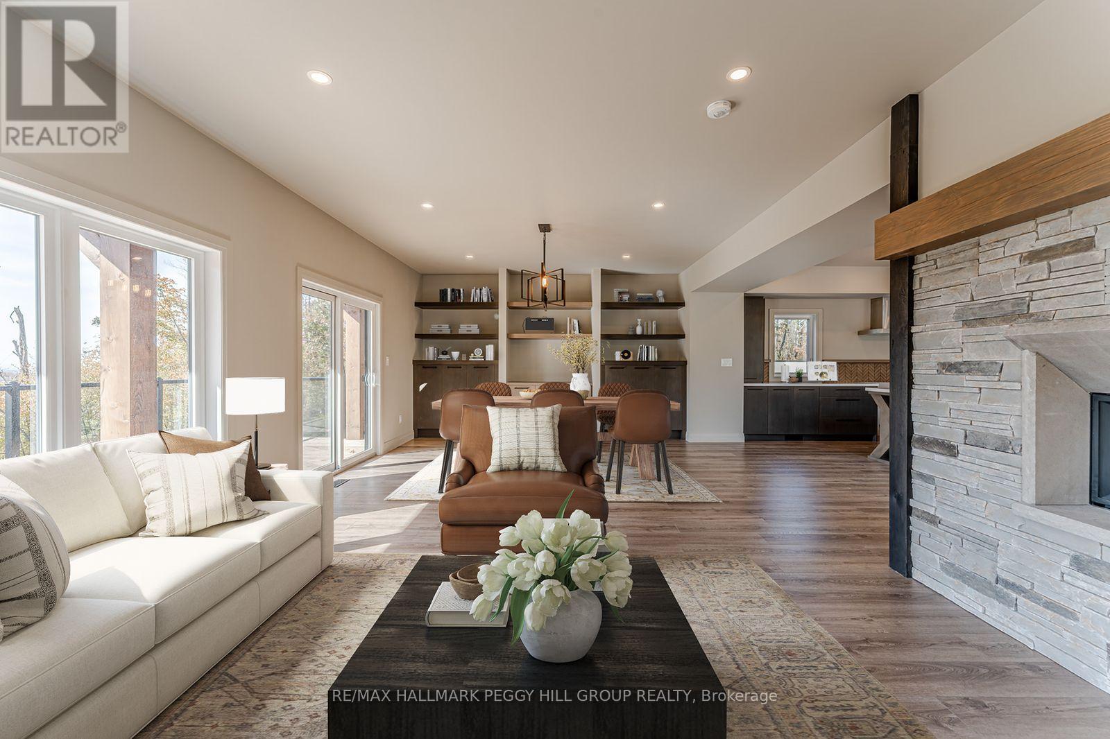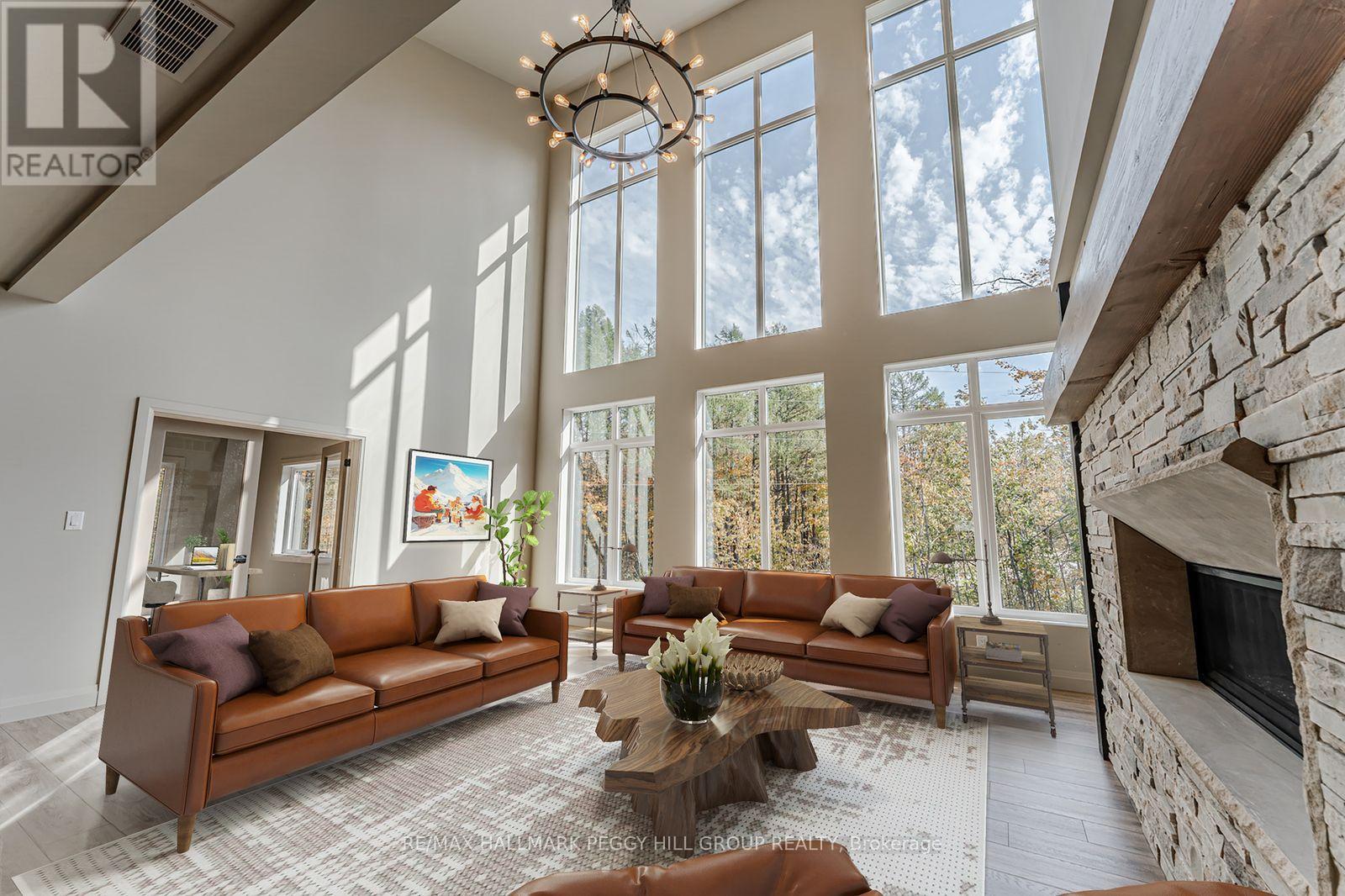 2024-BUILT 4,200+ SQ FT CHALET-STYLE RESIDENCE MEETS FOUR-SEASON ADVENTURE IN HORSESHOE VALLEY! Indulge in the artistry of modern design at this custom-built 2024 home in Horseshoe Valley, capturing panoramic western views and sunsets from its commanding hilltop setting. Boasting over 4,200 sq ft of above-grade living space, this modern chalet showcases striking black Hardie Board siding, stone facade accents, a fibreglass roof, and multiple glass-railed decks designed to celebrate the surrounding scenery. The open-concept main level is ideal for entertaining, highlighted by a 24-ft vaulted ceiling, floor-to-ceiling windows, and a double-sided Napoleon fireplace connecting the great room to the dining/family areas. The gourmet kitchen features Caesarstone quartz countertops, custom two-tone cabinetry, a dramatic X-leg island, a chevron tile backsplash, a pantry, and modern lighting, all flowing to a dining area with built-in shelving and a walkout. A private main-floor office provides a peaceful workspace, while the third level hosts the luxurious primary suite with its own fireplace, balcony, walk-in closet, and spa-inspired ensuite with a freestanding tub, double vanity, and glass shower, along with two additional bedrooms, a full bathroom, and a laundry room. The ground level extends the home's versatility with 9'9" ceilings, a bright rec room, an additional bedroom, and a full bathroom. Engineered hardwood, ceramic tile finishes, and meticulous craftsmanship are complemented by superior construction featuring an ICF foundation, LVL beams, and double-studded 2x6 walls. Within walking or golf cart distance to Horseshoe Resort, The Valley Club, tennis courts, and scenic trails, and just minutes to Vetta Nordic Spa, Copeland Forest, Lake Horseshoe, local dining, and Highway 400, this exceptional home is also near a new school, community centre, clinic, and fire station, defining sophisticated four-season living in one of Ontario's most prestigious destinations. (id:64974)