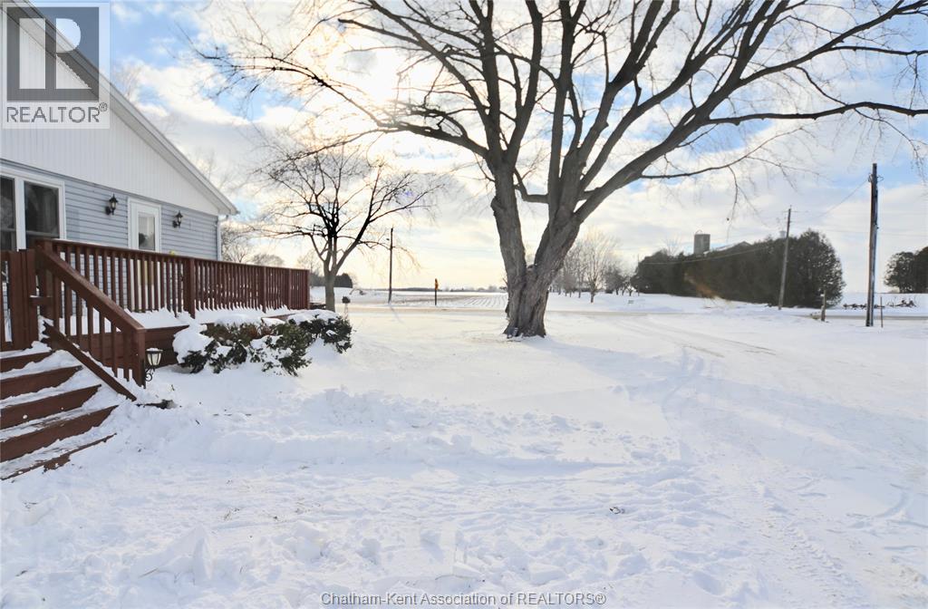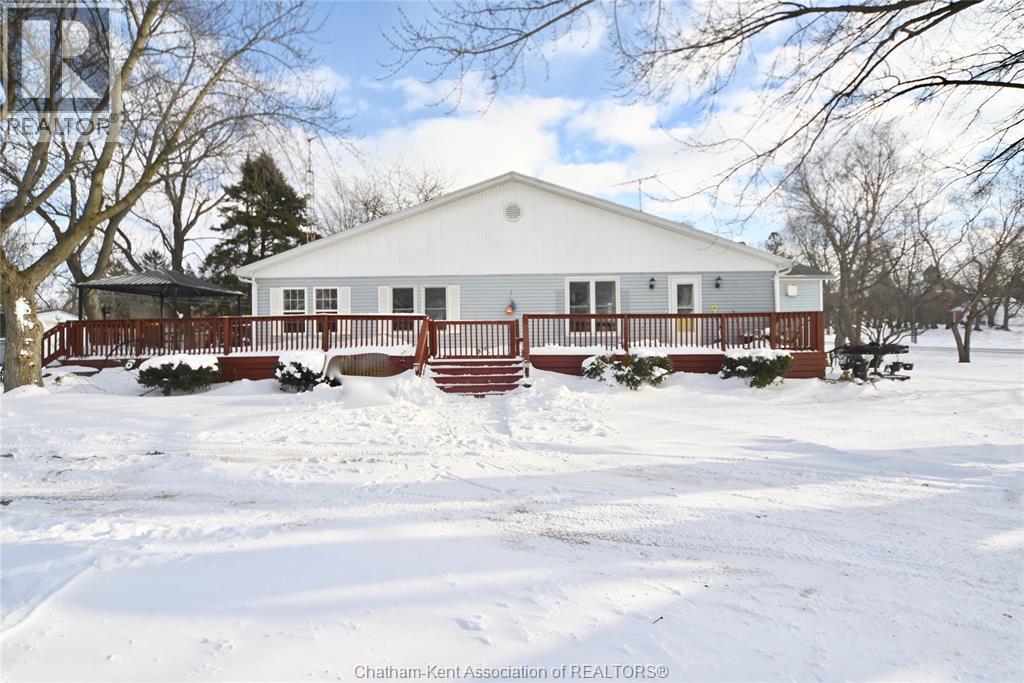 This 3.58 acre beauty on the outskirts of the quiet village of Highgate is full of pleasant surprises. Seeing the home from the road, you would have no idea about the back field, currently rented as farmland, a wide open space for your country property dreams to come true. There's the double car insulated garage/workshop, multiple sheds for more storage, a fenced area off the fully gated wraparound deck that's perfect for kids and/or dogs, and last, but certainly not least, the 3 bedroom, 2 bathroom home that's welcoming you in! Well-kept and updated over the years as loving owners saw fit, the vaulted ceilings, large windows and skylights give this place airy brightness. The open concept has a lovely feel and the oak kitchen with large island breakfast bar is attractive, with built in appliances and lots of cabinet space. Big enough for families and not too much for retirees or starters, it’s comfy one level living with 3 bedrooms, but the huge back master with patio doors off to the deck is also an ideal family room if only 2 are needed. Enjoy the convenience of a paved road location and natural gas, plus the ideal location only a minute to 401 access, 25 minutes to Chatham and 55 minutes to London. Enjoy deep well water too, with this property supplying 3 other properties to the north. This is the perfect blend of country living, but with affordability and convenience included! (id:64974)