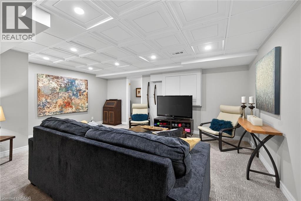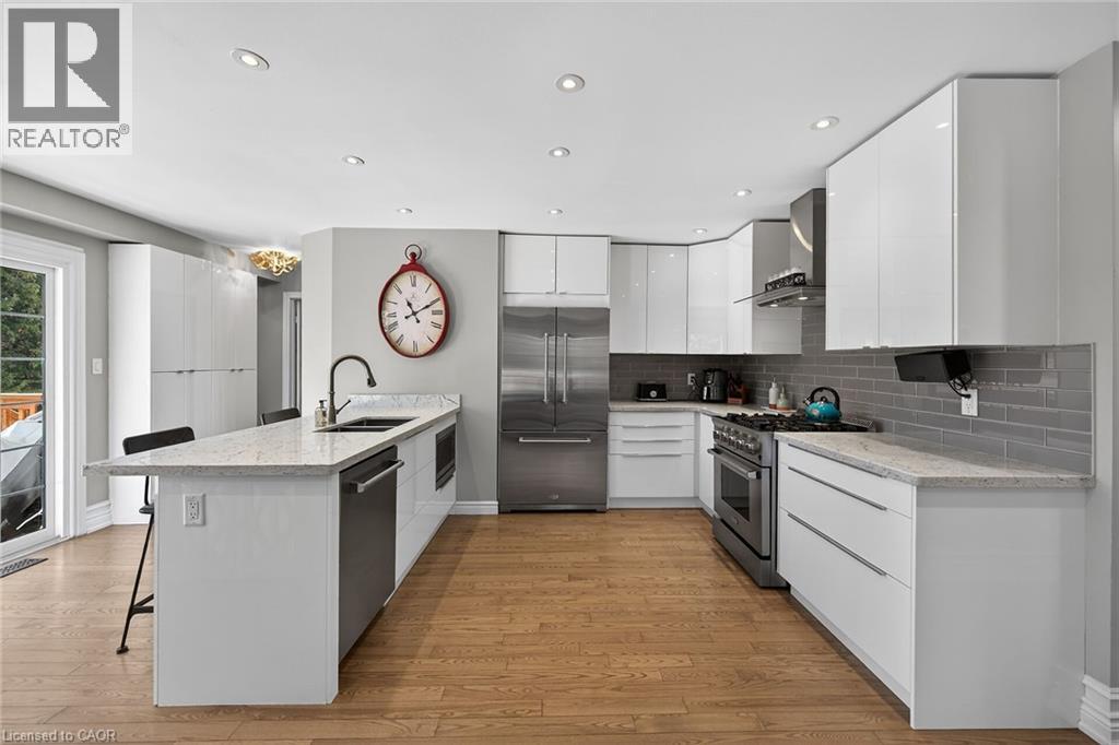 Spacious 2-storey end-unit condo townhouse providing 2946 sq ft of beautifully updated living space in sought-after Ancaster. This bright and airy home features vaulted ceilings, oversized windows and an abundance of skylights, filling the interior with natural light. Thoughtfully designed layout includes a ground-floor family room with cozy gas fireplace, as well as separate living and dining rooms ideal for entertaining. Elegant ash flooring runs throughout the first and second floors. The stunning renovated kitchen showcases white high-gloss cabinetry, a full pantry wall, premium quartz countertops, glass backsplash, pot lights, and top-of-the-line stainless steel AGA appliances. The basement was renovated in 2020, featuring a spacious recreation room, office space, additional bedroom, and a large 3-piece bathroom. A rare opportunity to enjoy spacious, low-maintenance living (including snow removal from driveway and walkway), close to highway access, shopping, and amenities in one of Ancaster's most desirable neighborhoods. RSA. SQFTA. (id:64974)
