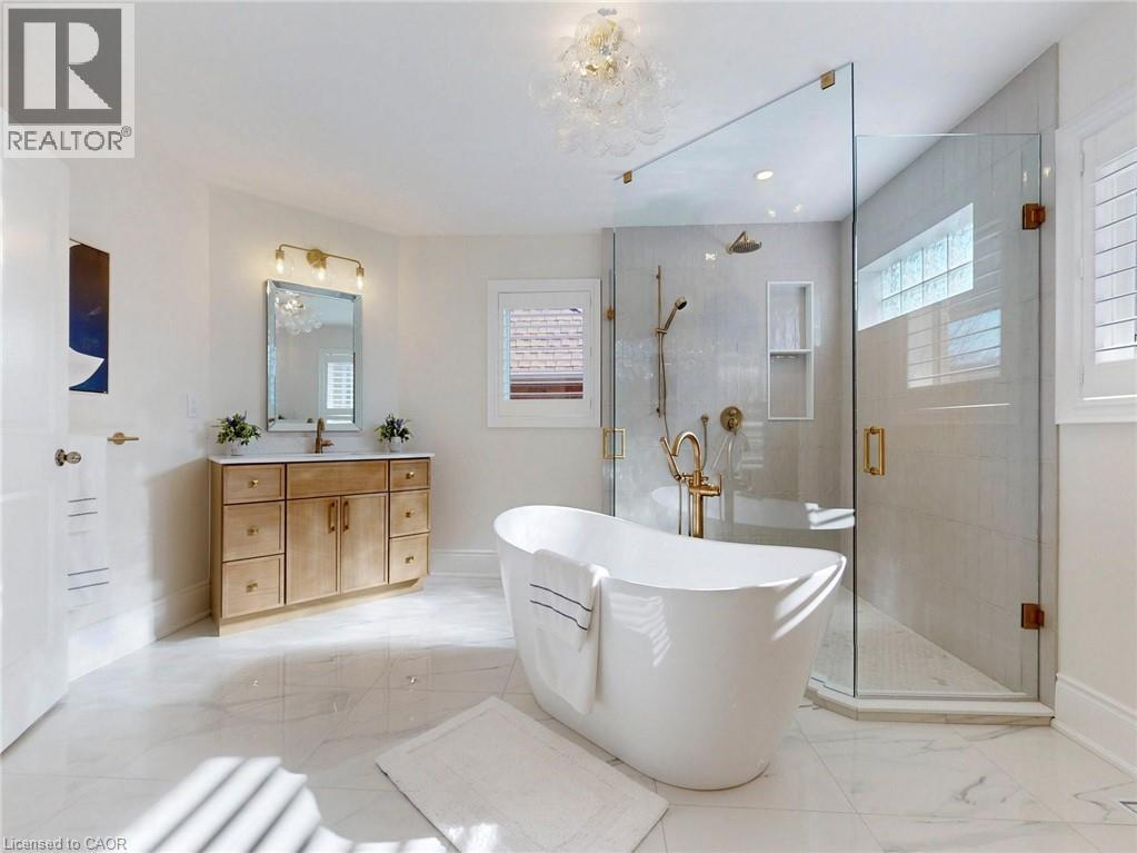 A truly one-of-a-kind home nestled on a premium pie-shaped lot in Oakville’s sought-after Lakeshore Woods. This Rosehaven built gem features a unique design thoughtfully created by the original owners, making it one of the most distinctive properties in the neighbourhood. Step inside to soaring ceilings—10ft on the main floor, unique in the neighbourhood—paired w/ updated h/w floors on main level (2025) & freshly painted interiors (2025) that enhance the home’s grand scale. Dramatic 19ft foyer sets an elegant first impression. Bright family room w/ large bay window flows seamlessly into the formal dining area. Great room features a gas FP w/ updated mantel, potlights, & access to balcony overlooking the backyard. Open kitchen shines w/ new backsplash, updated S/S appliances, & bright breakfast area. Separate office opens onto covered patio deck, offering peaceful space to work while enjoying the view. Upper level offers 4 spacious bedrooms, including primary suite w/ 2 walk-in closets & brand-new 5pc ensuite. Bedroom 2 has its own fully updated 3pc ensuite, while the other 2 bedrooms share a 4pc Jack & Jill bath. All upper-level bathrooms updated in 2025. Upper-level laundry includes new washer & dryer, & hallway loft completes the level. Fully finished basement offers in-law suite potential w/ 9ft ceilings & separate side entrance, featuring massive recroom that can accommodate an additional bedroom, kitchenette, games/fitness area, along w/ full bathroom, laundry, & plenty of storage. Outdoor living w/ 2 balconies overlooking the backyard, multiple seating areas, mature landscaping, & sun-soaked patio provides seamless indoor-outdoor flow. Additional features: attached 3-car tandem garage, brand-new plumbing, & 90% of lighting fixtures replaced. Steps to the lake & Shell Park, close to top schools, w/ convenient access to major amenities. This exceptional property combines luxury, functionality, & rare location, offering a truly outstanding opportunity in Oakville (id:64974)