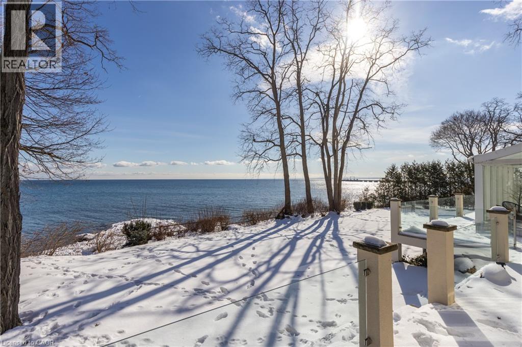 **Stunning Waterfront Living on Lake Ontario ** Nestled along the shores of Lake Ontario with approximately 100 feet of lake frontage, this exceptional 4+1 bedroom, 3+1 bathroom residence offers an unparalleled lifestyle. A tree-lined driveway welcomes you to this tranquil retreat, where grand entry doors open to a light-filled interior accentuated by expansive windows and skylights throughout. The open-concept Living Room showcases remarkable architectural detail in the skylights, highlighted by a double-sided wood-burning fireplace shared with the breakfast area and kitchen. The spectacular custom kitchen features granite countertops, premium appliances, and a walkout to the sunroom—all commanding unobstructed lake views. The separate dining area is perfect for a more formal evening with family and friends. The principal bedroom provides a five-piece ensuite, walk-in closet, and direct walkout to the backyard overlooking the water. The second bedroom offers deck access with stunning lake vistas, while a versatile third bedroom and loft-level fourth bedroom complete the main living spaces. The finished lower level encompasses a family room, recreation area with wood stove, additional bedroom, laundry, and two-piece bath. This unique property delivers breathtaking waterfront views without the added expense of maintaining a seawall. Conveniently located near Shell Park, the waterfront trail, Burloak Waterfront Park, and Appleby GO Station, this residence represents an extraordinary opportunity for discerning buyers. LUXURY CERTIFIED (id:64974)