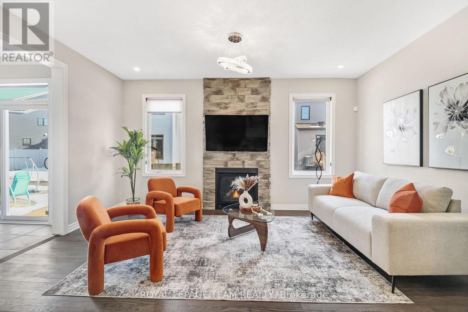 335 Soldats Riendeau Street welcomes you, offering you the perfect blend of space, comfort, and efficiency. Featuring 4 bedrooms, 3.5 bathrooms, and a double-car garage, this beautifully maintained property is enhanced with an extensive solar panel system, providing long-term energy savings, a low carbon foot-print and added value. Step inside to a bright and inviting foyer complete with a convenient closet and powder room. The main floor showcases a spacious dining area ideal for hosting, flowing seamlessly into a warm and welcoming family room highlighted by a cozy fireplace. The heart of the home is the impressive kitchen, featuring rich chestnut style cabinetry, granite countertops, stainless steel appliances, a breakfast bar, and a charming breakfast nook with direct access to the backyard. The low-maintenance British-style back-garden is fully paved, offering endless opportunities to create your perfect outdoor retreat. Upstairs, the primary suite offers a large walk-in closet and a spa-like 4-piece ensuite complete with a soaker tub. A convenient laundry room is tucked away just off the stairway, making daily chores effortless. Two additional generously sized bedrooms share a modern 3-piece family bathroom, while the fourth bedroom features its own private 3-piece ensuite. The finished lower level offers a spacious recreation room with LVP flooring, complemented by an additional 3-piece bathroom-ideal for extra living space or hosting guests. Located next to Black River Park and close to Wazoson Public School and Barrhaven-Manotick French elementary public school. This home is perfect for families seeking comfort, convenience, and an eco-conscious lifestyle. (id:64974)