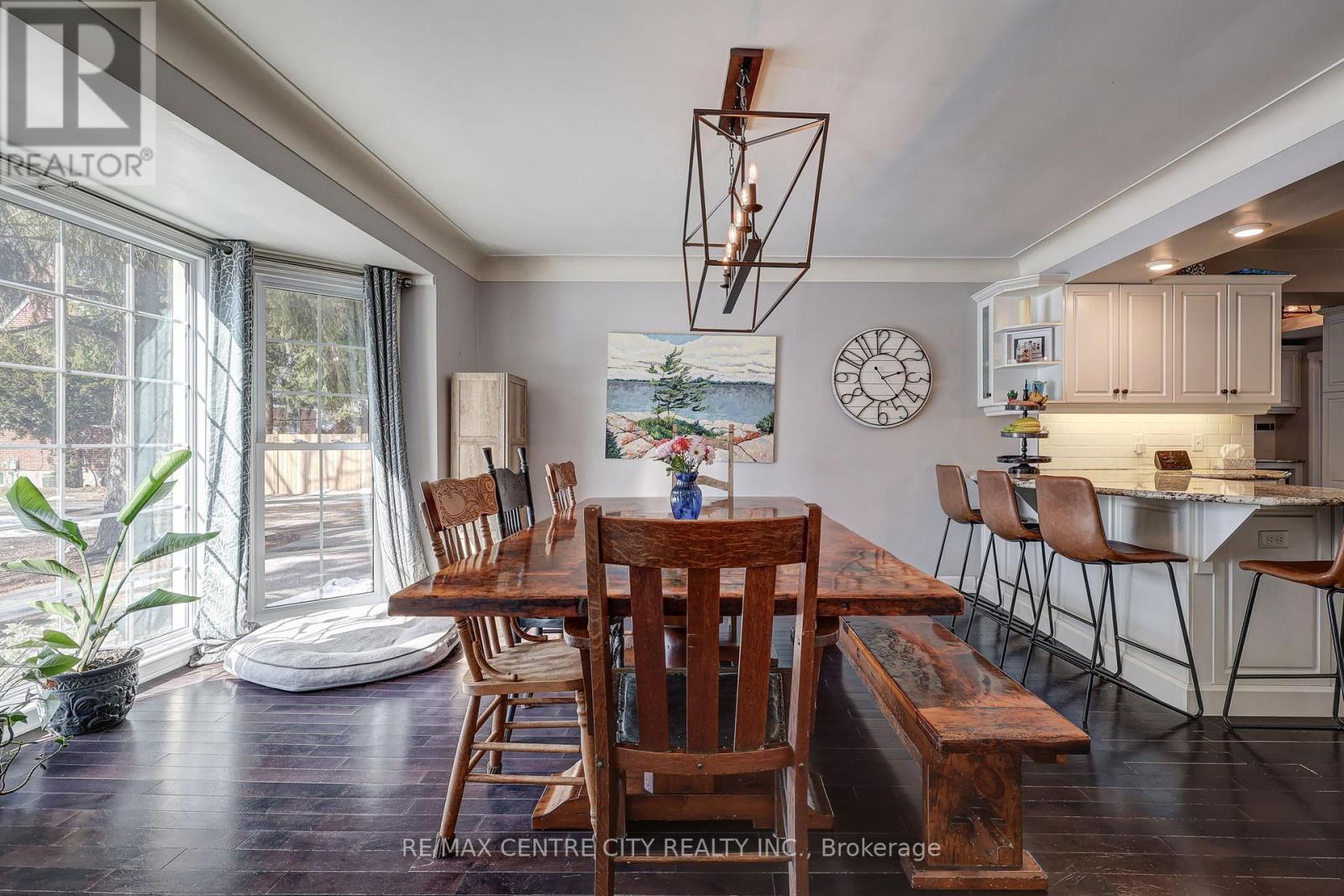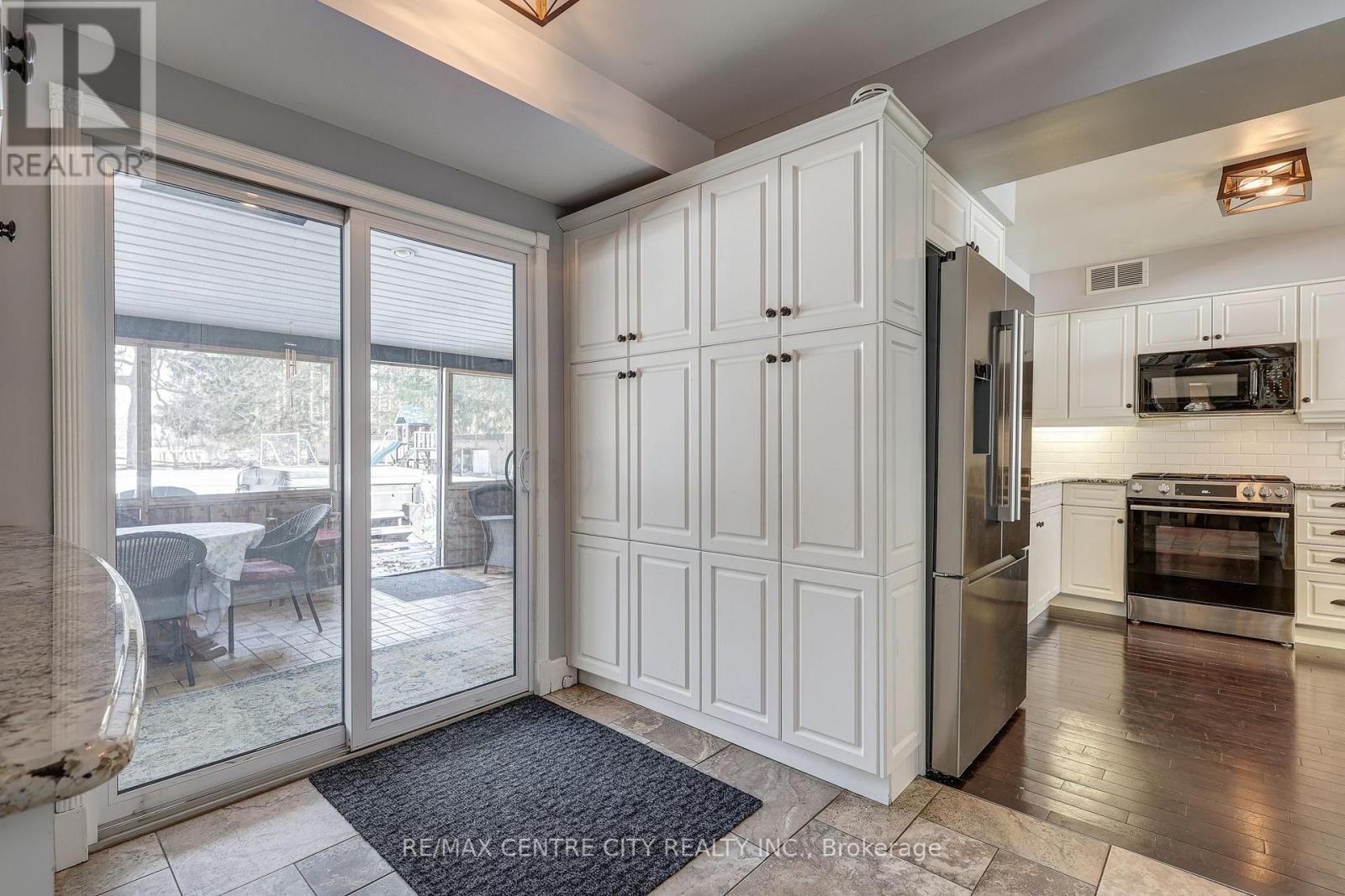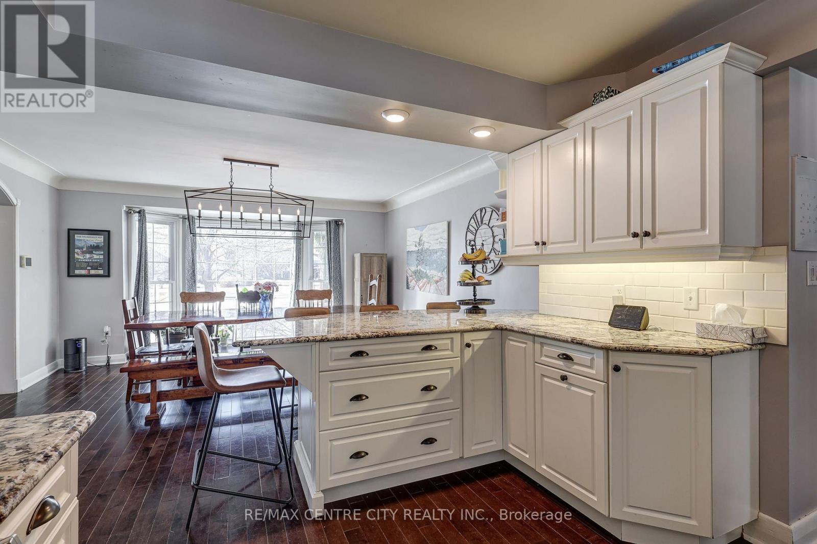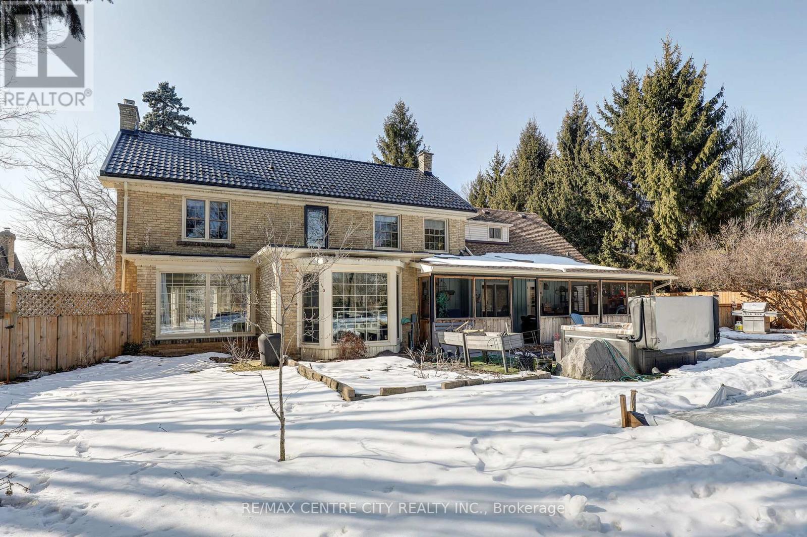 This classic yellow brick 2 storey home offers stunning curb appeal and a timeless exterior beautifully complemented by modern updates. Situated on a l-shaped 0.95 acre lot, the property provides a private, peaceful setting nestled among mature trees and thoughtfully designed landscaping. Ideally located just minutes from Port Stanley and with easy access to Wellington Road. This oversized family home blends convenience with tranquility. Inside, you'll find a spacious and functional layout featuring four generously sized bedrooms and 3.5 bathrooms. The primary master suite is complete with a luxurious ensuite featuring a heated floor. The bright living room is filled with natural light from large windows and anchored by a cozy gas fireplace. A generous dining area provides the perfect space for entertaining, while the inviting main floor layout is enhanced by large windows that allow for natural light throughout. The updated modern kitchen showcases granite countertops, a peninsula with breakfast bar and a clean, modern finish. A main floor office adds flexibility for those working from home. Peaceful evenings can be enjoyed in the charming cedar sunroom. A warm and inviting space to relax and take in the surrounding views. Extensive updates provide both style and peace of mind, including remodelled kitchen and bathrooms, soffit and fascia, A/C, furnace, durable metal roof, new flooring in bedrooms and bathrooms, and updated windows. (id:64974)