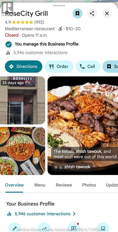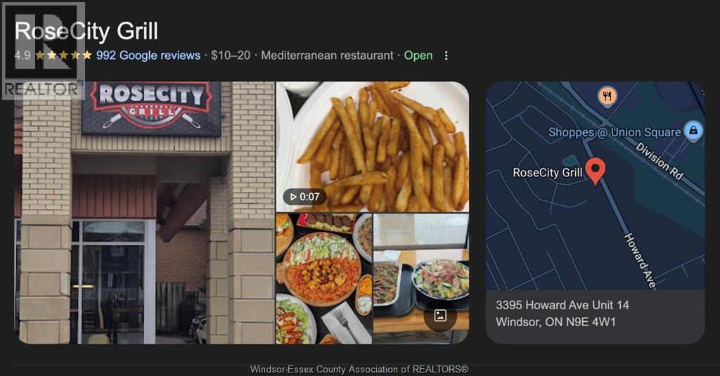 Turnkey restaurant business for sale – RoseCity Grill, featuring strong online presence with a high number of Google reviews and a well-followed social media account, offering immediate brand recognition and built-in customer trust. Ideally located on busy Howard Avenue in Windsor within a high-traffic commercial plaza just minutes from Devonshire Mall and surrounded by major retail centres, national brands, and dense residential neighbourhoods. This fully built-out restaurant space allows a new owner to step in and operate immediately without costly build-out delays. New lease terms to be negotiated with the landlord as the current lease expires shortly. Ideal opportunity for restaurateurs or entrepreneurs looking to take over the reins, with the full business sale including the existing concept and menu. A chattels-only sale may also be negotiable for buyers looking to introduce their own concept in this proven restaurant location. Chattel list and more information available upon request. (id:64974)