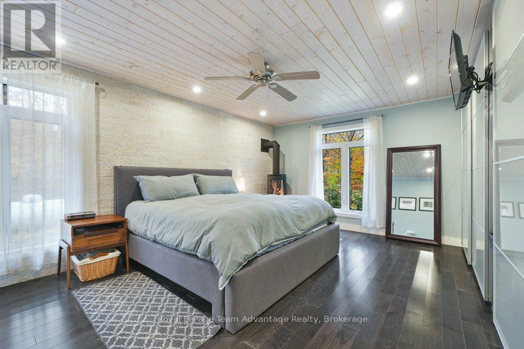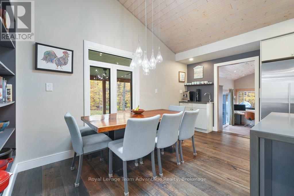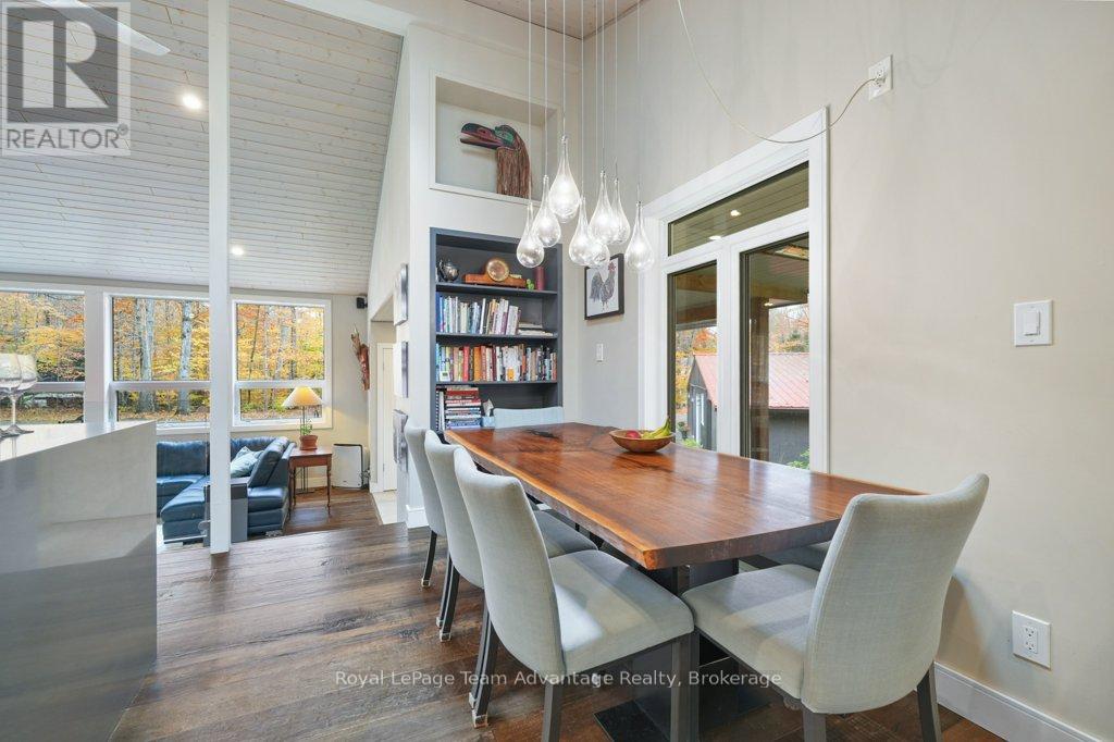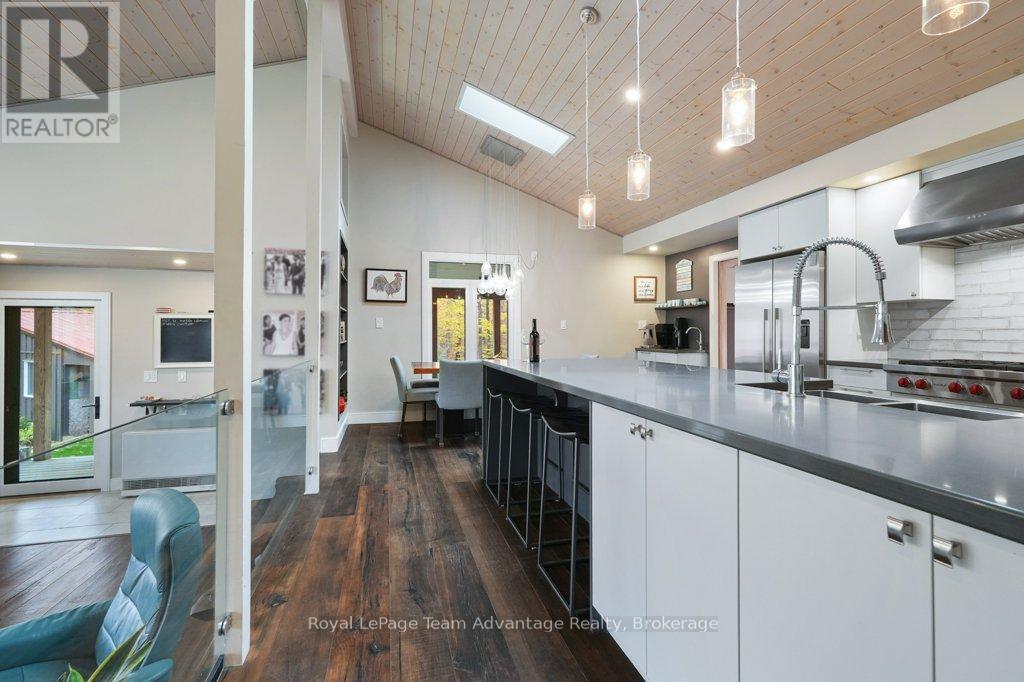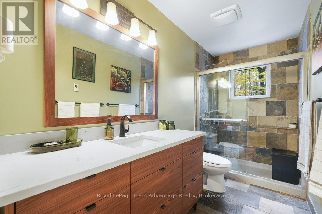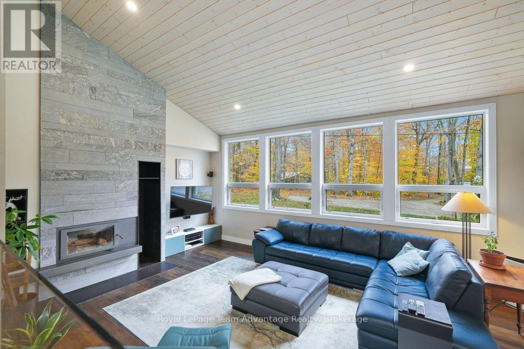 Welcome to your year-round home on beautiful Hooton Lake - a quiet, non-motorized lake perfect for peaceful living and time spent in nature. Set on 2.84 acres with 243 feet of shoreline this 3-bedroom, 2-bathroom property features a rare combination of privacy, comfort and lakeside charm. Built in 1990 and thoughtfully updated, the home features a chef-style kitchen with island ideal for entertaining and a sunken living room with a high efficiency wood burning fireplace. A cozy family/sunroom with propane fireplace, expansive windows and a walkout to the deck - creating an effortless indoor/outdoor area with covered area with infrared heaters, generous decking and a swim spa for year-round relaxation, exercise or just relax in the hot tub end of the spa. The landscaped grounds include your own private beach-perfect for morning swims, paddle boarding or soaking up the sun. A Generac generator adds peace of mind, while a detached garage & bunkie add plenty of space for toys, gear and guests. Ideal for family living or weekend escapes. Whether you're enjoying quiet mornings by the lake, hosting friends on the deck or unwinding in the swim spa this Hooton Lake home delivers comfort, nature and four-season enjoyment. Located in Seguin close to Parry Sound and all amenities. Home is calling, it's ready for you to settle in and start making memories. (id:64974)