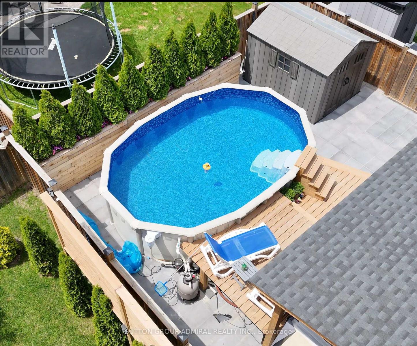 Welcome to this beautifully maintained 3-bedroom, 3-bathroom home located in a desirable Alliston neighborhood. The home features a newly asphalted driveway with an elegant interlock border, with additional interlock extending along the side of the house and leading to the backyard. Inside, enjoy a bright and open main floor offering a spacious family room and a modern kitchen complete with stainless steel appliances and a stylish backsplash. One of the children's bedrooms includes custom-built, full-size bunk beds with individual lighting, offering both functionality and charm. Step outside to a stunning backyard oasis featuring a multi-level deck, paved patio, above-ground swimming pool, and a four-season hot tub that can be enjoyed year-round-even in winter. A convenient storage shed adds extra practicality. (id:64974)
