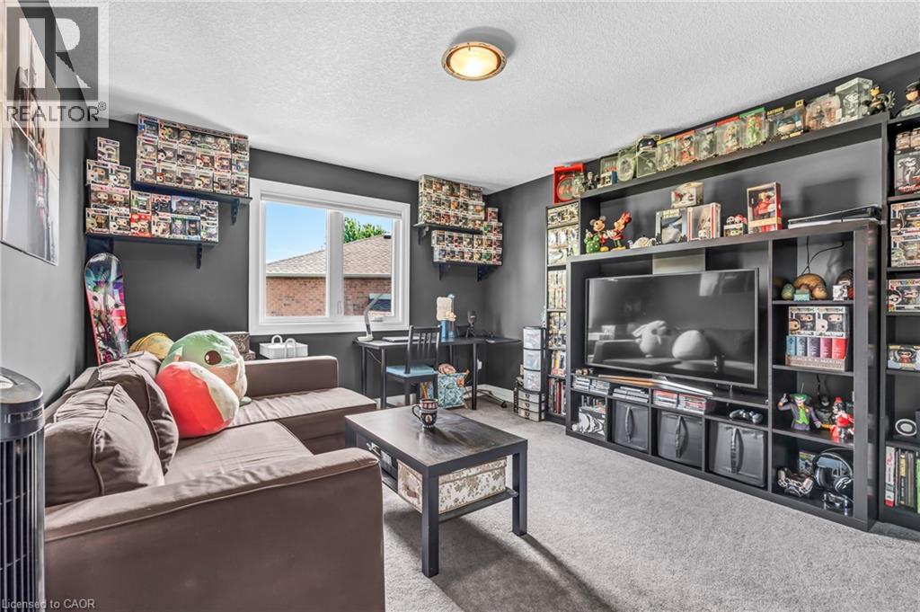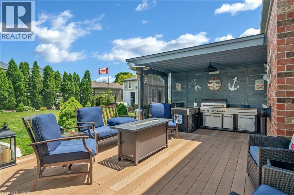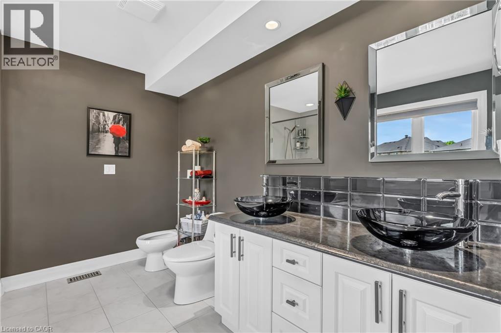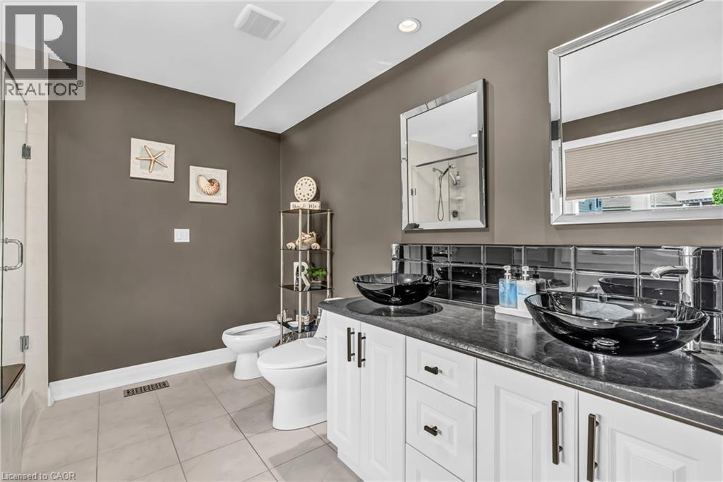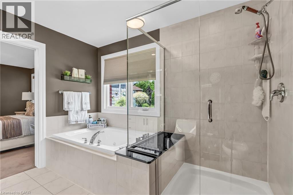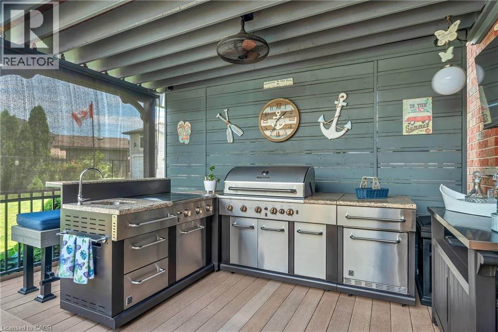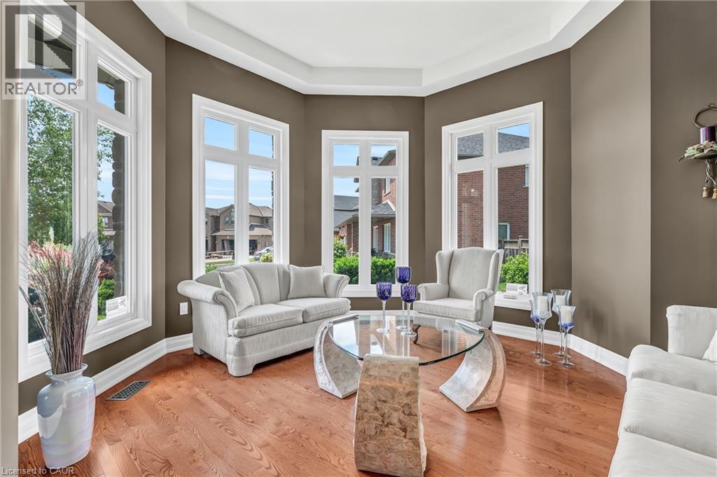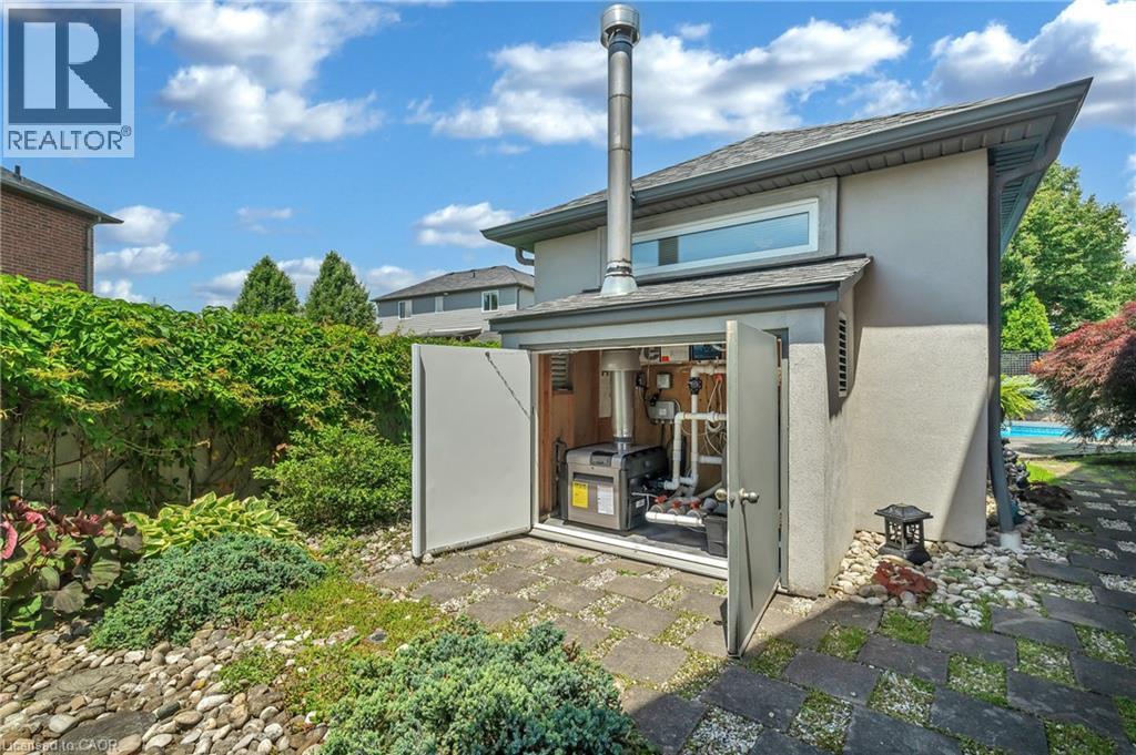 Custom-built home with over 5000 sqft of finished living space, meticulously maintained by original owners. It offers 2 primary bedrooms, as well as a full in law suite, ideal for a multi generational family. Situated on an oversized pie shaped lot, 10 min to Upper James shopping. This stunning property boasts a wide stamped concrete drive w/ parking for 4 vehicles + oversized double car garage, 11 ft in height, w/ 9 foot high garage doors, perfect to accommodate a car lift. Main floor features a dream kitchen with custom cabinetry, quartz countertops, extra large sink & eating area with oversized patio door leading to the backyard oasis. Main floor primary bed w/ walk in closet & 6pc ensuite. Bright & spacious 2 storey family rm w/ natural gas fireplace, separate living & dining room, bed/office, 2 pc bath & main floor laundry off of the garage. The upper level offers a family room, 3 bedrooms, including 2 that offer ensuites & walk in closets. Fully finished basement has a full kitchen with dining area, rec room, bed w/ ensuite privilege to 3pc bath, office, workshop, 2nd laundry rm, + hot tub & hobby room. Gorgeous backyard featuring inground saltwater pool with new heater, stamped concrete surround, Trex decking on patio & in the covered outdoor kitchen area, outdoor speakers & oversized custom shed. 4 season sunroom is the perfect place to relax. Recent updates include pool heater 2025, roof shingles 2020, shed & sun rm shingles 2022, furnace & A/C 2023.This home must be seen! Luxury Certified. (id:64974)