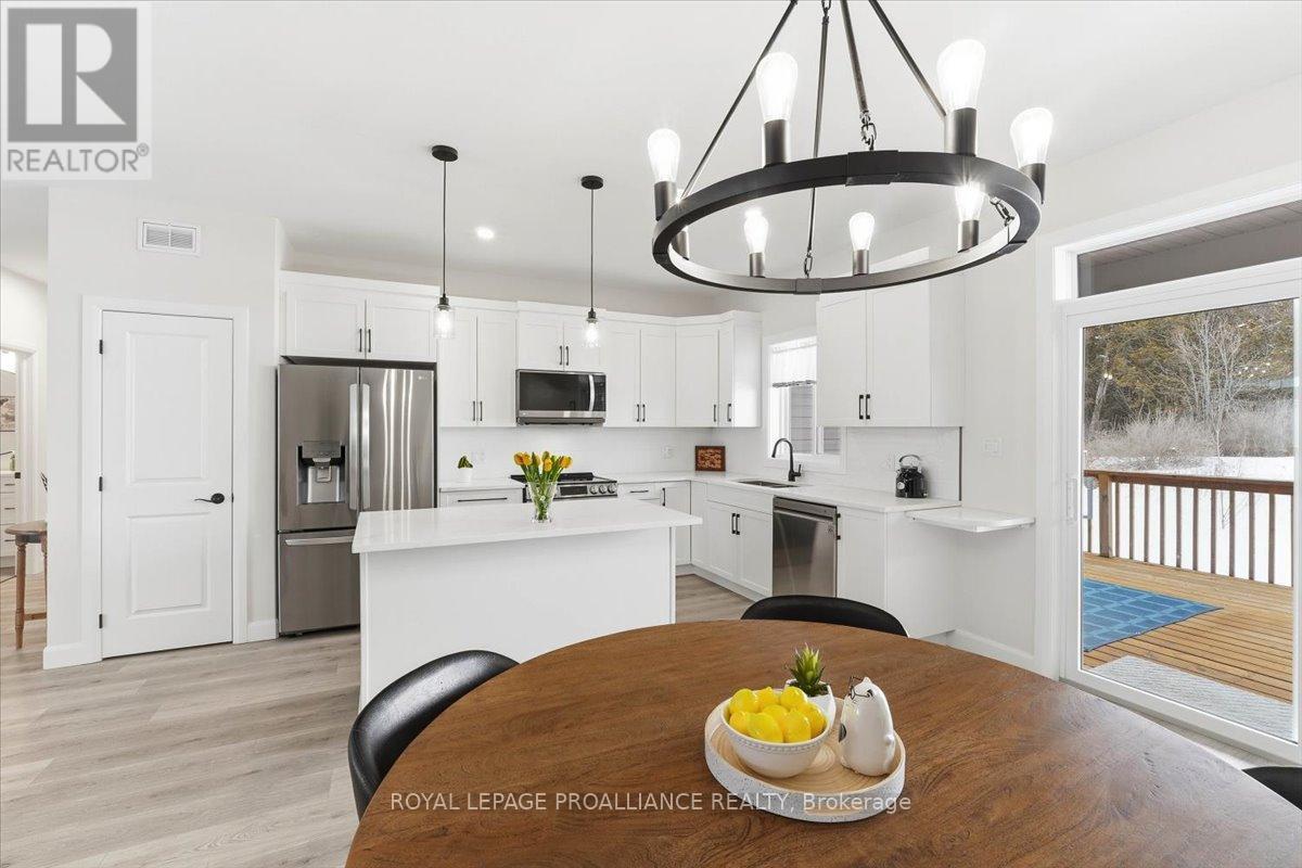 Welcome to 34 Rosewood Drive! This beautifully maintained 2.5-year-old bungalow is located in the desirable Rosewood Acres subdivision. Offering over 2,800 sq. ft. of finished living space, this home is thoughtfully designed for both everyday comfort and entertaining.The main floor features three bedrooms and two full bathrooms, including a spacious primary bedroom with walk-in closet and a private en-suite showcasing a spacious ceramic shower. The classic white kitchen is finished with quartz countertops, a centre island, pantry, and flows seamlessly into the dining area with access to an oversized (12x19) covered deck-perfect for indoor/outdoor living.The living room is warm and inviting with a cozy fireplace, while the near fully finished lower level adds exceptional versatility with two additional bedrooms, a full bathroom, and a generous recreation room complete with a second fireplace.Additional highlights include a double car garage, paved driveway, and professionally landscaped yard featuring an interlock walkway leading to the front door and retaining stone flower beds. This home shows to perfection and remains covered under Tarion warranty.A fantastic opportunity to own a move-in-ready home in a sought-after neighbourhood. Frankford offers all amenities and is only15 minutes to Trenton. Don't forget to check out the floor plan and 3D virtual tour (id:64974)
