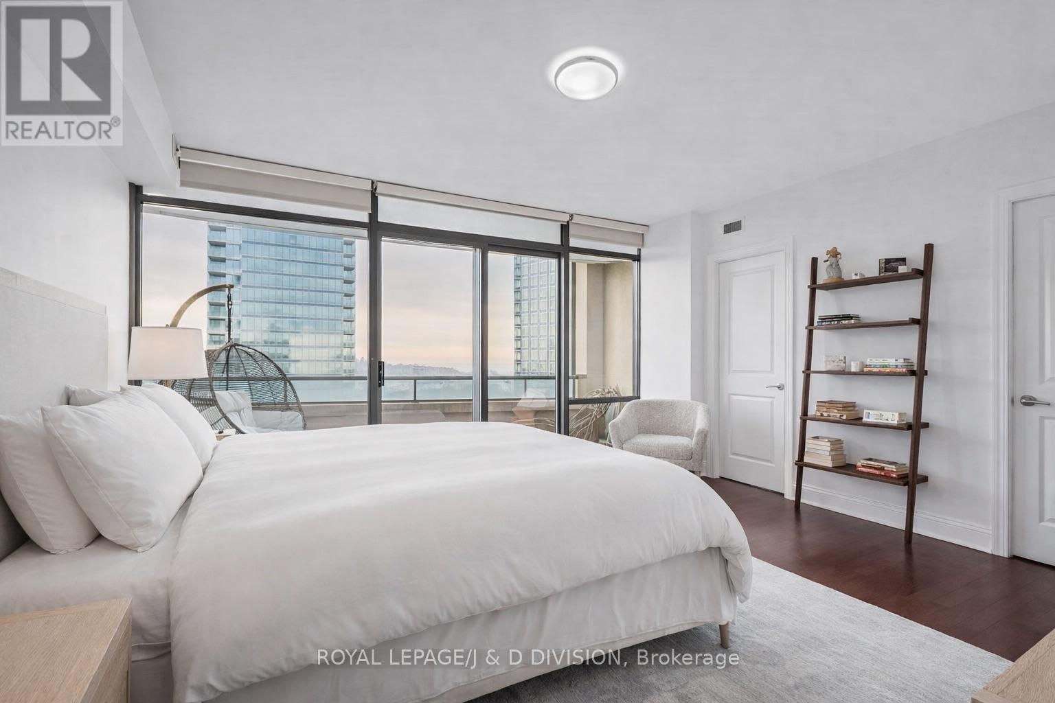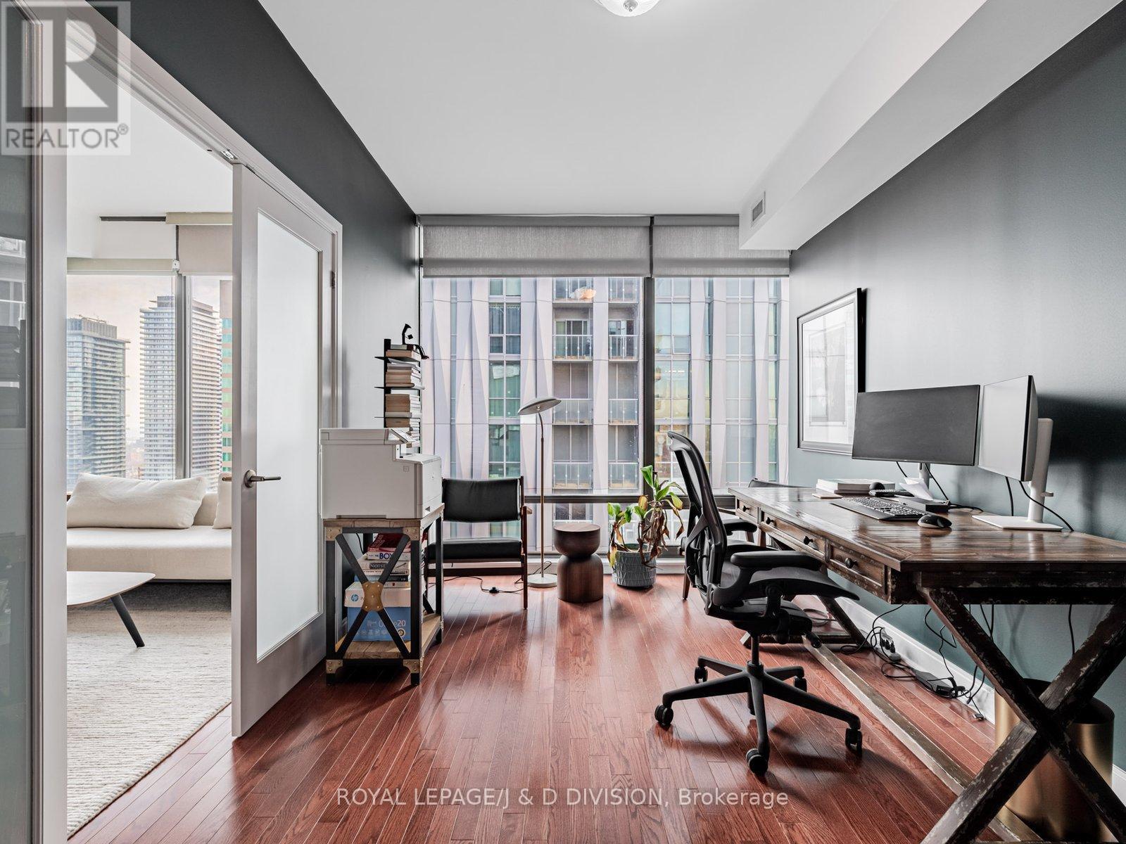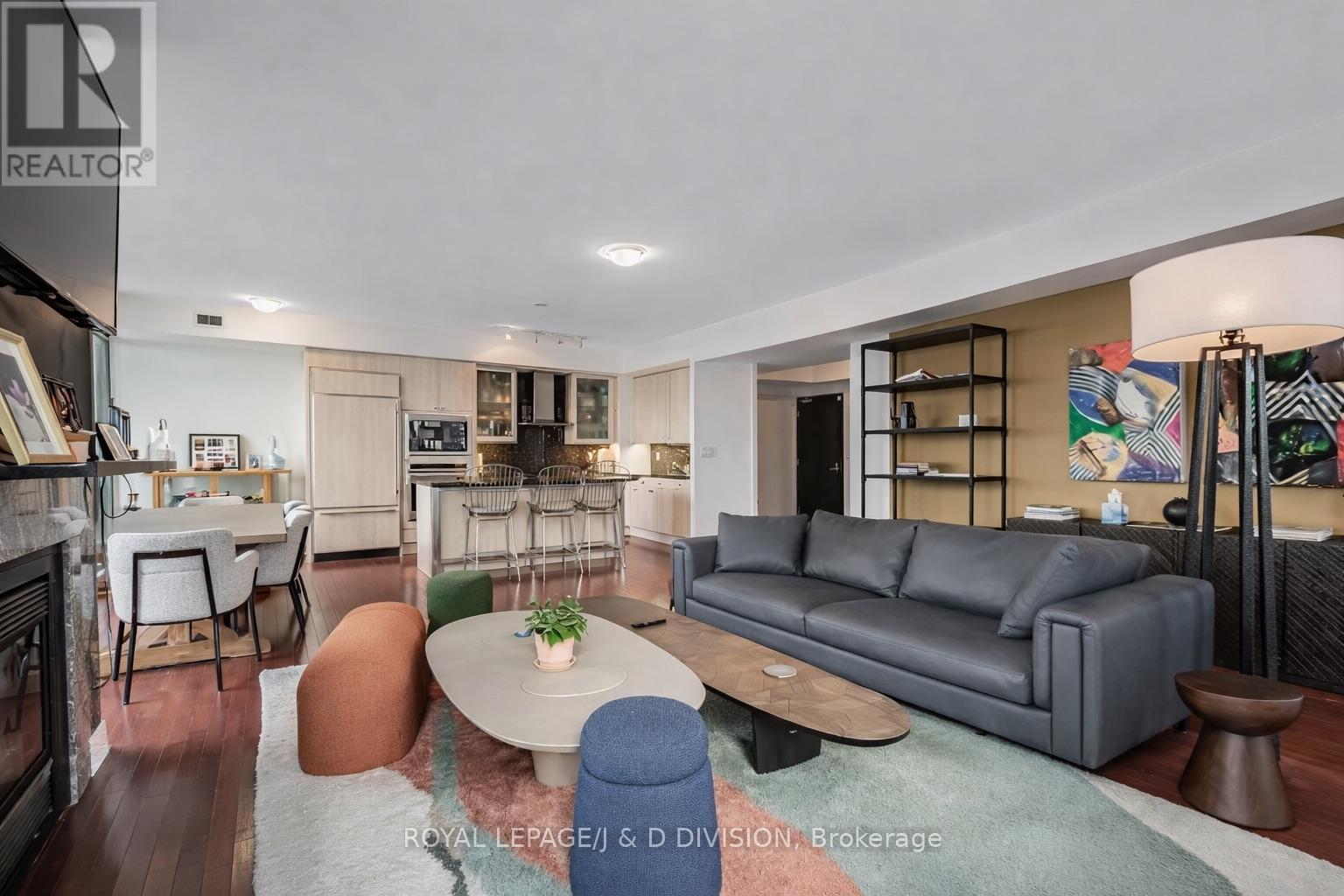 Prime Yorkville location! Beautiful corner suite offering approx. 1,900 sq. ft. of elegant living space with spectacular southwest views. Two large balconies, high ceilings, and floor-to-ceiling windows fill this home with natural light. Spacious living/dining area with gas fireplace, opens to a well-appointed kitchen featuring a centre island, breakfast bar, granite countertops, and backsplash. Ideal for entertaining! The generous primary suite offers 2 walk-in closets and a luxurious 4-pc. ensuite. A desirable split-bedroom layout includes a 2nd bedroom w/4 pc. ensuite plus a separate den, providing flexible space for a 3rd bedroom or office. Features include an impressive marble entryway, hardwood floors throughout, powder room plus 2 ensuites, large laundry room with sink and storage. 2 parking (tandem spot) and 1 locker included. Full-service building with 24-hour concierge, fitness centre with sauna, party room, and an eighth-floor terrace with BBQs. Steps to Yorkville's finest boutiques, world-class dining, outdoor cafés, museums, galleries, transit, and the University of Toronto. (id:64974)