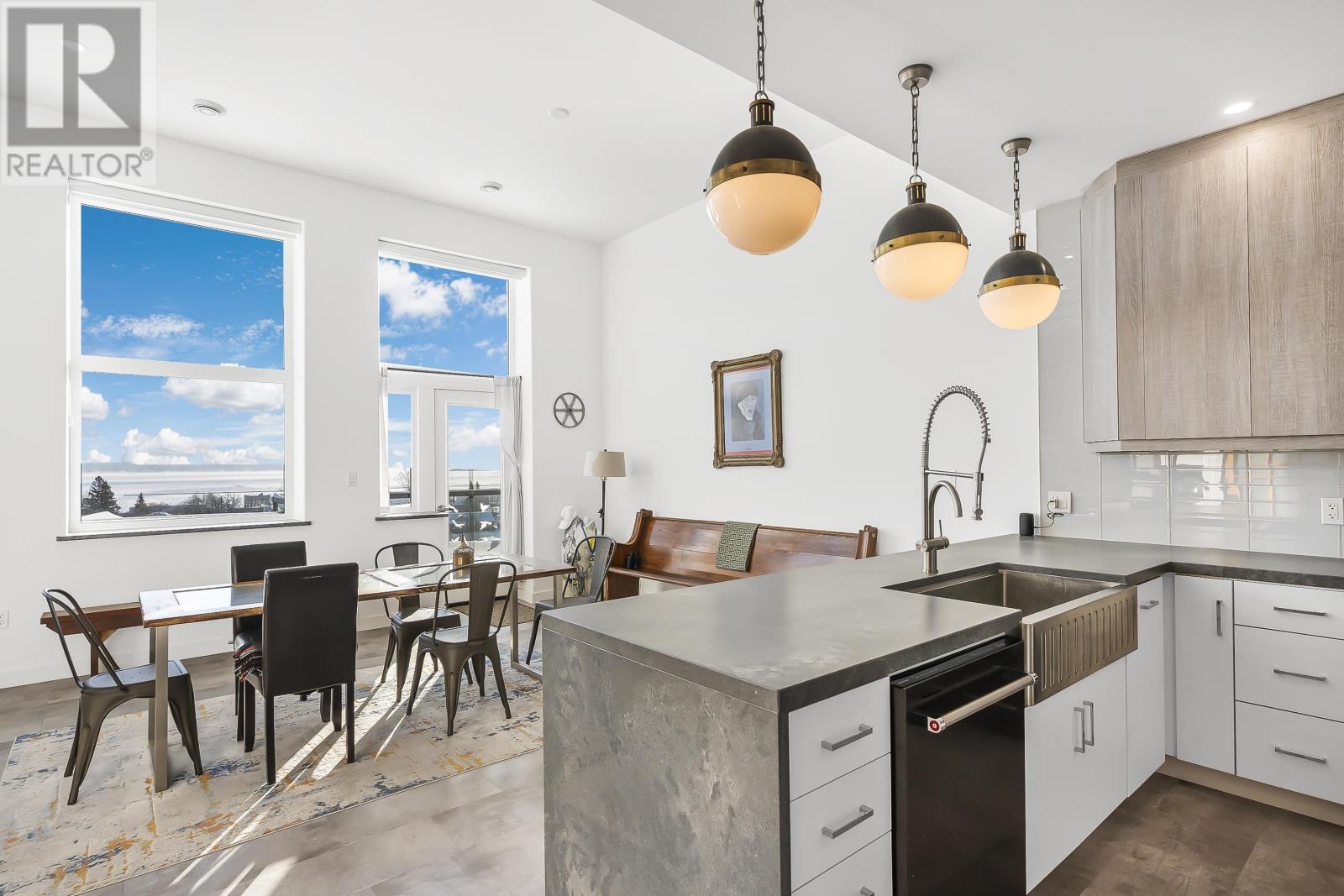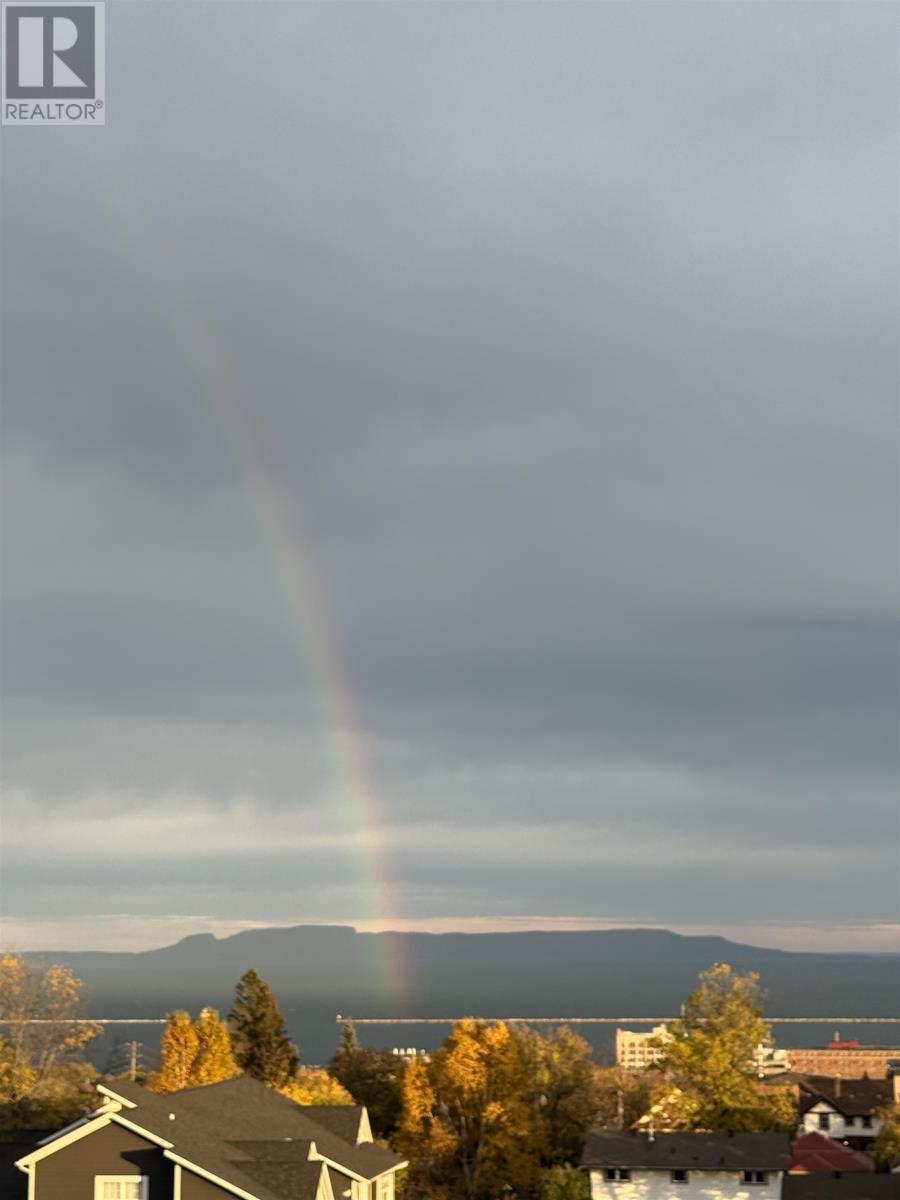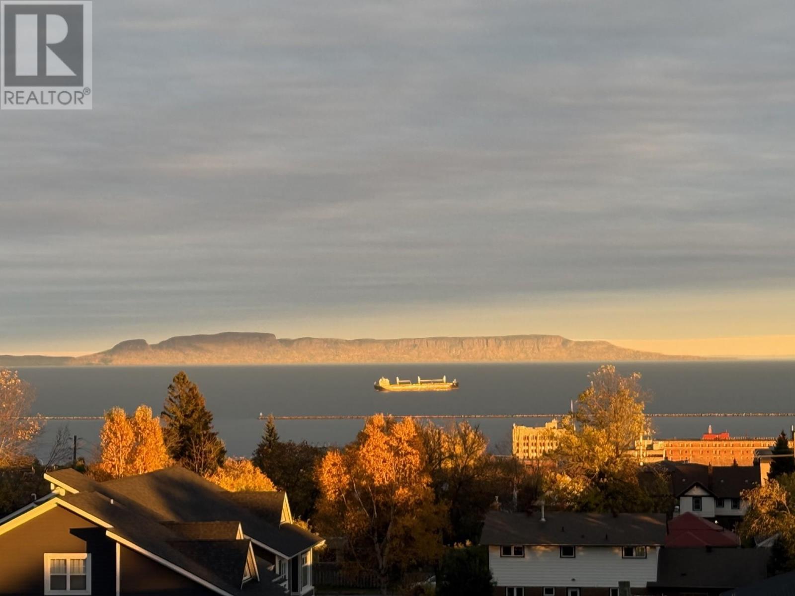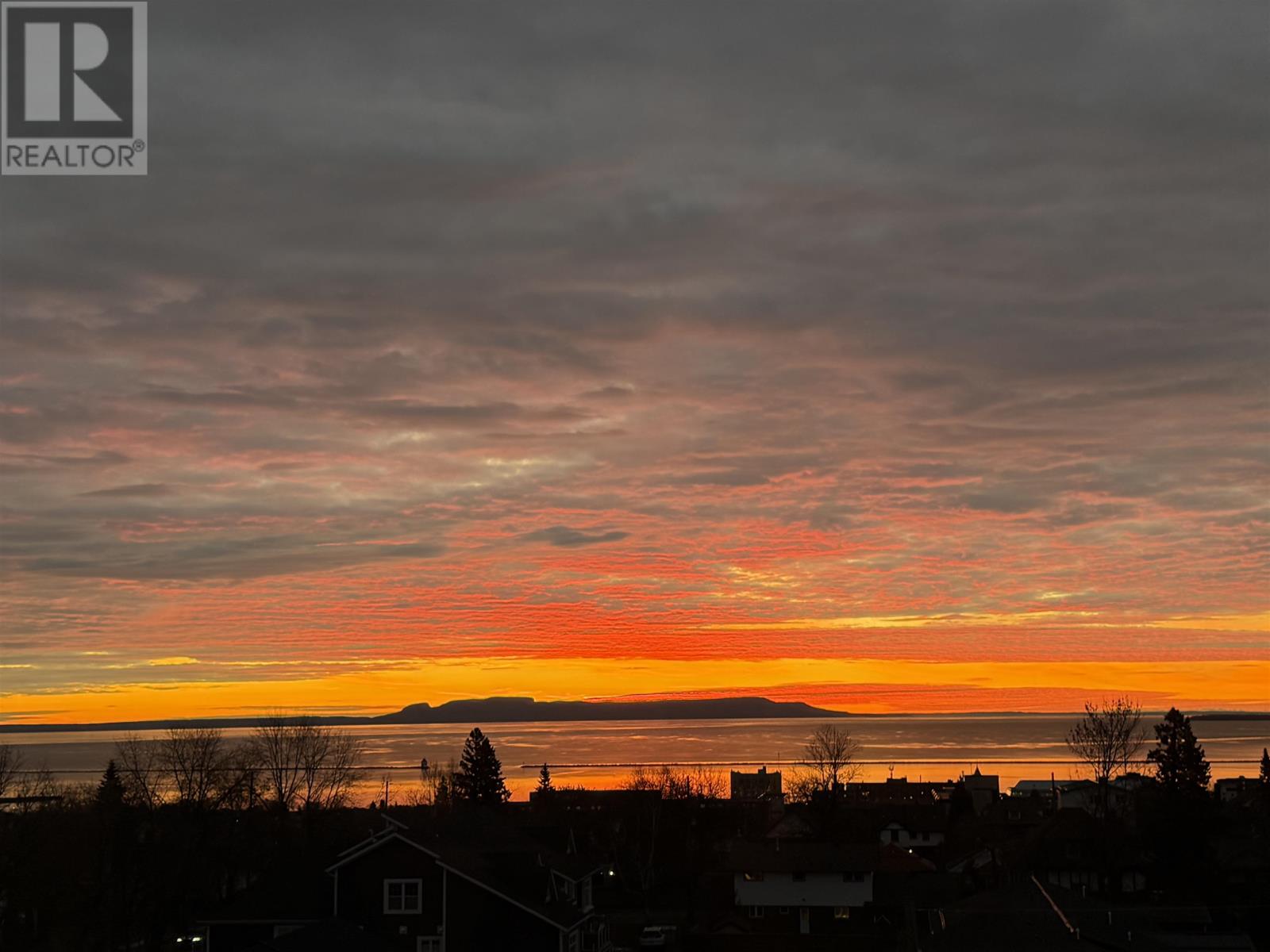 An exceptional top-floor condo offering what is widely considered the best view in the building, perfectly centered to capture breathtaking vistas of the Sleeping Giant and Lake Superior. This outstanding residence features 1,530 square feet of beautifully designed living space with impressive 12-foot high ceilings and an open, light-filled layout. The condo includes two spacious bedrooms and two full bathrooms, highlighted by an exceptional primary suite that flows seamlessly through dual walk-in closets into a spa-inspired ensuite with double sinks, a soaking tub, a walk-in shower, and in-suite laundry. The living and dining areas are anchored by a striking two-sided gas fireplace, creating warmth and elegance throughout the space. Step onto the balcony to enjoy uninterrupted lake views and spectacular sunsets over Lake Superior. Completing this rare offering is a private garage measuring approximately 28’ x 10’, potentially to accommodate 2 small cars, and is great for bike storage, shelving and recycling, adding both convenience and exceptional value. Truly the premier condo in the building, combining superior views, thoughtful design, and refined living in one of Thunder Bay’s most sought-after settings. (id:64974)