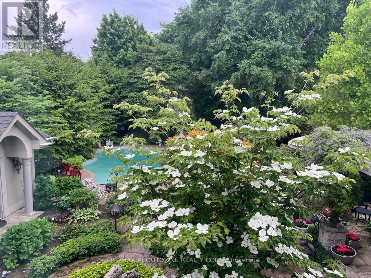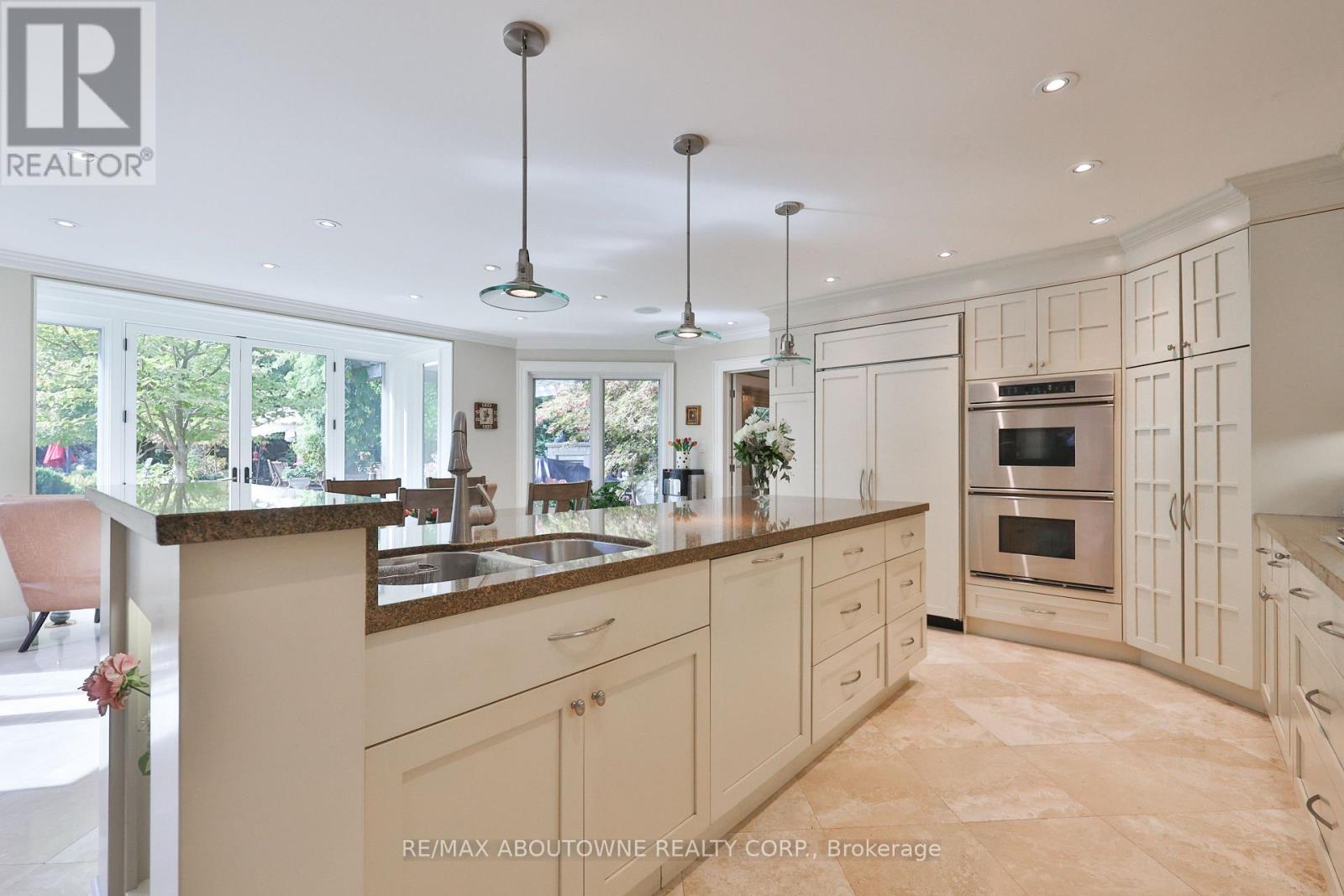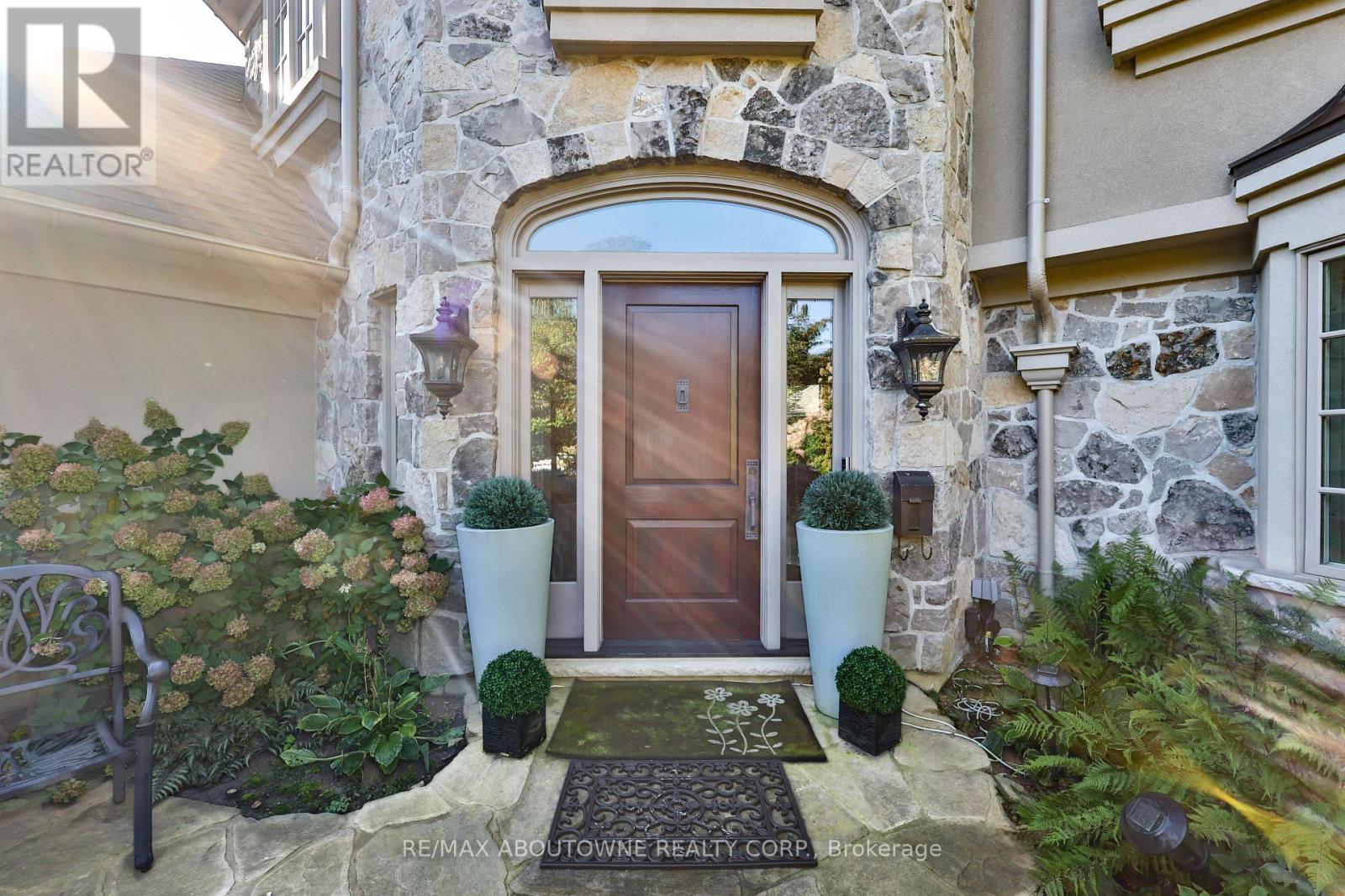 Set on a breathtaking 70'x209' private lot in Burlington's prestigious Roseland community, this stately stone and stucco home offers over 5,850 sq ft of finely curated living space across three levels. Showcasing timeless elegance and old-world craftsmanship, this home impresses with custom millwork, plaster crown mouldings, custom built-ins and rich hardwood, limestone and porcelain floors. Step into a grand foyer that leads to elegant formal dining and living rooms with a gas fireplace then discover the heart of the home: a chef's dream kitchen featuring a sprawling island, top-of-the-line appliances, walk-in pantry, sunlit breakfast area with a walk out to the stunning gardens. Adjoining the kitchen is the great room with a two-storey ceiling, gas fireplace and a wall of windows framing your own backyard paradise. The main level also features a home office, stylish powder room and custom mudroom with access to an oversized double garage with epoxy floors. Upstairs, unwind in your primary retreat with vaulted ceilings, sunlit walk-in closet and luxurious 4-piece spa-inspired ensuite with steam shower. A loft-style library with built-in bookcases overlooks the great room and three more spacious bedrooms include a private guest suite, a shared 4-piece bath and convenient upper-level laundry. The lower level features a home theatre room, hobby room, second laundry, fitness studio with beverage centre and 3-piece bath and storage. Outside, the resort-style backyard is an entertainer's dream featuring a 20'x40' saltwater gunite pool ('19), stucco pool house ('15) with kitchenette, change room and garden storage, a pergola-covered stone patio ('19) with gas fireplace, dramatic landscape lighting and tranquil stone water feature, surrounded by stunning, lush, mature gardens. Just steps to top schools, parks, downtown and the lake, this distinguished home with its meticulous attention to detail exudes warmth and comfort and will appeal to the most discerning buyer. (id:64974)