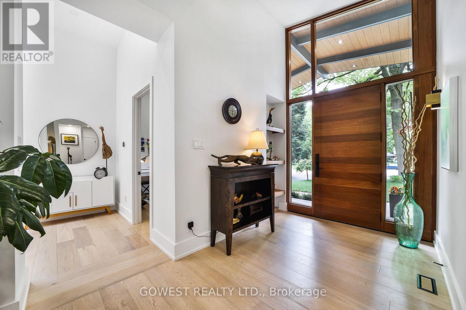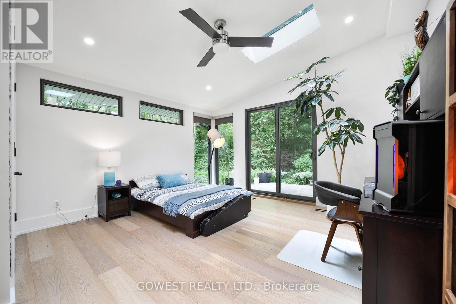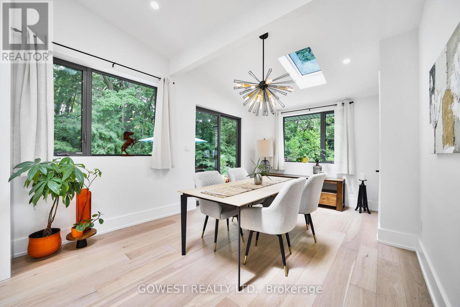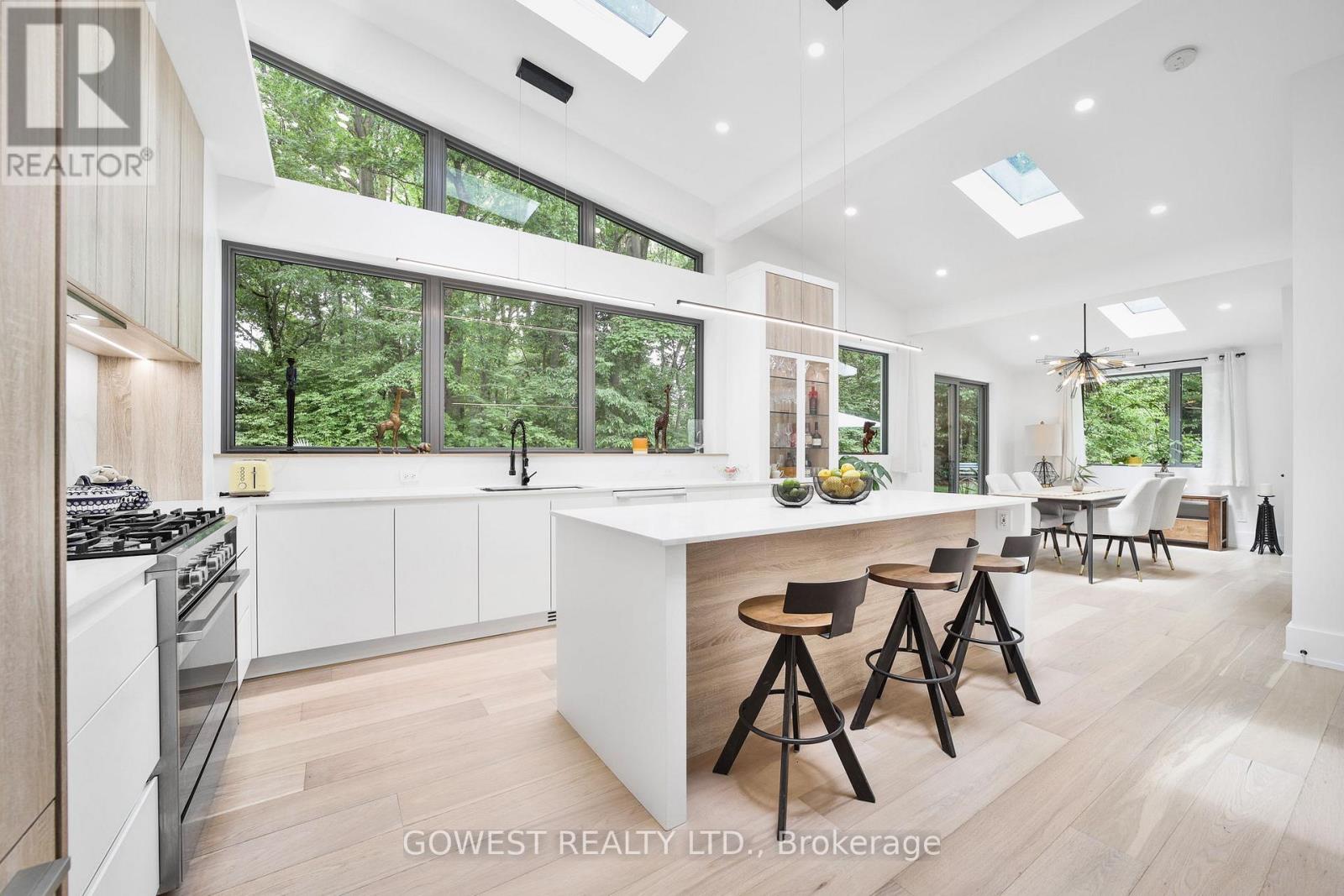 Modern luxury renovated bungalow on a massive, third-of-an-acre pie-shaped lot, backing into a park. Almost 3800 square feet of the total luxury finished livable space. Situated at the end of a quiet cul-de-sac on one of the most prestigious streets in South-East Oakville. Surrounded by mature trees, the west-facing backyard provides year-round privacy. Upon entering, you are greeted by soaring ceilings, skylights and 13-foot Inline Fibreglass windows providing a direct view into the private, treed backyard and patio. Complementing the great room with a fireplace is a spacious and modern kitchen, dining room, powder room, mudroom and laundry. There are three bedrooms on the main level, two with en-suite bathrooms, and the third is currently used as a home office. The lower level has been completely redesigned and can function as a separate unit with its own entrance or as an in-law or nanny suite. Complete with a large open concept living room and kitchen, there are three bedrooms, two bathrooms, a gas fireplace and a dedicated laundry. All upgraded "Inline" fibreglass windows throughout. All upgraded electrical with 200 Amp Service, All Upgraded Gas Line. The house has a double-car garage with a Tesla charging station, a large park-like, landscaped lot with a storage shed and big patios. Cul-de-Sac in South East Oakville with a gorgeous forest view! Not to be missed! **EXTRAS** Please note the house is backing into a park - but it's not subject to conservation authority - for a client interested in future development. It's approximately 216' across the back of the property. Original Survey attached. Brand New Commercial Flat Roof with Skylights installed in 2025. (id:64974)