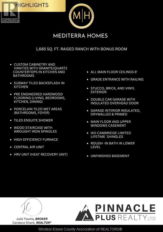 FOR A LIMITED TIME - HST REBATE PRICING!! Welcome to Mayrand Street in the new Villa Oaks Estates Subdivision! The 'Terra' model is a spacious Raised Ranch semi-detached home with bonus room and attached double garage features 3 Bedrooms & 2 Bathrooms in a quiet neighbourhood just minutes from many amenities. Step inside to the bright, welcoming space with hardwood floors in the kitchen and all living areas and tile flooring in the foyer and baths. The open floor plan seamlessly connects the living room to the dining area and kitchen, making it ideal for entertaining and family gatherings. The kitchen’s functional layout features plenty of cabinet space, island, solid surface countertops and beautiful coffee bar. The upper level features a large primary bedroom with 4-piece ensuite and walk-in closet- a private oasis! The unfinished basement features the laundry room, a grade entrance, and rough-in bath. Located in a desirable LaSalle neighborhood with easy access to local schools, shopping, and major highways. Pricing reflects the current HST rebate in place for a limited time and is available to eligible buyers only. (id:64974)
