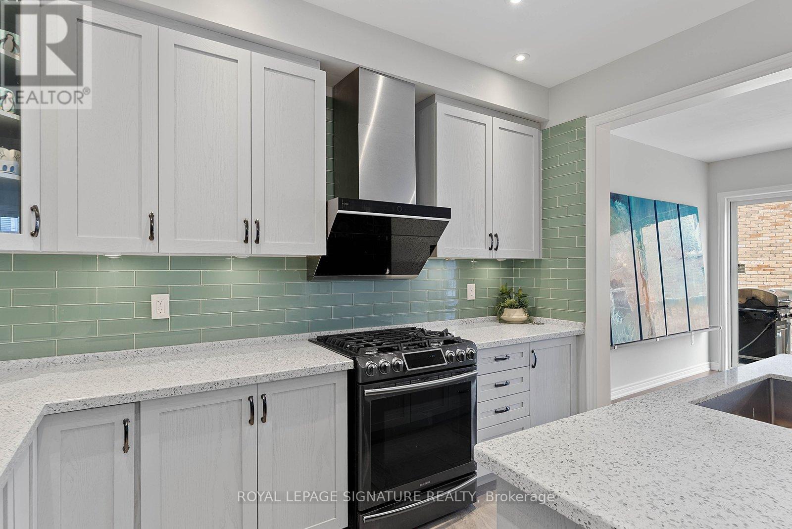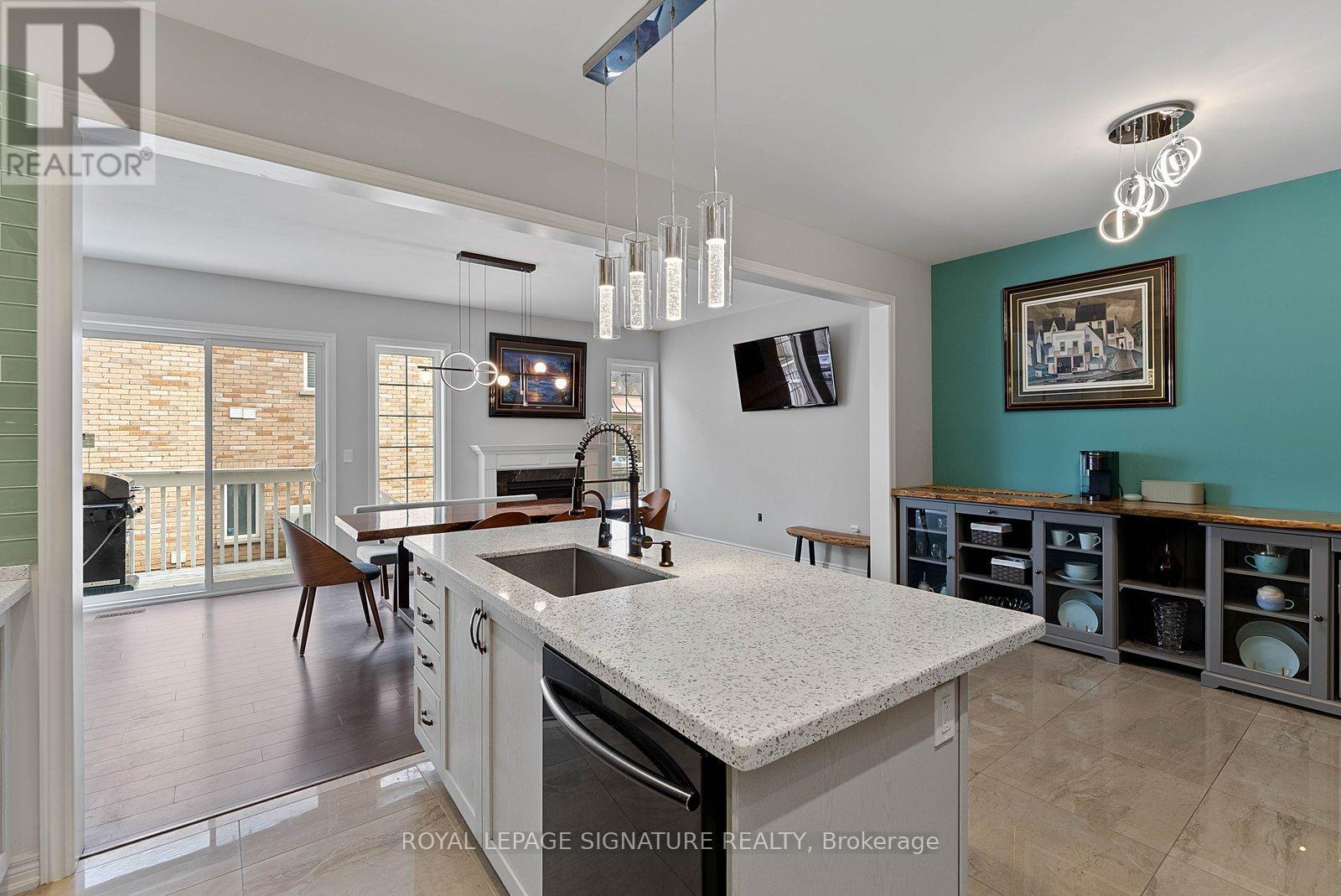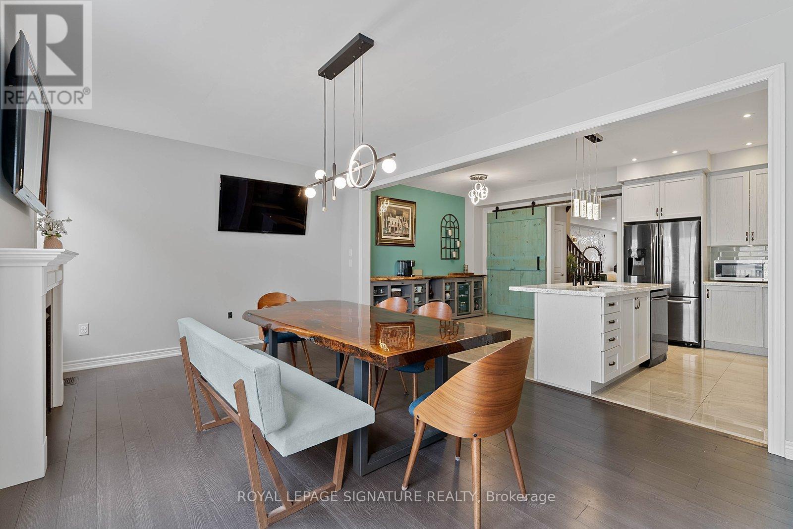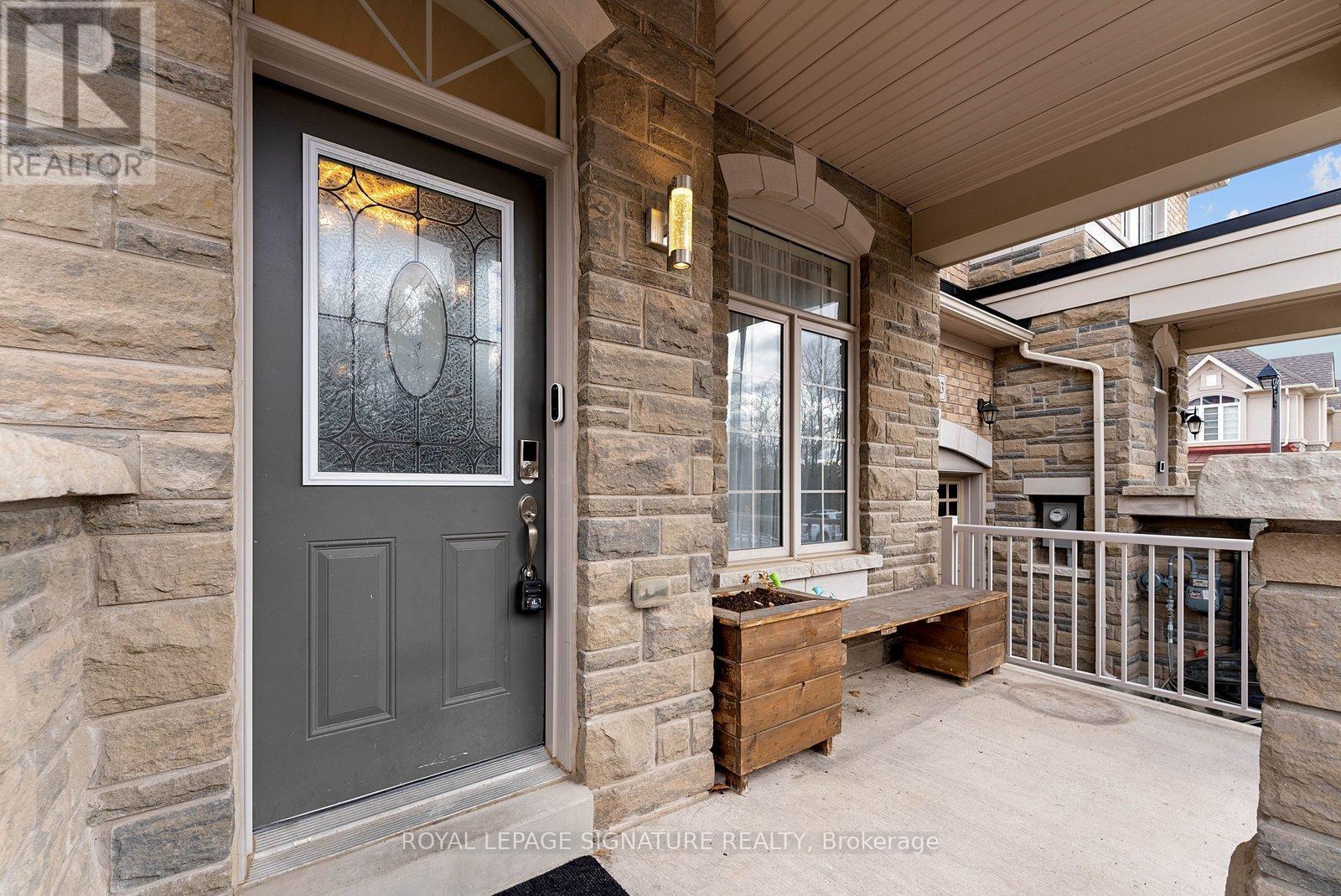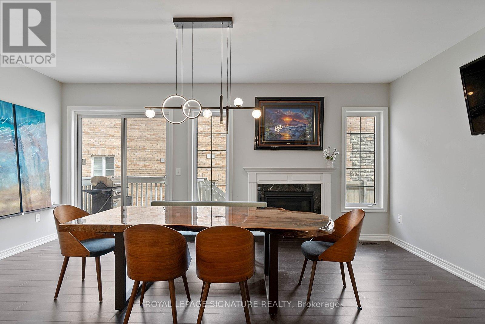 Stunning stone and brick 4-Bedroom, 2.5-Bathroom freehold townhouse located in the sought-after North Oakville neighbourhood. Facing a lush forest, this 2-storey home offers privacy, beautiful natural views, and plenty of street parking for multiple vehicles. With over 2,339 sq.ft of well designed living space and modern finishes, this home has been well-loved and upgraded from top to bottom. Main floor features 9-ft ceilings and a bright open-concept layout, ideal for family living and entertaining. Living room showcases a custom wall panel with built-in display shelves, adding warmth and character. In the kitchen, you'll find quartz countertops, black stainless-steel appliances, gas stove, centre island with breakfast bar, along with plenty of cabinetry. A sliding barn door offers separation from the living area when you want added privacy. The dining area is spacious and highlighted by a natural gas fireplace, with a walk-out to the deck complete with a gas line for BBQs. Upstairs, all four bedrooms are generously sized. The 18'x13' primary bedroom features a custom walk-in closet and 4-piece ensuite with both shower and soaking tub. The 3rd bedroom is a child's dream, with an indoor playground that can stay or be removed. The unfinished basement is a blank canvas, ready for a rec room or gym, and includes a cold room for more storage. Thoughtful upgrades throughout include stone vanities in every bathroom, kitchen hardware, lighting, faucets, stained oak stairs, and 240-volt outlet for EV charging. Location couldn't be more convenient - steps to parks and school bus route serving multiple schools. Highways and 407 are just minutes away, with supermarkets, shopping, trails, hospitals, and the new Sixteen Mile Community Centre & Library, a 65,000-sq.ft facility with aquatic facilities, fitness centre, indoor track, gymnasium, and community spaces. Don't miss your chance to move into a warm, welcoming home in one of North Oakville's most sought-after communities. (id:64974)