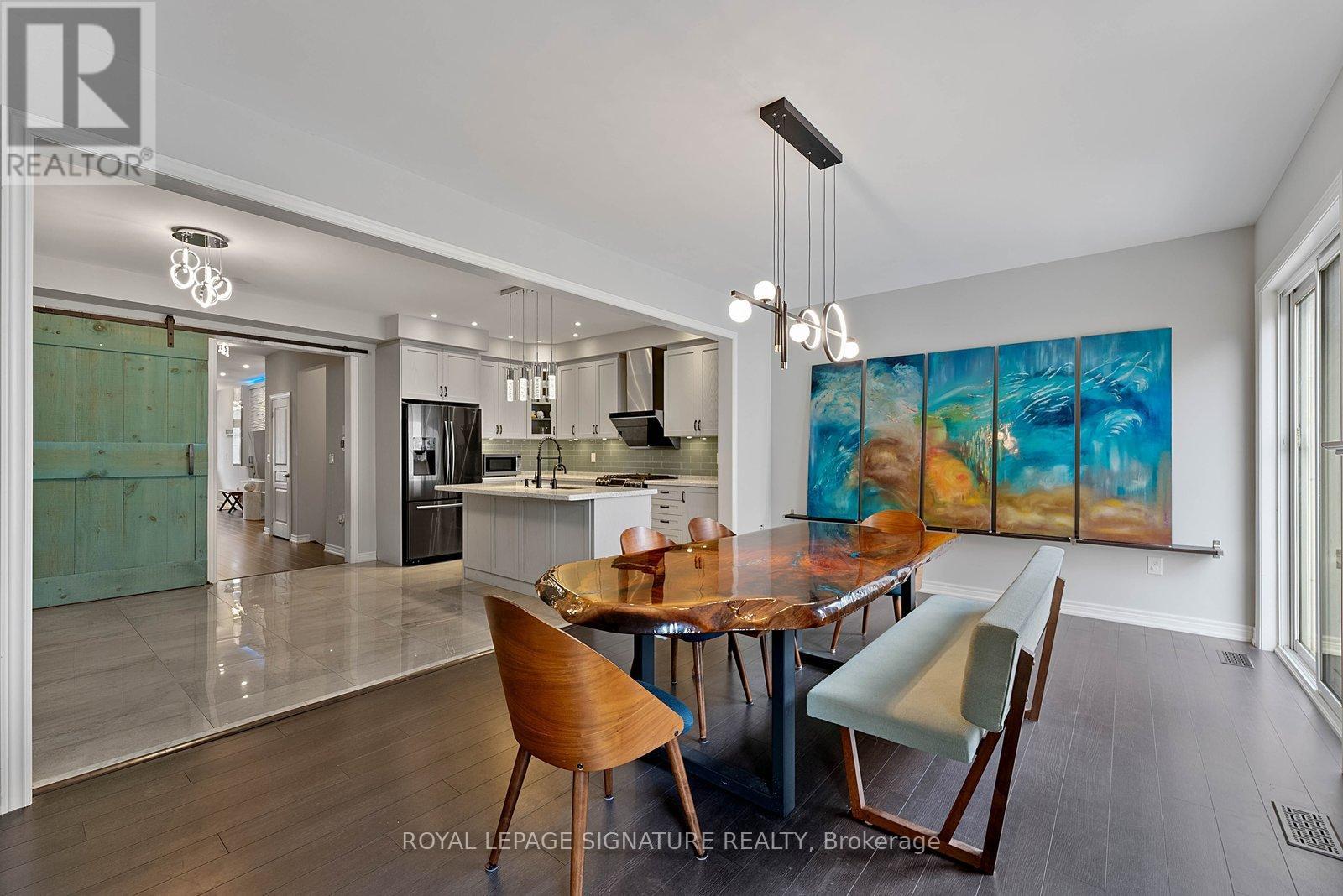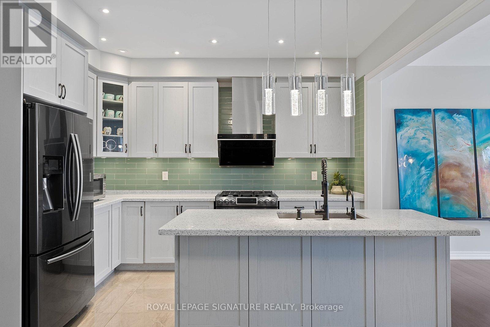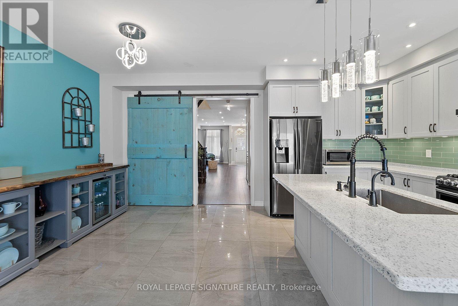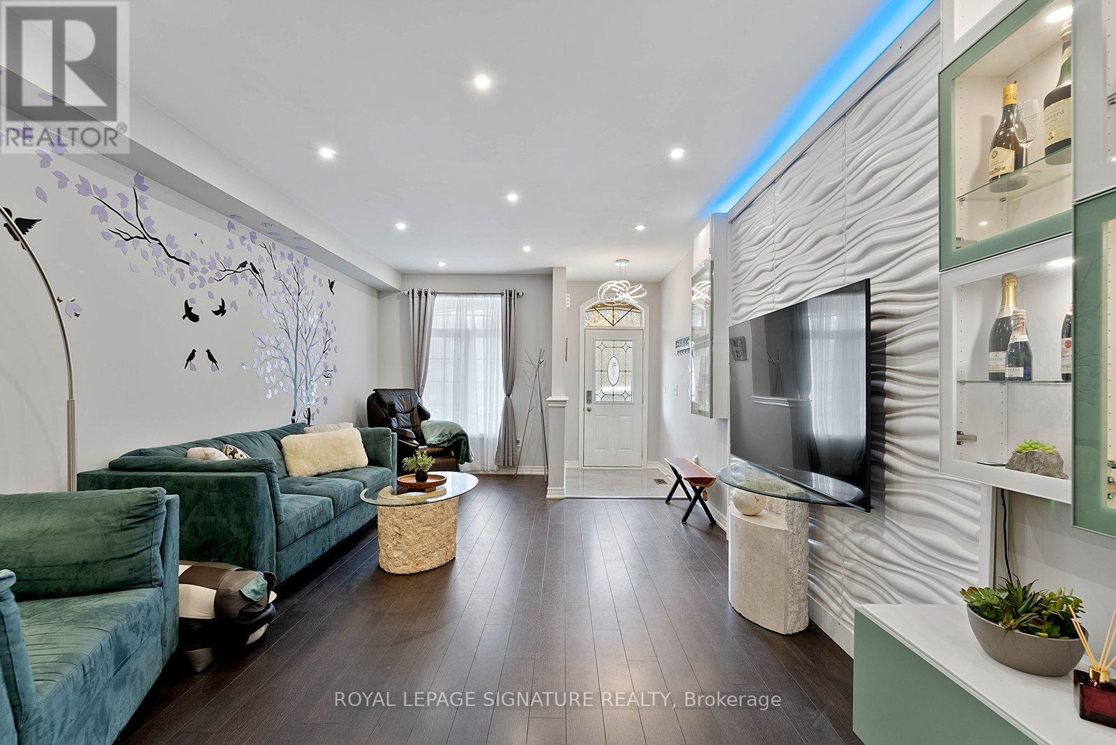 Stunning stone and brick 4-Bedroom, 2.5-Bathroom freehold townhouse located in the sought-after North Oakville neighbourhood. Facing a lush forest, this 2-storey home offers privacy, beautiful natural views, and plenty of street parking for multiple vehicles. With over 2,339 sq.ft of well designed living space and modern finishes, this home has been well-loved and upgraded from top to bottom. Main floor features 9-ft ceilings and a bright open-concept layout, ideal for family living and entertaining. Living room showcases a custom wall panel with built-in display shelves, adding warmth and character. In the kitchen, you'll find quartz countertops, black stainless-steel appliances, gas stove, centre island with breakfast bar, along with plenty of cabinetry. A sliding barn door offers separation from the living area when you want added privacy. The dining area is spacious and highlighted by a natural gas fireplace, with a walk-out to the deck complete with a gas line for BBQs. Upstairs, all four bedrooms are generously sized. The 18'x13' primary bedroom features a custom walk-in closet and 4-piece ensuite with both shower and soaking tub. The 3rd bedroom is a child's dream, with an indoor playground that can stay or be removed. The unfinished basement is a blank canvas, ready for a rec room or gym, and includes a cold room for more storage. Thoughtful upgrades throughout include stone vanities in every bathroom, kitchen hardware, lighting, faucets, stained oak stairs, and 240-volt outlet for EV charging. Location couldn't be more convenient - steps to parks and school bus route serving multiple schools. Highways and 407 are just minutes away, with supermarkets, shopping, trails, hospitals, and the new Sixteen Mile Community Centre & Library, a 65,000-sq.ft facility with aquatic facilities, fitness centre, indoor track, gymnasium, and community spaces. Don't miss your chance to move into a warm, welcoming home in one of North Oakville's most sought-after communities. (id:64974)