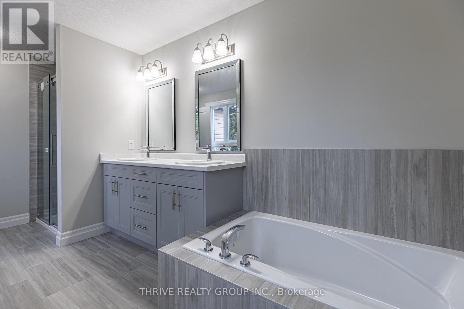 ONE of THREE Ready to move in spec homes at an incredible value! Welcome to this NEW beautifully upgraded two-storey home located in the highly sought-after Old Victoria on the Thames neighbourhood. Offering 2,331 square feet of living space and four spacious bedrooms, this residence provides plenty of room for a growing family. The upper level features hard surface flooring throughout, a vaulted ceiling in the primary bedroom, as well as a walk-in closet and private ensuite. On the main floor, you'll find hardwood flooring and tile in all wet areas, adding style and function to the open-concept living and dining areas. The gourmet kitchen is finished with granite countertops and high-end details, making it a perfect space to cook and entertain. A main floor den with a cheater door to a full three-piece bathroom offers flexibility for guests or a home office. Additional highlights include a 20 x 20 double car garage and convenient main floor laundry. Situated just minutes from the Thames River, natural ravine, and walking trails, this home is also only 14 minutes from Fanshawe College, 10 minutes from Victoria Hospital, and 20 minutes from Western University. With more lots and plans available, this is an incredible opportunity to enjoy both comfort and convenience in one of Londons most desirable communities. (id:64974)