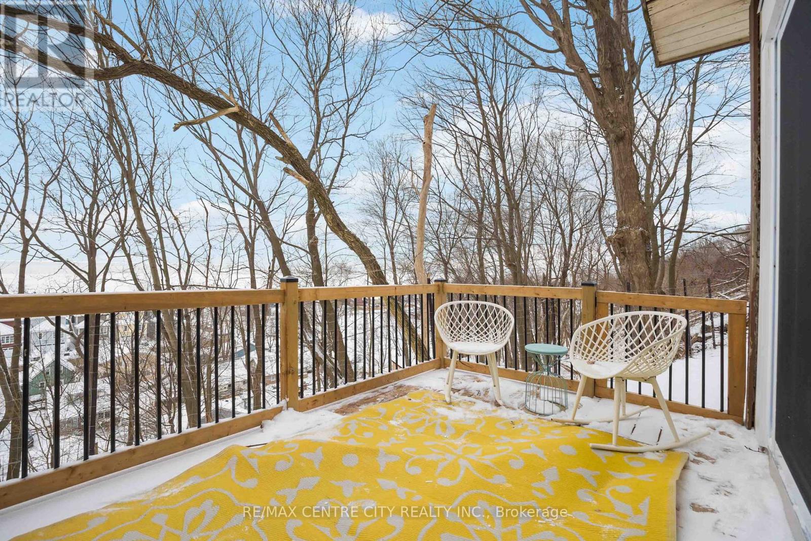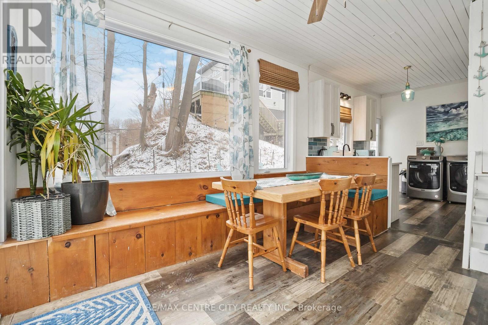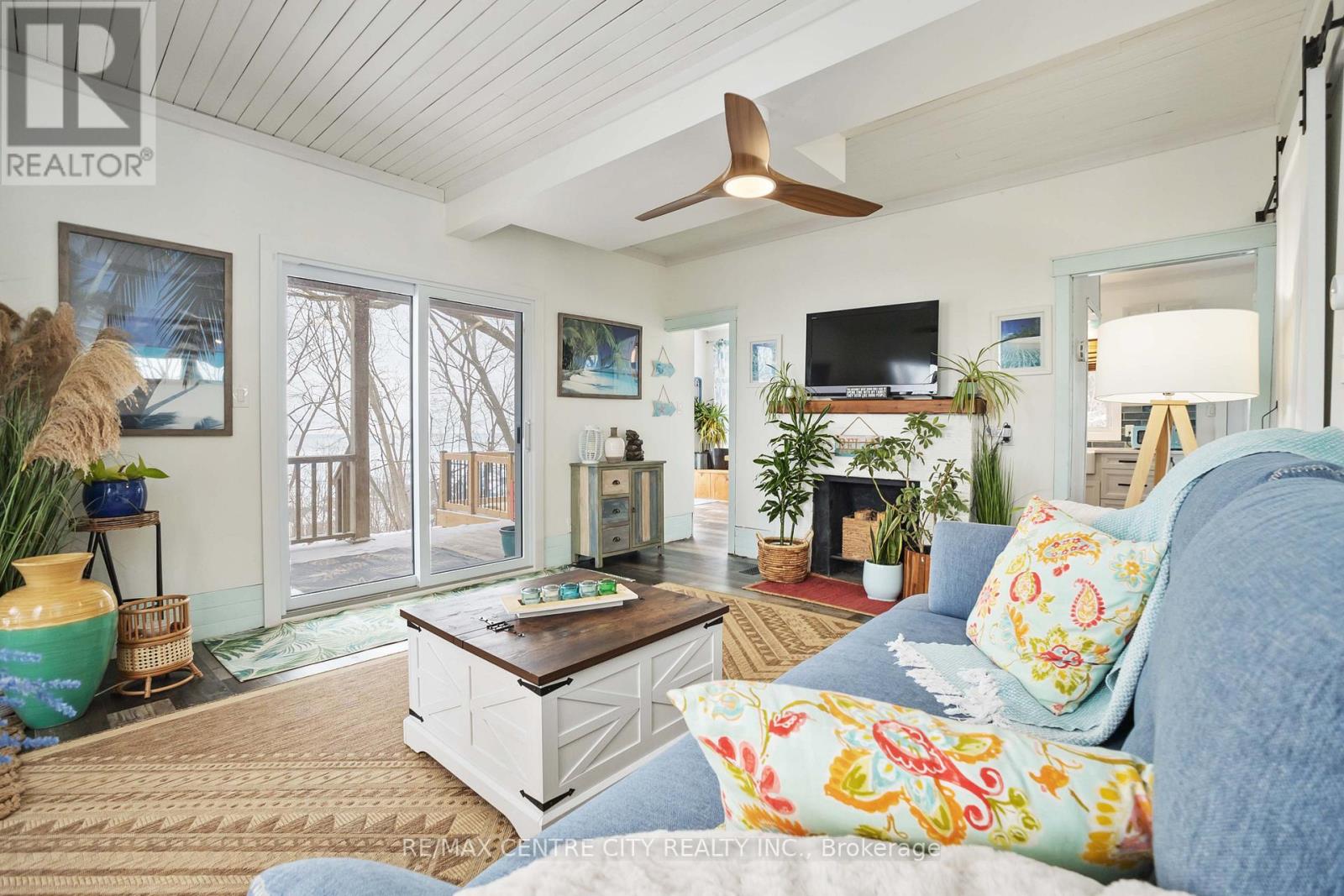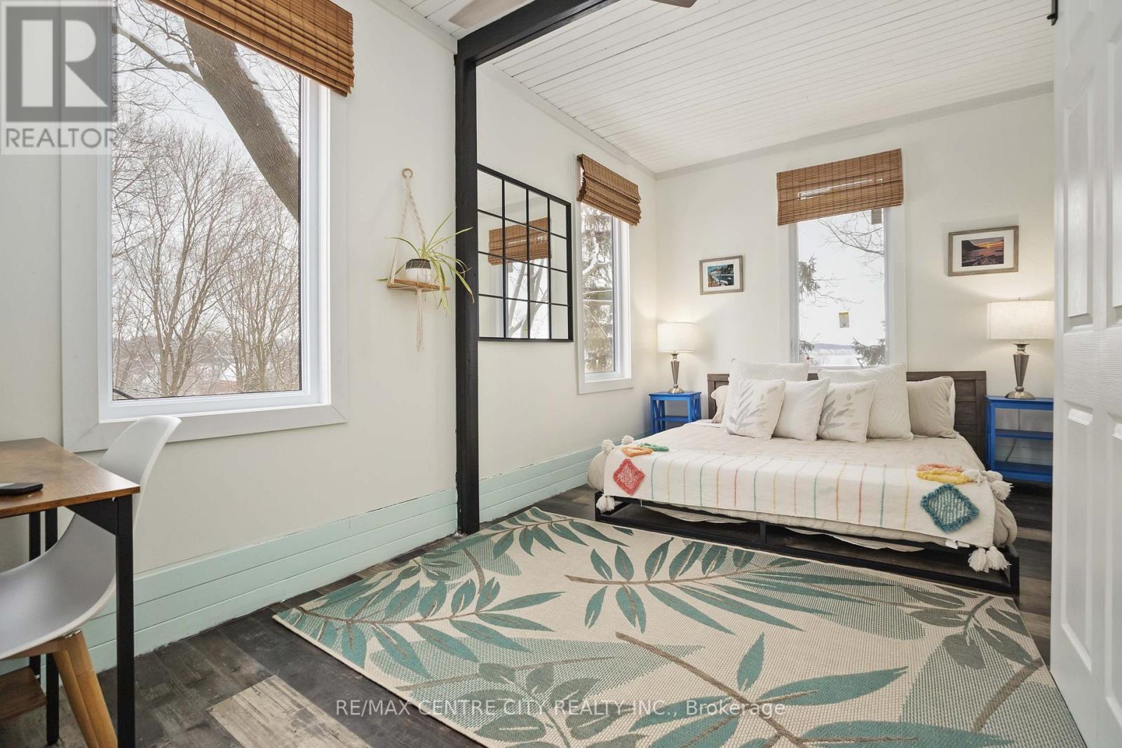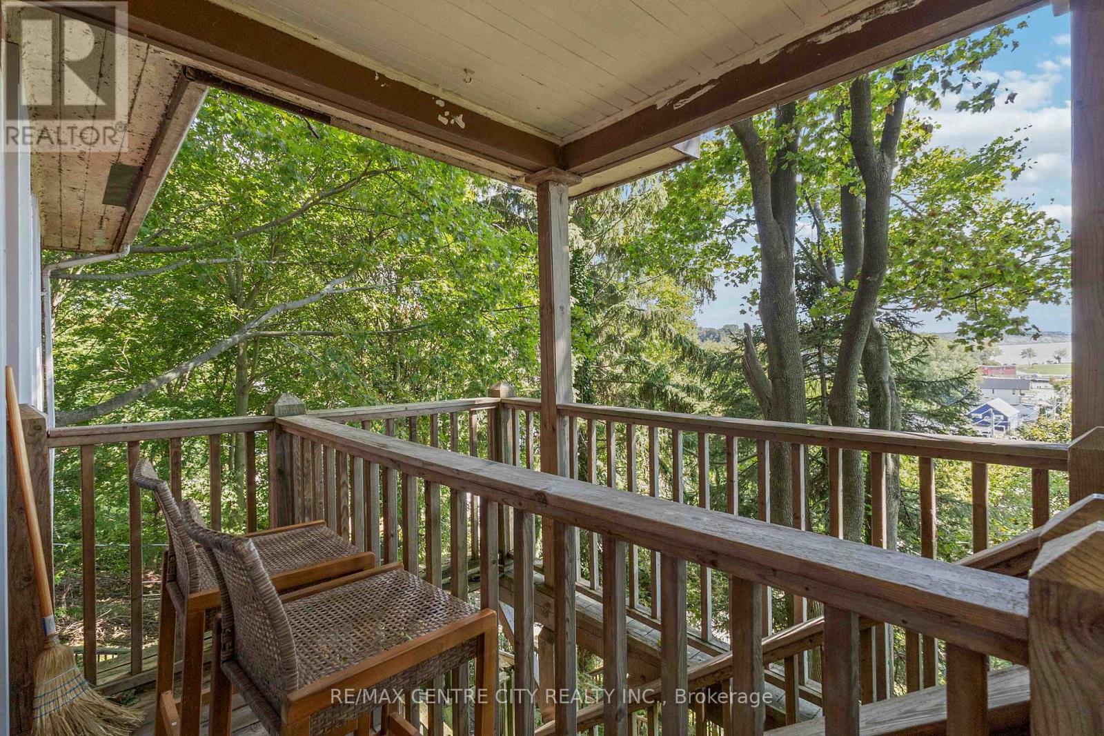 The quaint beach community of Port Stanley offers the unique opportunity for your very own treetop oasis! This one-of-a-kind destination is appealing to those seeking a short-term getaway or family destination, merely steps from the beach & beautiful shores of Lake Erie. This high demand, income generating property with proven success & approximately 50K of annual revenue provides the best of BOTH worlds for those eager to acquire a vacation home while maintaining the opportunity to generate rental income when not occupied for yourself. Breathtaking, panoramic views of Main Beach to the South Little Beach to the East, this property will captivate each visitor. A peaceful retreat, perched amongst the trees, this slice of paradise includes bright, oversized windows overlooking a newly built deck where you'll experience the soundtrack of waves & spectacular water vistas. Plenty of seating in the dining area ensures a crowd can be hosted with ease. A functional kitchen includes fully updated finishes with chic new cabinetry, stylish new appliances, laundry & access to side yard. Generous living room includes three large patio sliders with gorgeous views of the lake & cozy wood burning fireplace. Primary bedroom includes multiple bright windows & private ensuite with free standing tub. Head upstairs to discover two additional bedrooms as well as updated 3PC shower. Significant renovations completed including updated Northstar windows, luxury vinyl plank flooring, drywall, paint, metal roof, deck & AC. Lower level is ready for your finishing touches, currently roughed in with electrical & plumbing to complete a self-contained studio apartment or added living space. Deeded parking (located on Sydenham) includes space for two vehicles as well as storage shed, just steps away. A short walk brings you to the beach as well as many of Port Stanley's amazing restaurants & amenities. Truly a destination to appreciate with great appeal to enjoy as an income generating retreat! (id:64974)