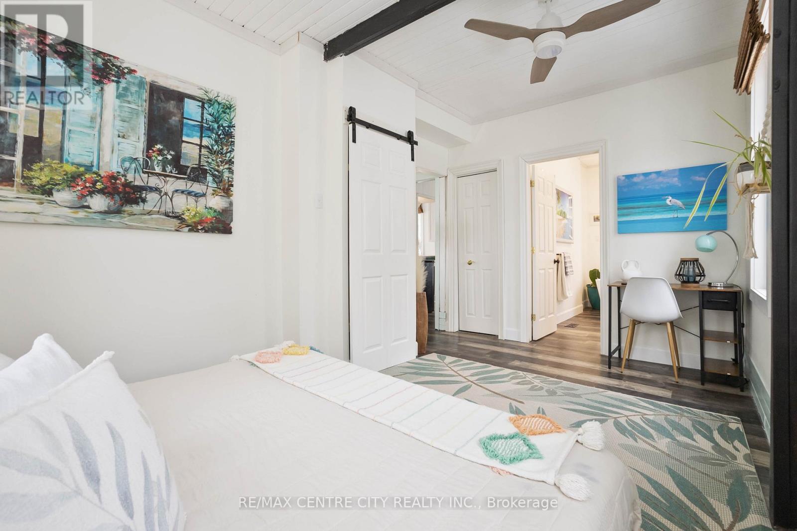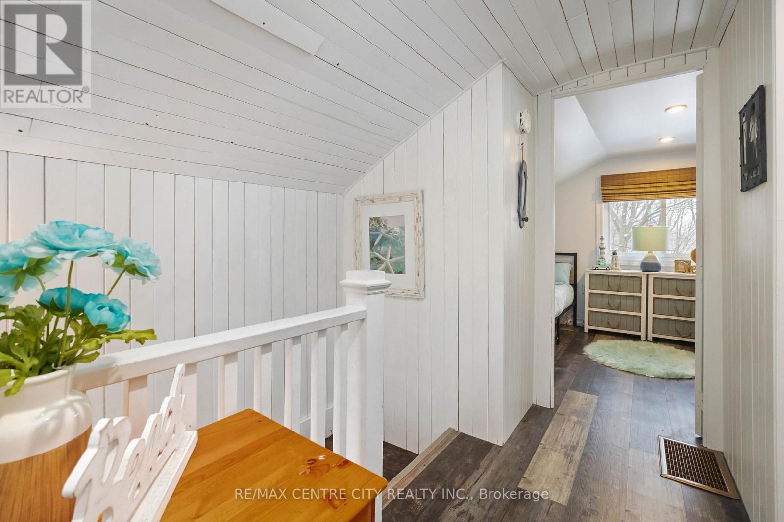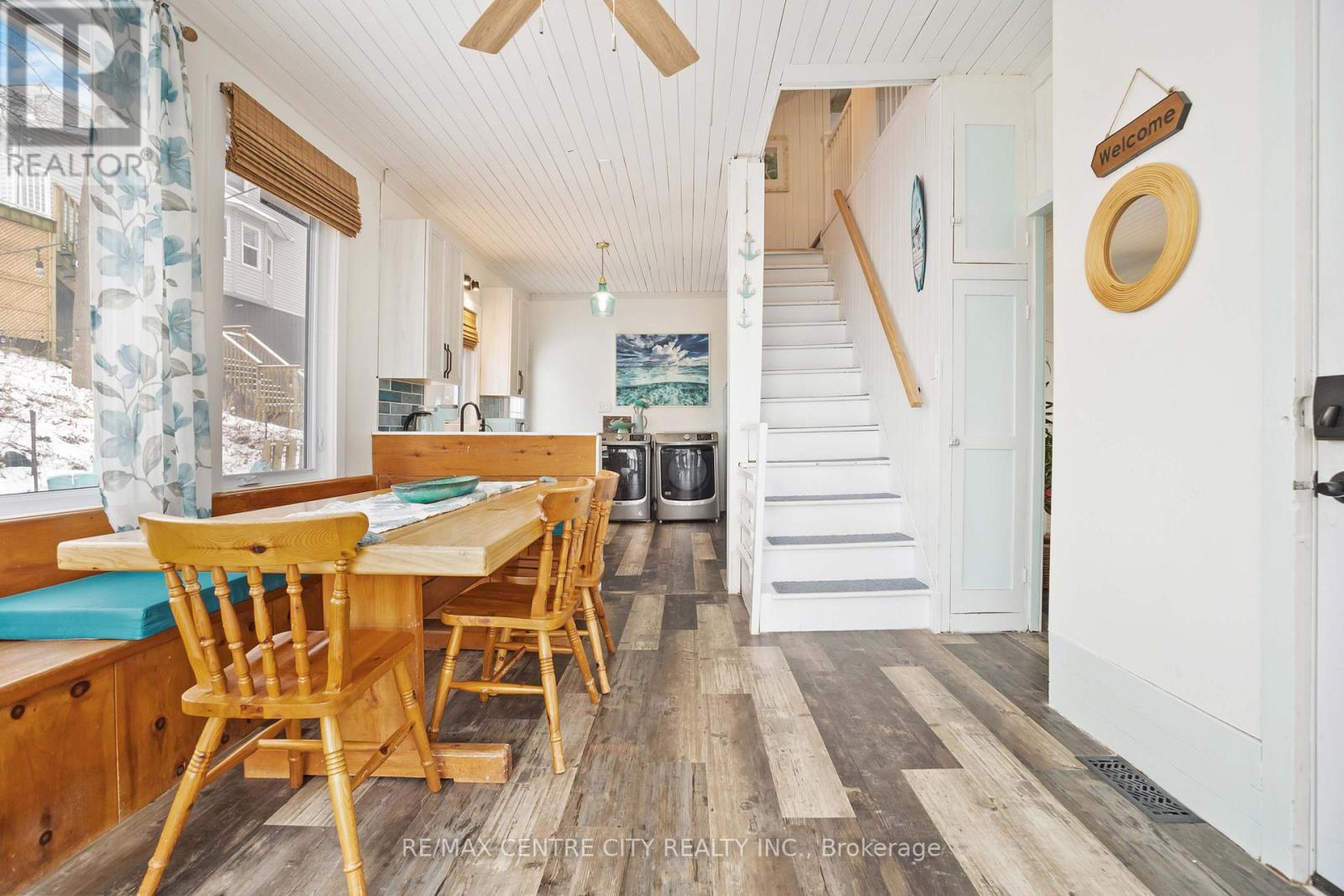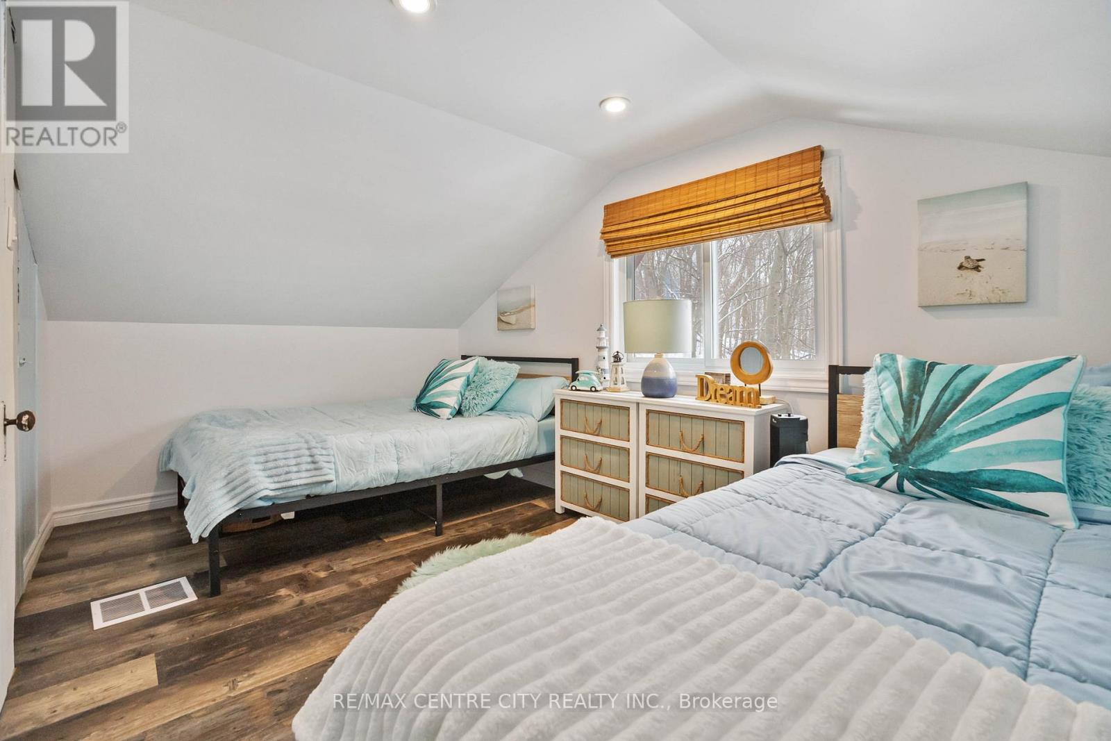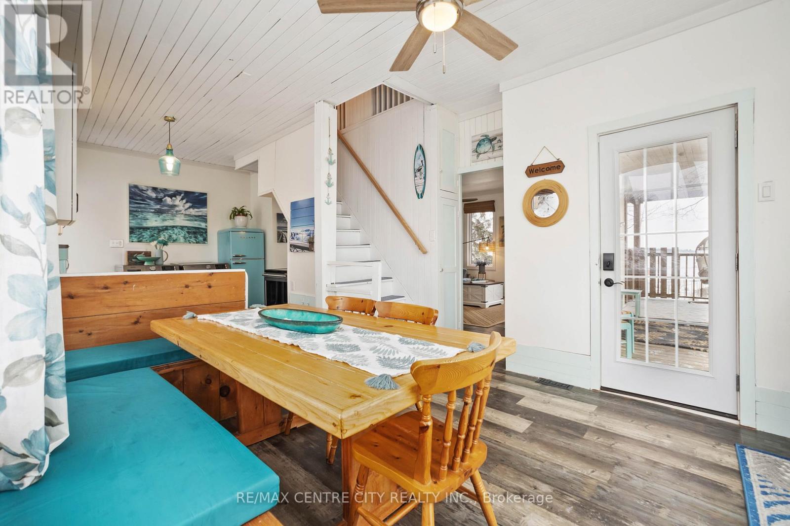 The quaint beach community of Port Stanley offers the unique opportunity for your very own treetop oasis! This one-of-a-kind destination is appealing to those seeking a short-term getaway or family destination, merely steps from the beach & beautiful shores of Lake Erie. This high demand, income generating property with proven success & approximately 50K of annual revenue provides the best of BOTH worlds for those eager to acquire a vacation home while maintaining the opportunity to generate rental income when not occupied for yourself. Breathtaking, panoramic views of Main Beach to the South Little Beach to the East, this property will captivate each visitor. A peaceful retreat, perched amongst the trees, this slice of paradise includes bright, oversized windows overlooking a newly built deck where you'll experience the soundtrack of waves & spectacular water vistas. Plenty of seating in the dining area ensures a crowd can be hosted with ease. A functional kitchen includes fully updated finishes with chic new cabinetry, stylish new appliances, laundry & access to side yard. Generous living room includes three large patio sliders with gorgeous views of the lake & cozy wood burning fireplace. Primary bedroom includes multiple bright windows & private ensuite with free standing tub. Head upstairs to discover two additional bedrooms as well as updated 3PC shower. Significant renovations completed including updated Northstar windows, luxury vinyl plank flooring, drywall, paint, metal roof, deck & AC. Lower level is ready for your finishing touches, currently roughed in with electrical & plumbing to complete a self-contained studio apartment or added living space. Deeded parking (located on Sydenham) includes space for two vehicles as well as storage shed, just steps away. A short walk brings you to the beach as well as many of Port Stanley's amazing restaurants & amenities. Truly a destination to appreciate with great appeal to enjoy as an income generating retreat! (id:64974)