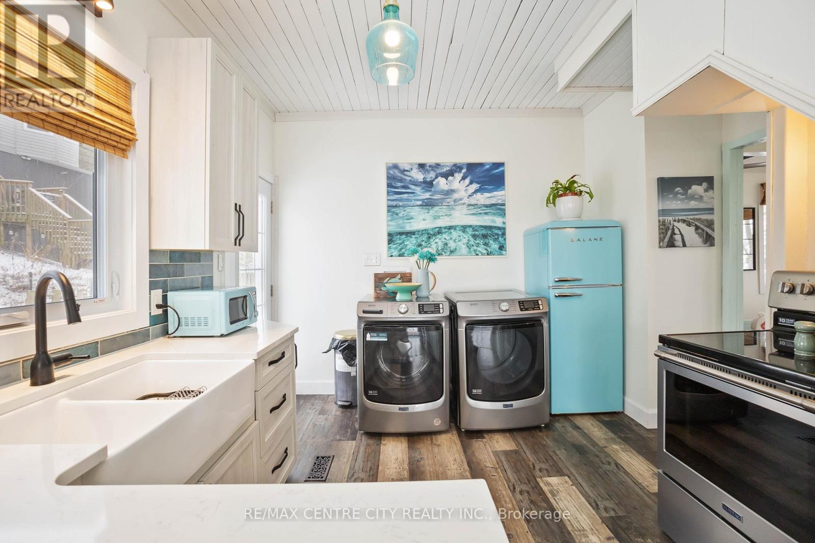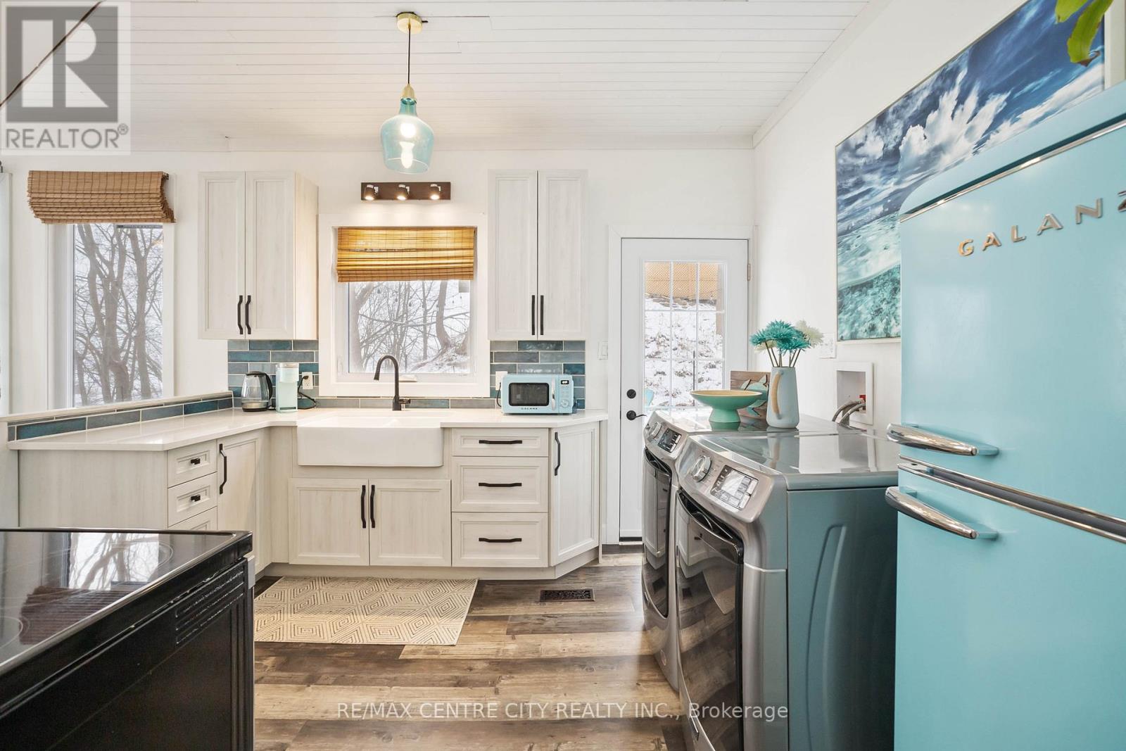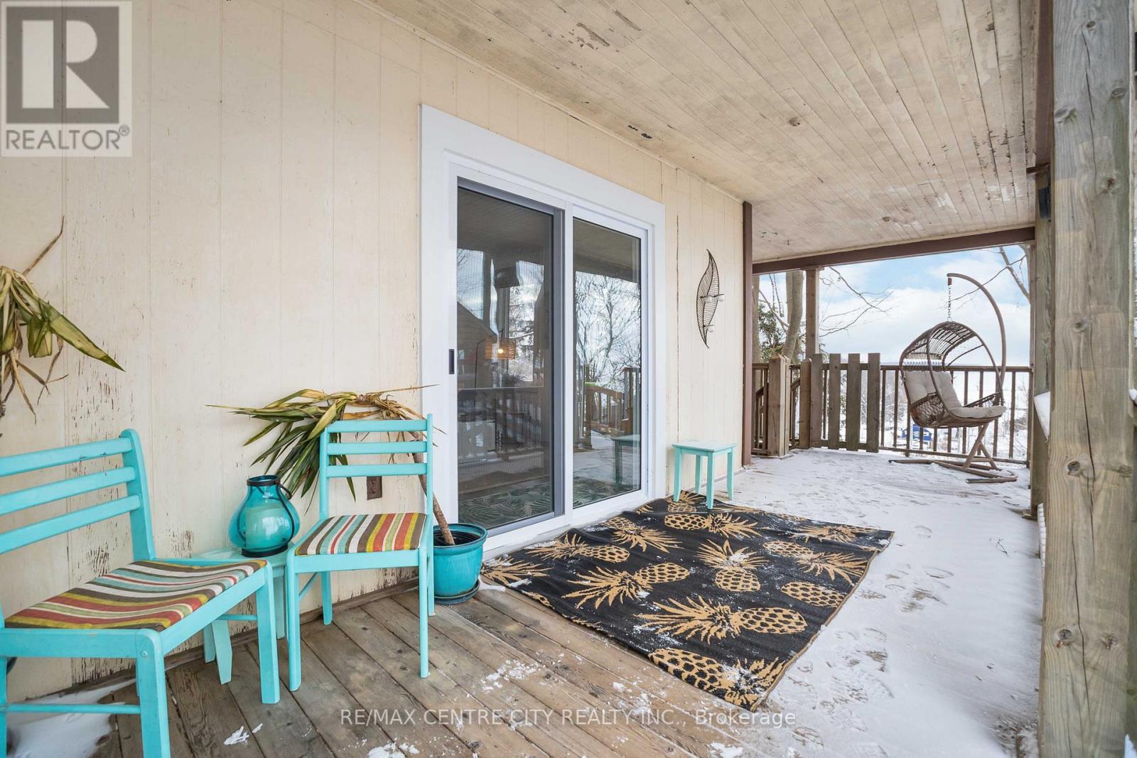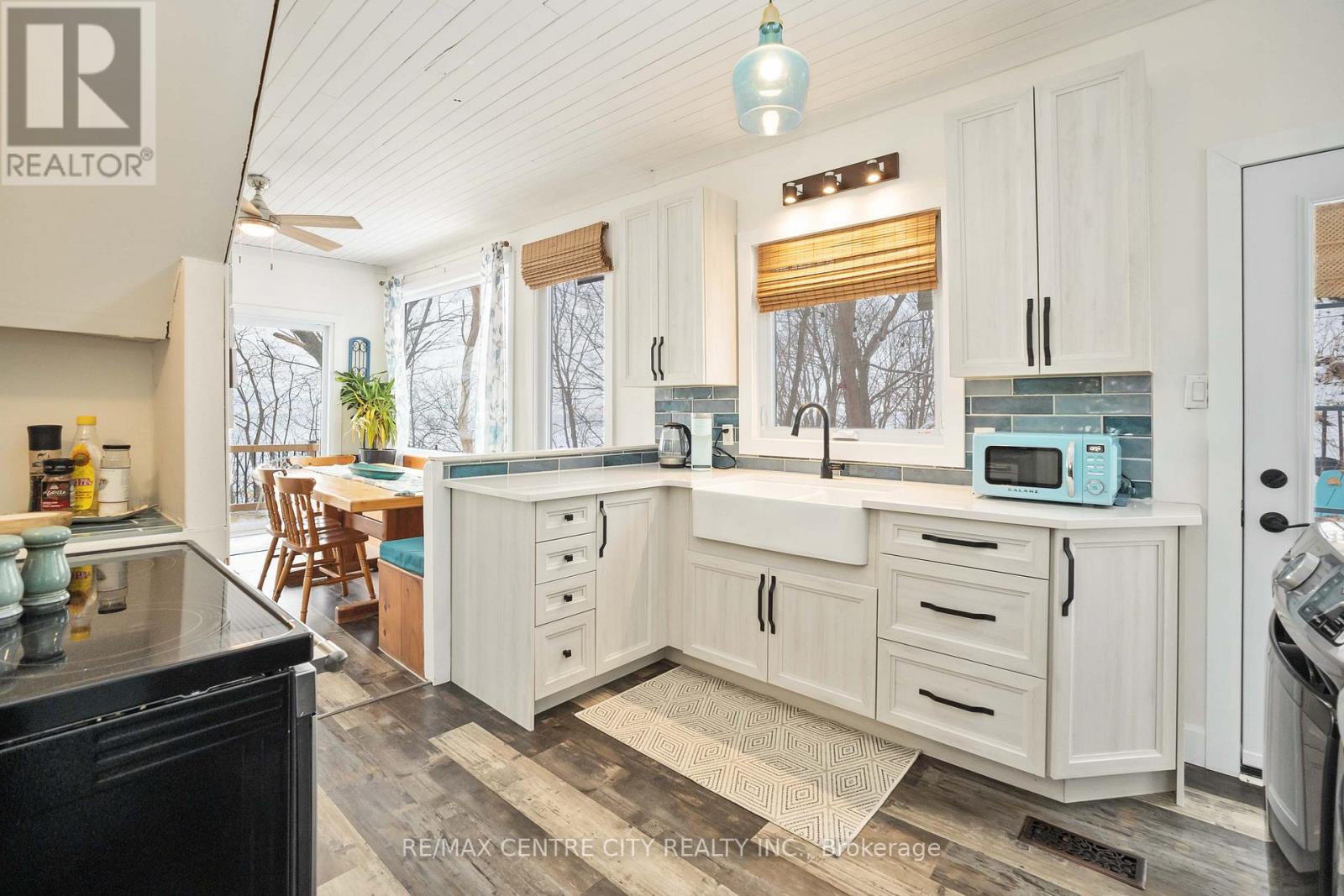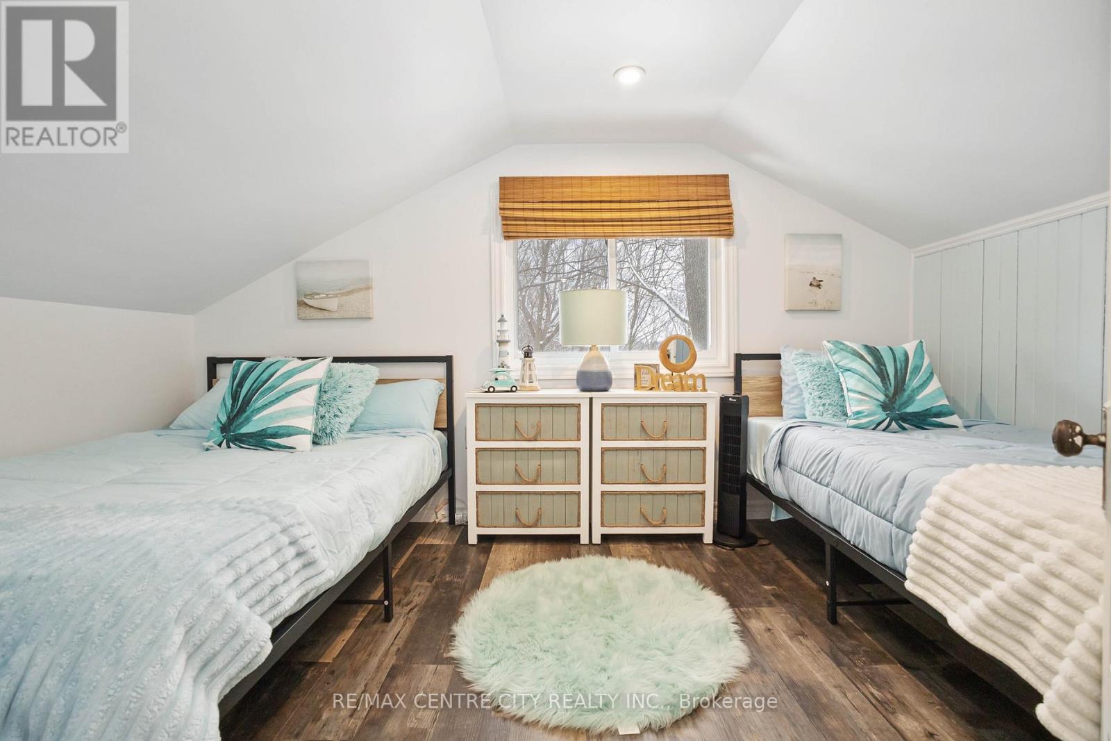 The quaint beach community of Port Stanley offers the unique opportunity for your very own treetop oasis! This one-of-a-kind destination is appealing to those seeking a short-term getaway or family destination, merely steps from the beach & beautiful shores of Lake Erie. This high demand, income generating property with proven success & approximately 50K of annual revenue provides the best of BOTH worlds for those eager to acquire a vacation home while maintaining the opportunity to generate rental income when not occupied for yourself. Breathtaking, panoramic views of Main Beach to the South Little Beach to the East, this property will captivate each visitor. A peaceful retreat, perched amongst the trees, this slice of paradise includes bright, oversized windows overlooking a newly built deck where you'll experience the soundtrack of waves & spectacular water vistas. Plenty of seating in the dining area ensures a crowd can be hosted with ease. A functional kitchen includes fully updated finishes with chic new cabinetry, stylish new appliances, laundry & access to side yard. Generous living room includes three large patio sliders with gorgeous views of the lake & cozy wood burning fireplace. Primary bedroom includes multiple bright windows & private ensuite with free standing tub. Head upstairs to discover two additional bedrooms as well as updated 3PC shower. Significant renovations completed including updated Northstar windows, luxury vinyl plank flooring, drywall, paint, metal roof, deck & AC. Lower level is ready for your finishing touches, currently roughed in with electrical & plumbing to complete a self-contained studio apartment or added living space. Deeded parking (located on Sydenham) includes space for two vehicles as well as storage shed, just steps away. A short walk brings you to the beach as well as many of Port Stanley's amazing restaurants & amenities. Truly a destination to appreciate with great appeal to enjoy as an income generating retreat! (id:64974)