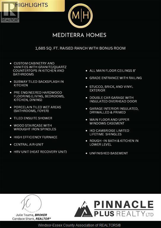 FOR A LIMITED TIME - INTRODUCTORY PRICING!! Welcome to Mayrand Street in the new Villa Oaks Estates Subdivision! The 'Terra' model is a spacious Raised Ranch semi-detached home with bonus room and attached double garage features 3 Bedrooms & 2 Bathrooms in a quiet neighbourhood just minutes from many amenities. Step inside to the bright, welcoming space with hardwood floors in the kitchen and all living areas and tile flooring in the foyer and baths. The open floor plan seamlessly connects the living room to the dining area and kitchen, making it ideal for entertaining and family gatherings. The kitchen’s functional layout features plenty of cabinet space, island and solid countertops. The upper level features a large primary bedroom with 3-piece ensuite and walk-in closet- a private oasis! The unfinished basement features a grade entrance, rough-in bath and rough-in kitchen. Located in a desirable LaSalle neighborhood with easy access to local schools, shopping, and major highways. (id:64974)